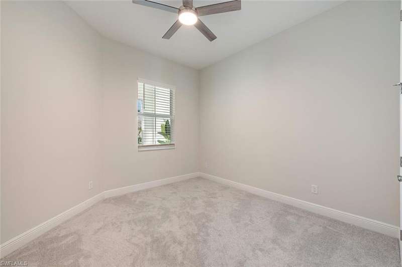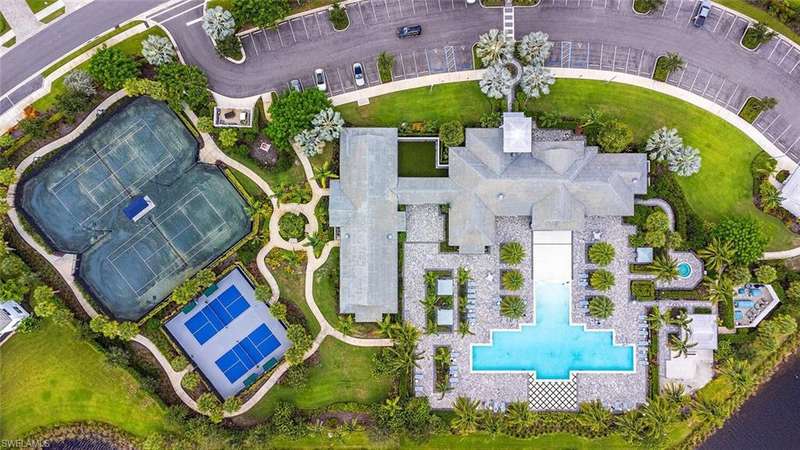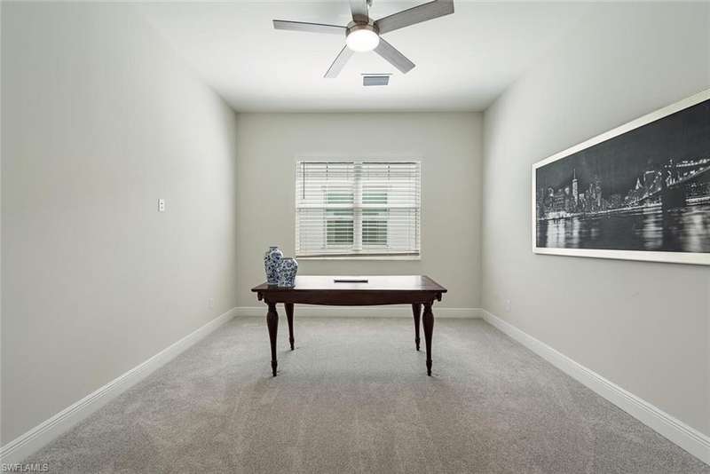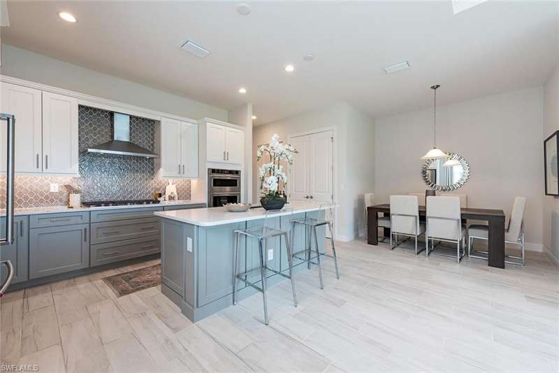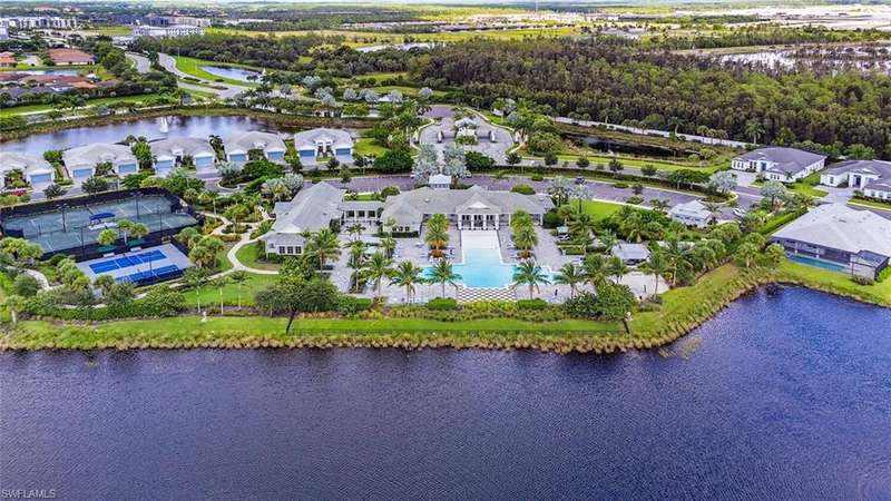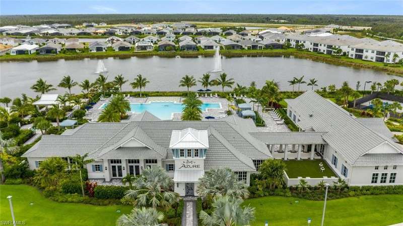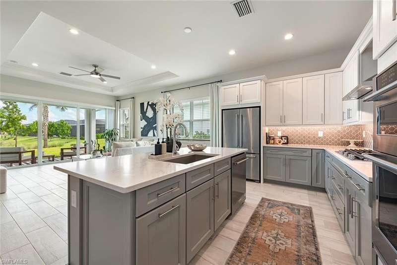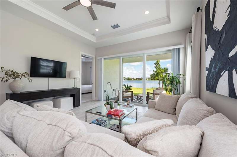 Step into contemporary elegance with this newly built Baypointe villa offering glimmering lake views and brimming with over $100,000 in luxurious upgrades inside and out, in the picturesque community of Azure at Hacienda Lakes by Toll Brothers. This turnkey furnished home is a true sanctuary of modern living, designed with an open-concept layout featuring 10 to 10 6 ceilings and impact glass windows and doors. The gourmet kitchen features high-end appliances, an eye-catching glass tile backsplash, a natural gas cooktop, a large island, ample cabinetry, and a pantry. Features include upgraded tile flooring in the main living areas, tray ceilings with crown molding, 8 tall solid doors, a tankless hot water heater and epoxy garage floors. This villa includes a versatile den that can easily be transformed into a 3rd bedroom. The primary suite boasts a large walk-in closet, a walk-in shower with frameless glass door entry, and dual sinks. The covered lanai prepped for an outdoor kitchen