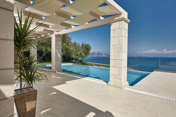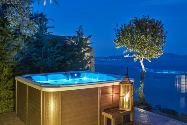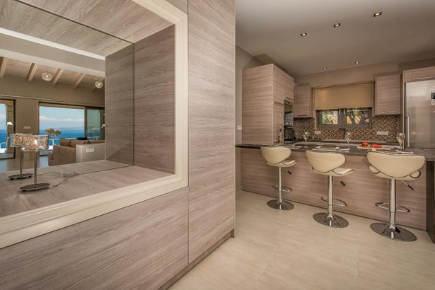 Located at the top of a hill, the villa is built sparing no luxury. On the outside, the private pool is surrounded by a lush garden looking out to a magnificent view of the Ionian Sea and the isle of Marathonisi.