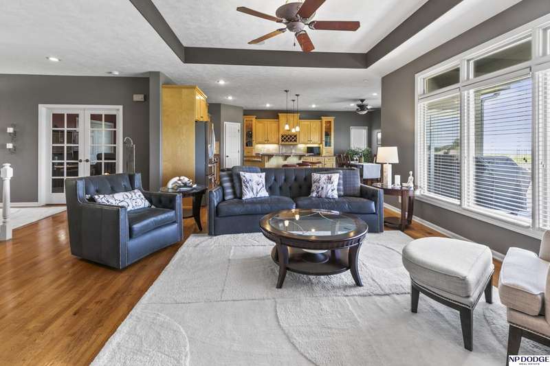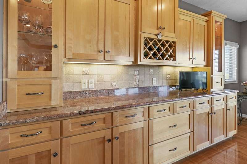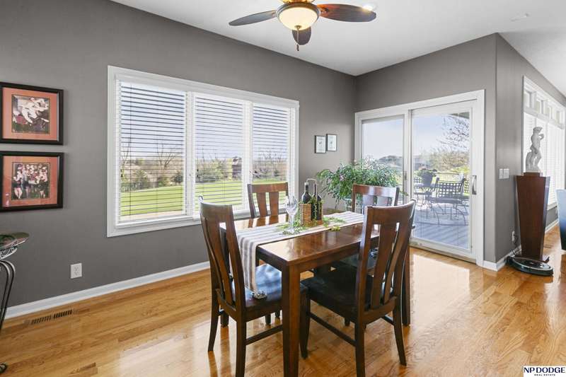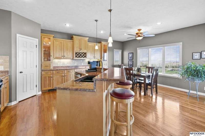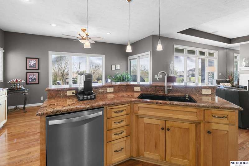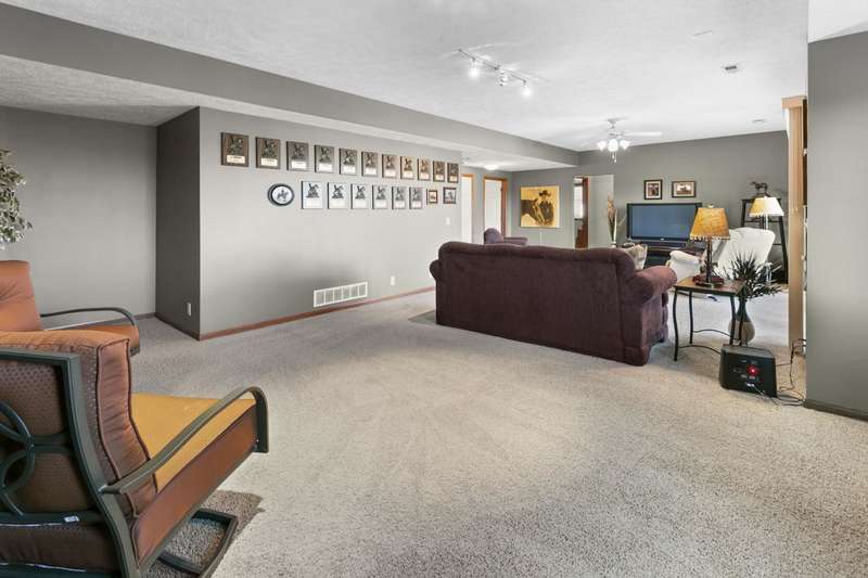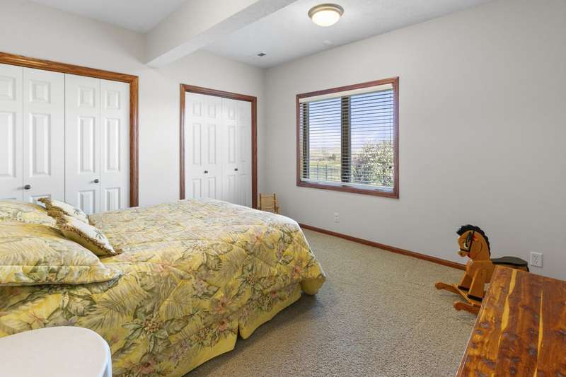 Gorgeous Brick Ranch home walks out to Iron Horse Golf Course. Amazing Views! Custom built, 1 homeowner w/over 3400 fsf. Walk in to beautiful entryway, open to FR w/wall of windows, tiled gas fp, tiled ceiling, beautiful wd flrs & built-ins. Impressive kitchen has custom birch cabinets, granite counters, tiled bksp, center island, w/i pantry, newer ss appl, wood flrs & spacious dining area w/tons of windows. Spacious primary bdroom w/lovely views, tiered ceiling, w/i closet, private ba w/whirlpool tub, dble sinks & w/i shower. Main flr includes: 2nd bdroom, office w/french doors, laundry rm w/sink. Fully finished w/o bsmt w/ daylight windows, massive FR, tons of storage, large cedar closet, 2 bdrooms w/ daylight windows & 3rd full bth w/dble sinks. New composite deck (2022) w/views for 15 miles. Oversized 3-car garage w/ epoxy flrs, sink & built-in shelves. Meticulously maintained yard w/beautiful landscaping, sprinkler system & invisible fence. New Roof (2020)