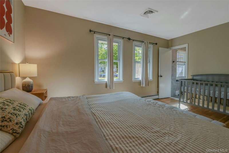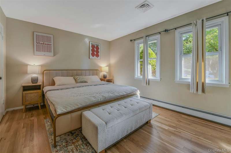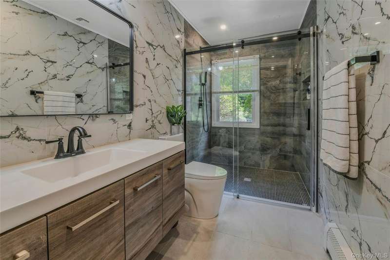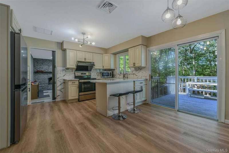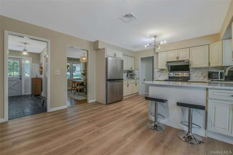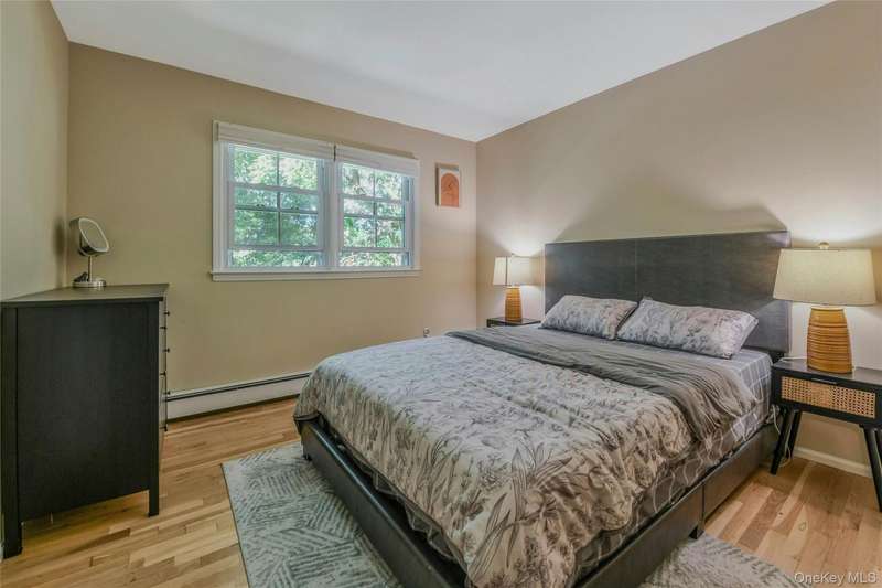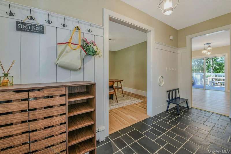 Welcome to this beautifully maintained 4-bedroom, 2-bath ranch nestled on a private 0.57-acre lot in a peaceful cul-de-sac. Conveniently located near Stony Brook University and Hospital, LIRR, local beaches, a variety of restaurants, supermarkets, and the Port Jefferson Ferry to Connecticut.This cozy ranch designed for comfort and sustainability, this home features owned solar panels, a heat pump, and a smart thermostat, keeping monthly electric bills around $20. With excellent energy efficiency, one tank of oil (275 Gal.) lasts up to two years. Water filtration system is included for added convenience and healthier water. The primary bedroom offers a full en-suite bathroom. kitchen and bathrooms have all been updated, providing modern finishes throughout. Enjoy a cozy family room with a wood-burning fireplace, and a sliding door from the breakfast area that opens to a Perfect-sized deck for morning coffee or evening unwinding deck overlooking the Private backyard. Additional features include a 2-car garage, and a walk-out full basement with a dedicated storage and utilities area and a finished open space-ideal for gym, or recreation room.
