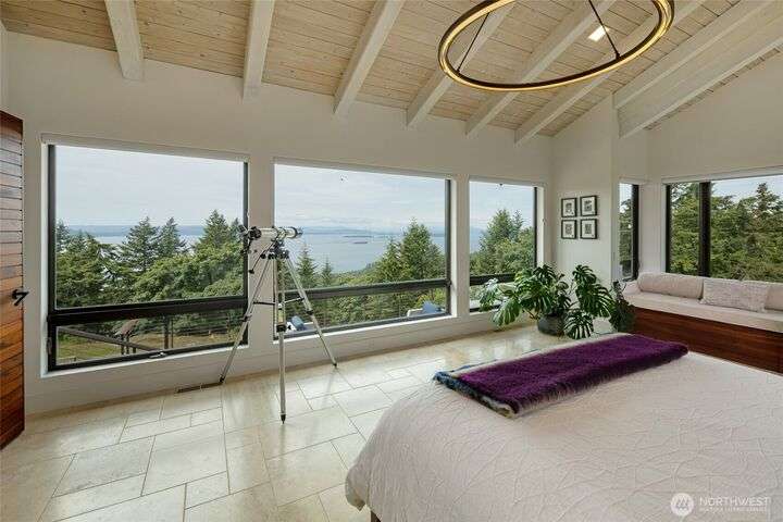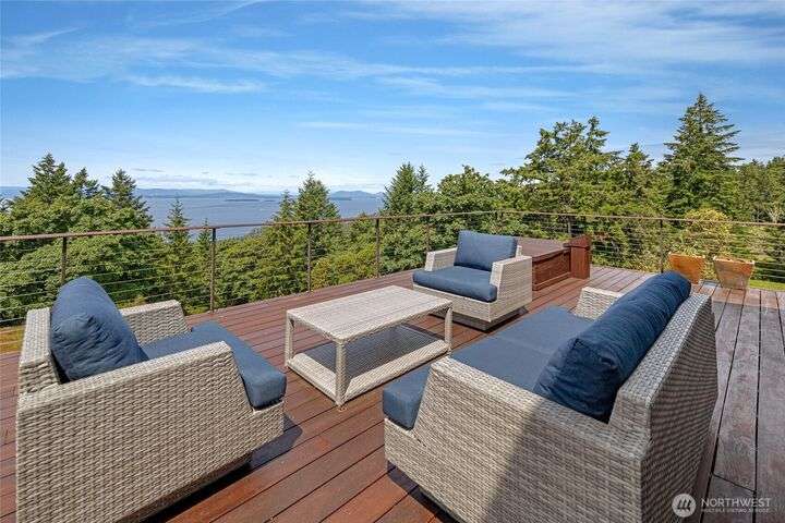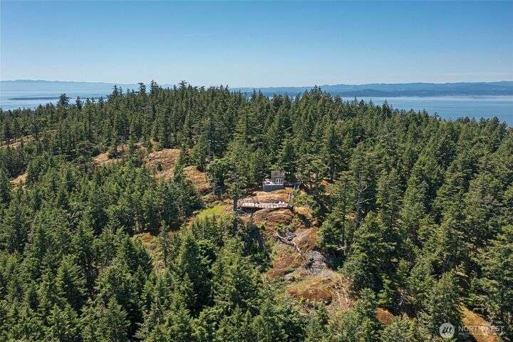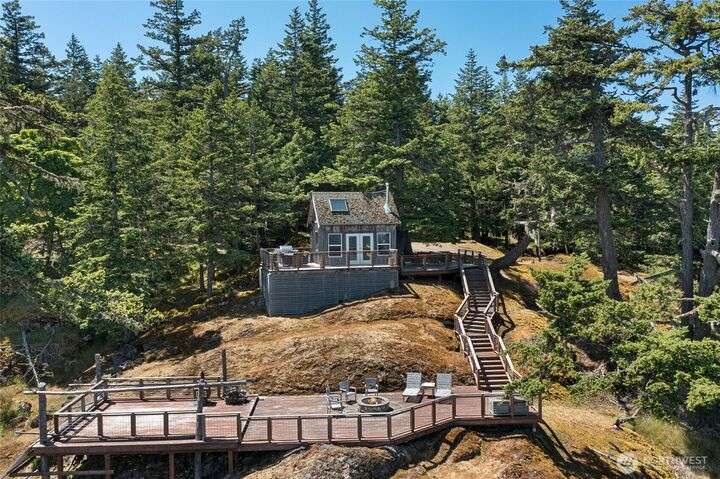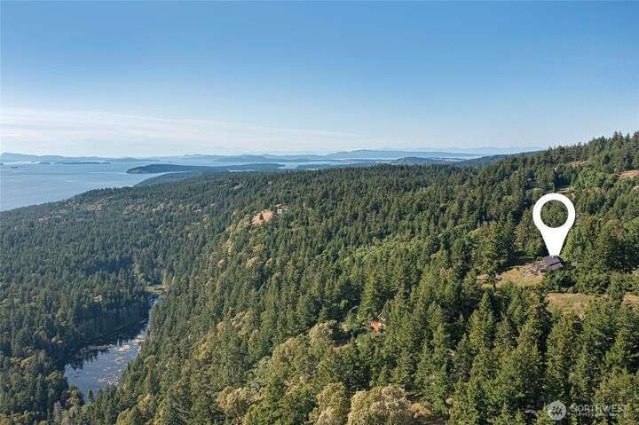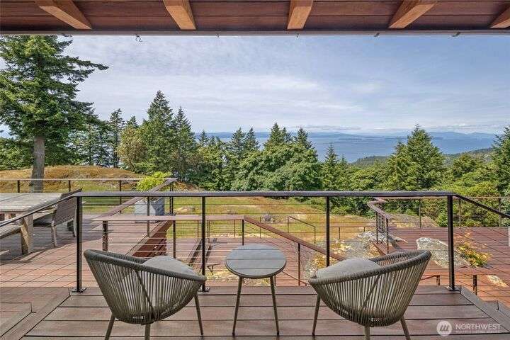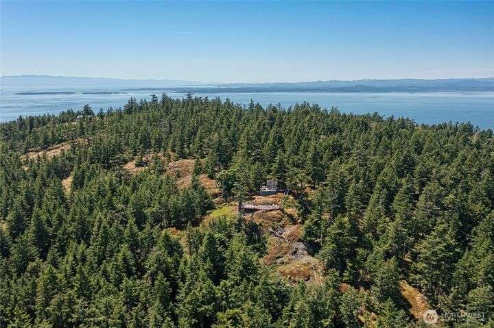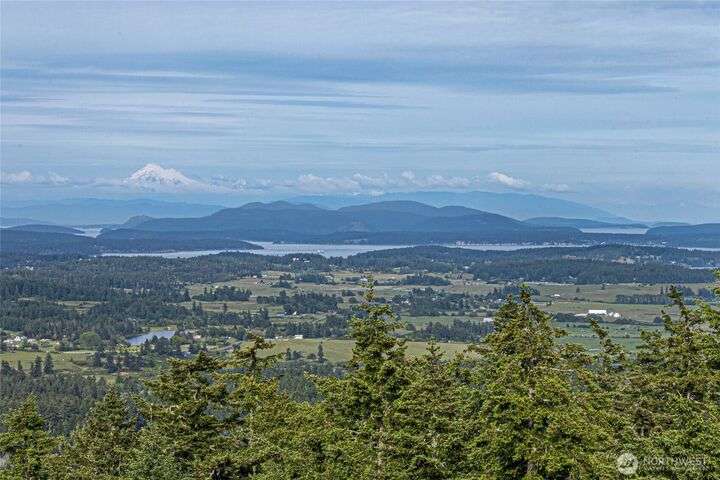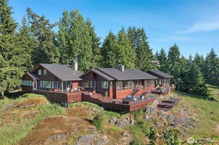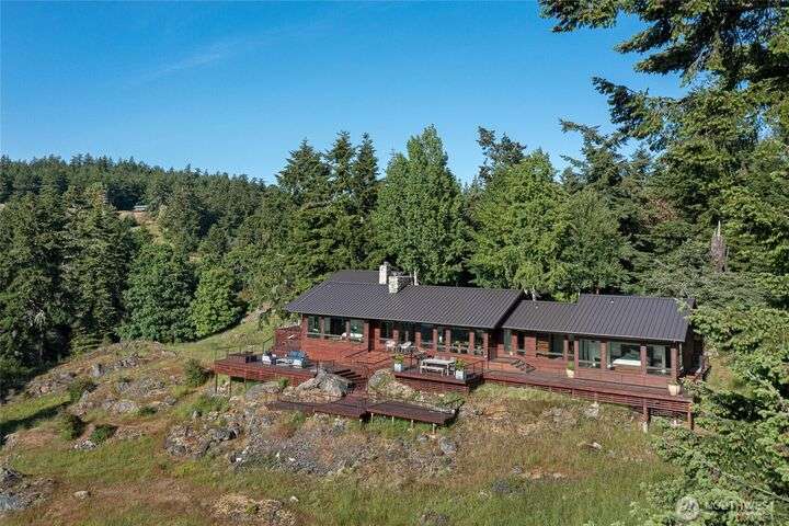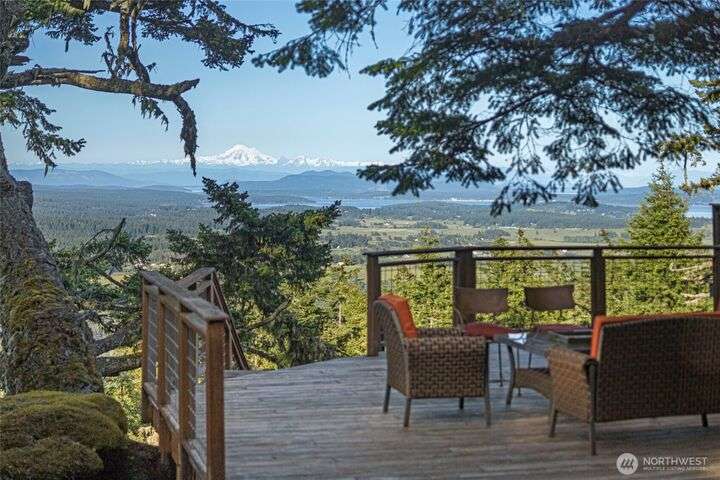 Commanding 360° views from its 22-acre perch atop Mt. Dallas, this extraordinary property spans 2 parcels and captures sweeping vistas from Haro Strait to Mt. Baker. The luxurious, tigerwood-clad main home features a grand living room with stone fireplace, chef’s kitchen with artisan cabinetry and high-end appliances, and 2 elegant water-view suites with spa-like baths. A separate guest suite with kitchen, woodstove, and steam shower offers ideal flexibility. A charming off-grid cabin adds rustic appeal with solar power, wood cook stove, and multi-level decks for dining, stargazing, or tent camping. With water storage, heat pump with AC, high-speed internet, and 2-car garage, this private, versatile retreat is the pinnacle of island living.