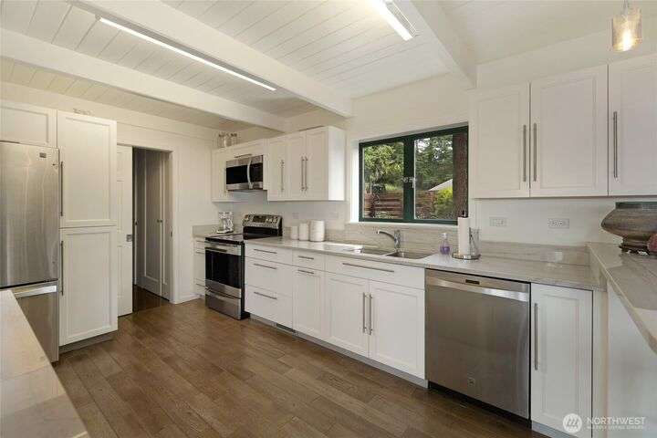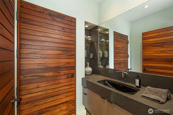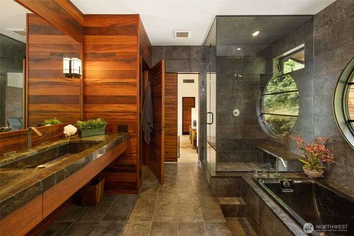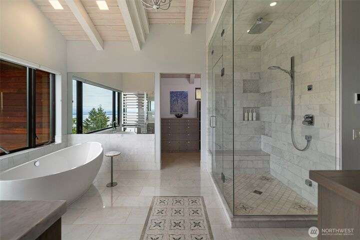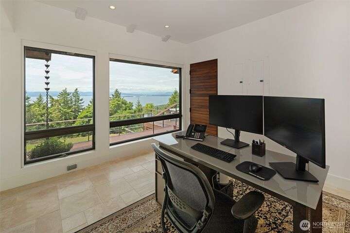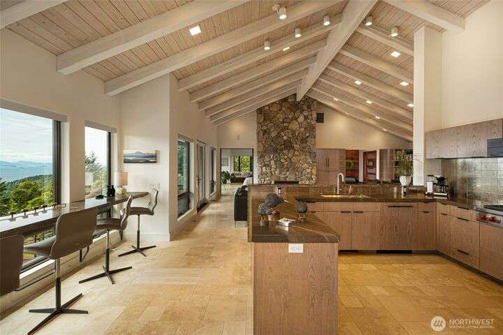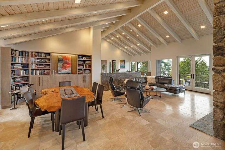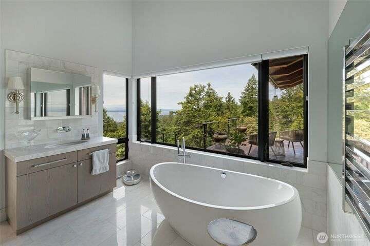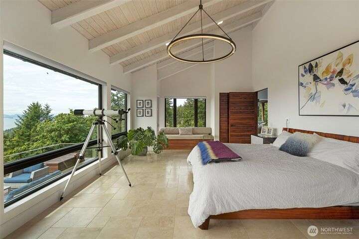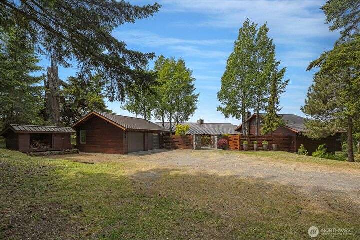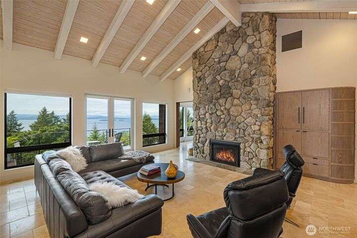 Commanding 360° views from its 22-acre perch atop Mt. Dallas, this extraordinary property spans 2 parcels and captures sweeping vistas from Haro Strait to Mt. Baker. The luxurious, tigerwood-clad main home features a grand living room with stone fireplace, chef’s kitchen with artisan cabinetry and high-end appliances, and 2 elegant water-view suites with spa-like baths. A separate guest suite with kitchen, woodstove, and steam shower offers ideal flexibility. A charming off-grid cabin adds rustic appeal with solar power, wood cook stove, and multi-level decks for dining, stargazing, or tent camping. With water storage, heat pump with AC, high-speed internet, and 2-car garage, this private, versatile retreat is the pinnacle of island living.