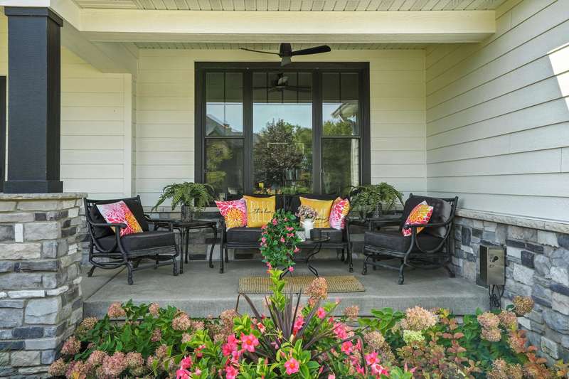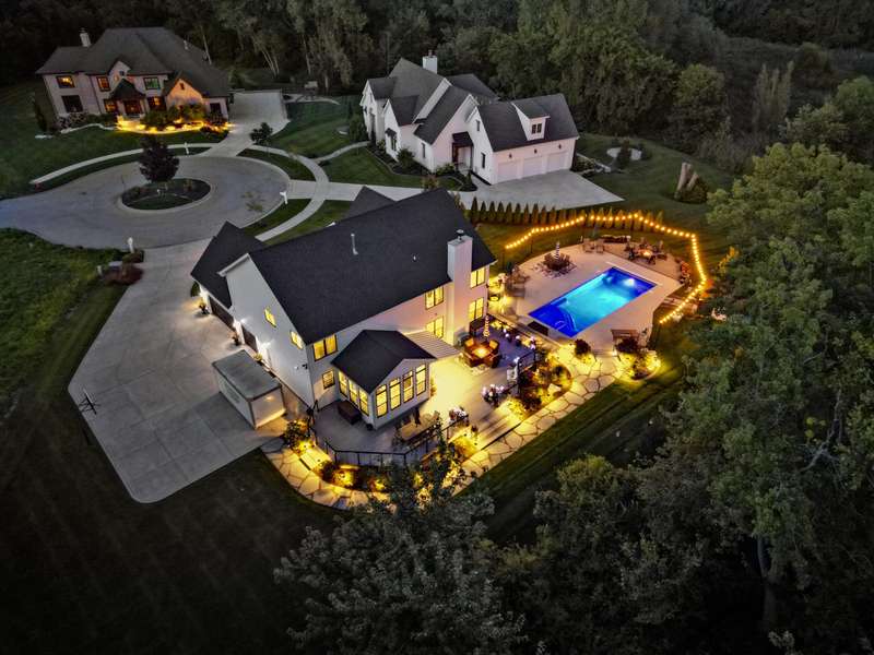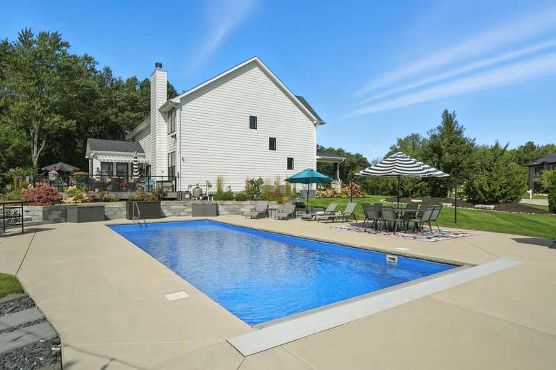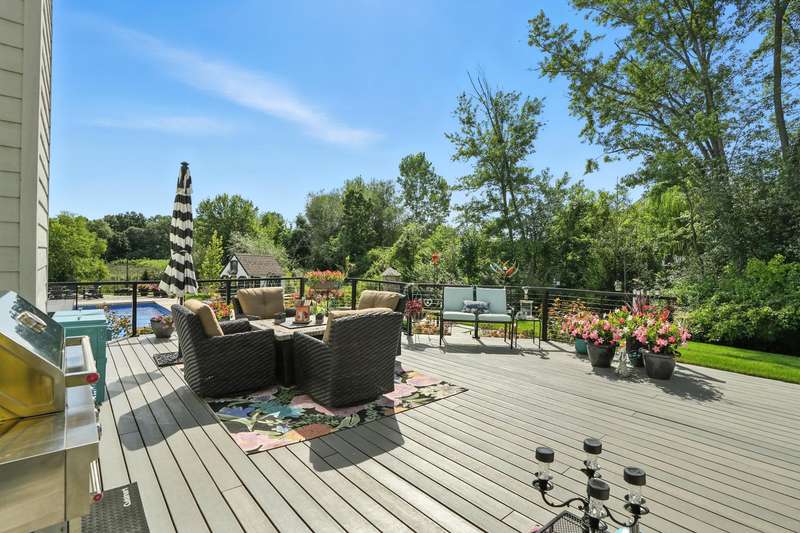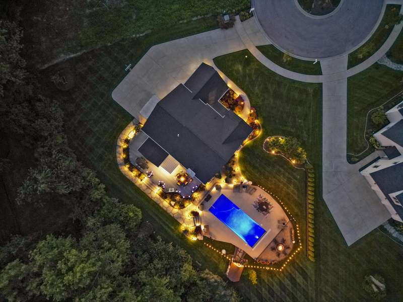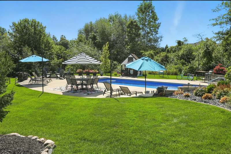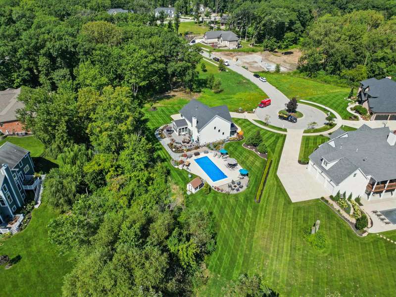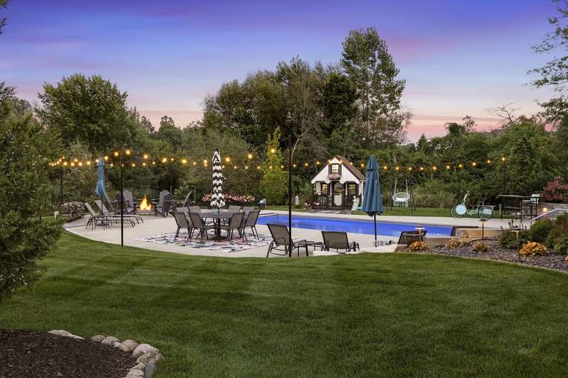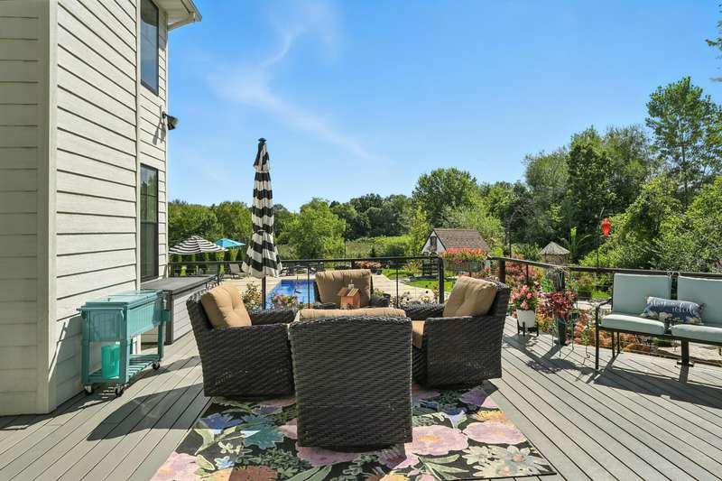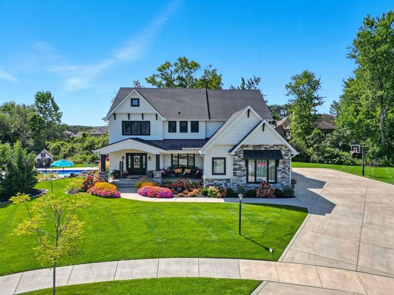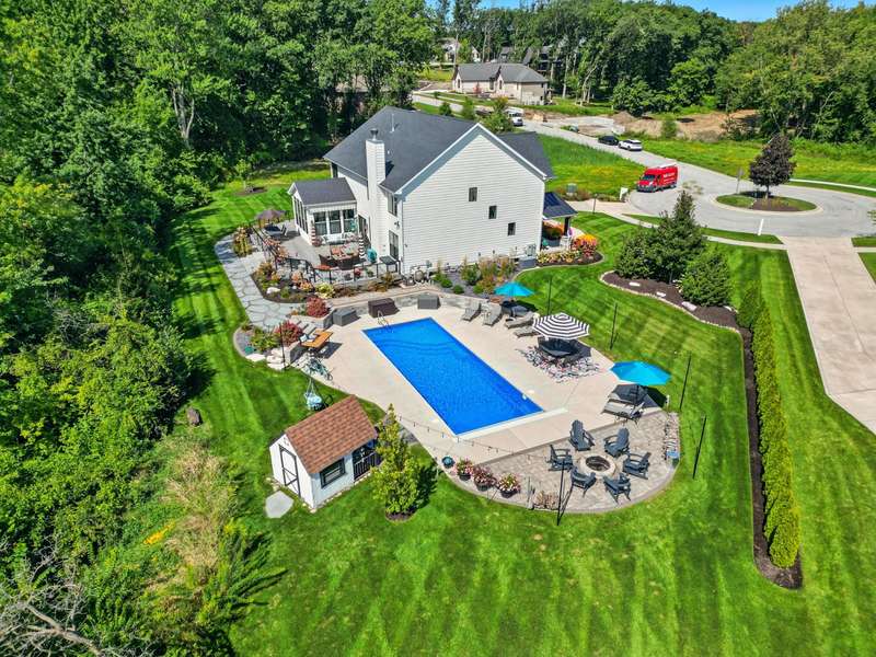 Welcome to this exquisite custom-built two-story home, perfectly situated on a serene .88-acre cul-de-sac lot, offering a peaceful and private wooded view that creates a tranquil atmosphere. As you approach the residence, you'll be greeted by a charming covered front porch, ideal for relaxing with a morning coffee or enjoying evening sunsets. Step inside to find an inviting foyer that seamlessly leads you into the great room, which features a stunning fireplace that adds warmth and ambiance, perfect for cozy evenings with family and friends. This space boasts a perfect blend of elegance and comfort. The open-concept kitchen is a culinary delight, featuring an oversized island that provides ample seating for gatherings, a spacious walk-in pantry, and a convenient mudroom. Sunlight floods the four-season room through an abundance of windows, creating a bright, airy space that's perfect for year-round enjoyment. The luxurious master suite is a true retreat, complete with an enormous walk-in closet, additional storage closets, and a spa-like master bathroom, ensuring your comfort and relaxation. The home also features three generously sized additional bedrooms and a well-appointed full bathroom, making it perfect for family living or entertaining guests. The main level is adorned with beautiful hardwood floors, adding warmth and sophistication. Step outside onto the expansive maintenance-free deck that wraps around the back of the home, complete with a powered awning to provide shade when desired, perfect for outdoor dining and entertaining. The professionally landscaped yard is nothing short of stunning, anchored by an inviting inground pool that serves as the focal point of the outdoor space. This backyard oasis features a cozy fire pit and a charming playhouse, coupled with ample grassy areas for hosting gatherings with friends and family. Unfinished basement is roughed in for future bath and finishing. 3.5 car garage is perfect for all your storage!