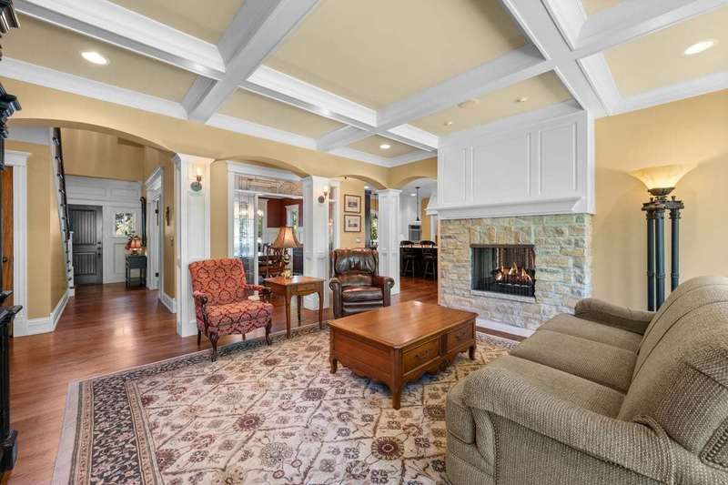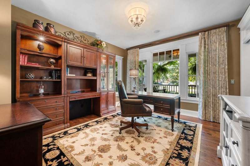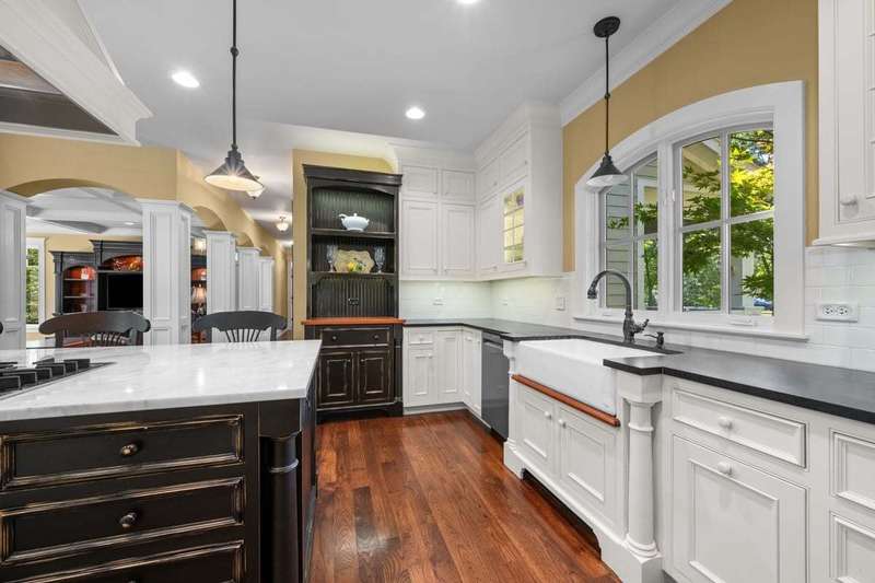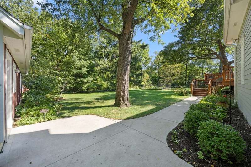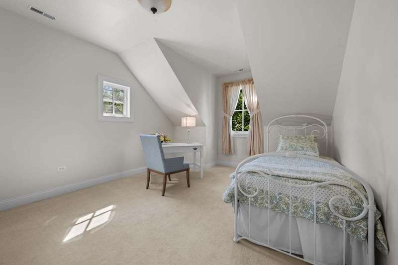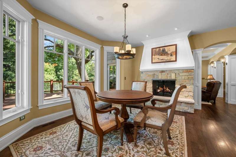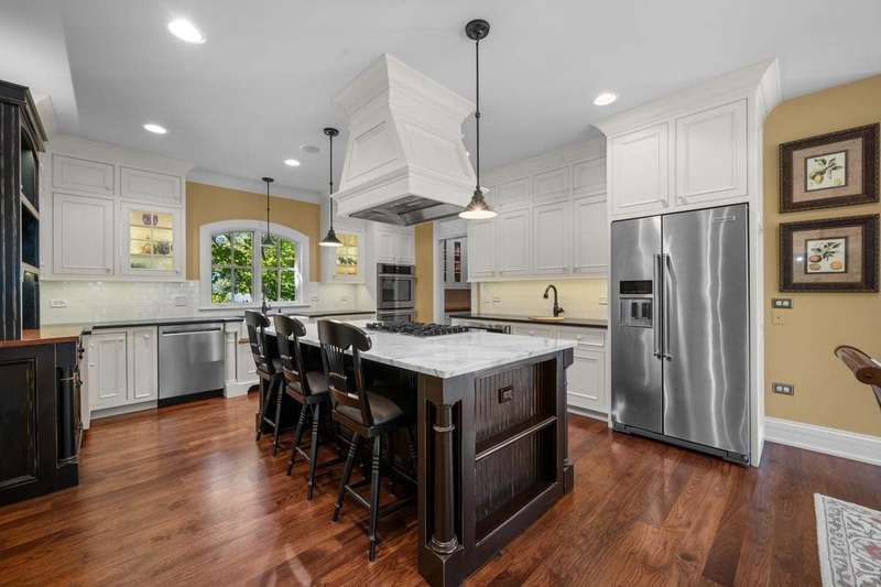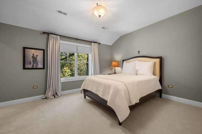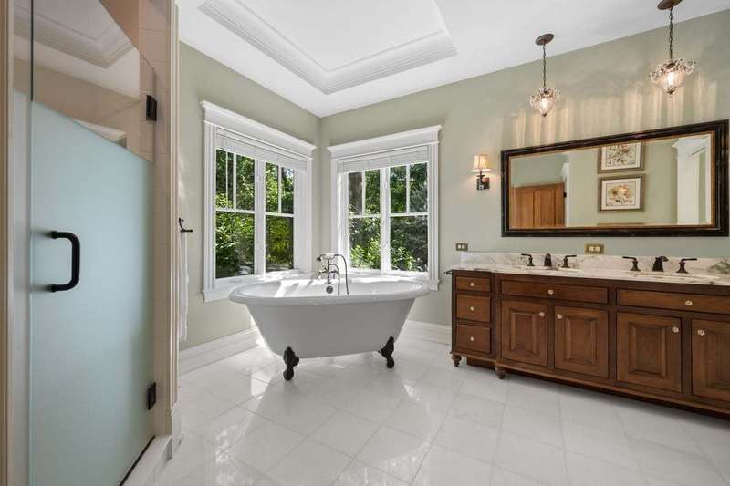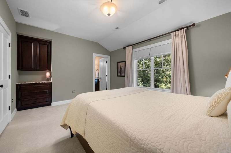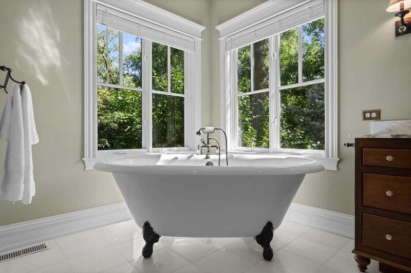 Nestled in the highly desirable Green Acres neighborhood of Naperville, this residence offers luxury living on a private .78-acre setting surrounded by mature trees. Less than a mile from downtown Naperville, this unincorporated enclave is known for its expansive lots and timeless character. The home showcases exceptional craftsmanship throughout, with custom millwork, detailed crown molding, cabinetry, and thoughtfully designed windows that fill the interiors with natural light. Hickory floors stained in a deep tone extend through the main level, stairway, and upstairs hall. The gourmet kitchen is a centerpiece, featuring honed black granite countertops, a 4' x 8' marble-topped island, and a porcelain farmhouse sink. High-end stainless steel appliances, including a gas cooktop, refrigerator, microwave, and dishwasher, complete the space. The kitchen opens into the breakfast room and living room, anchored by a two-sided fireplace. A formal dining room with French doors, leaded glass sidelights, and transom windows creates a welcoming space for gatherings, while the study at the front of the home offers a bright workspace with views of the landscaped grounds. The main-level primary suite includes a spa-like bath with a clawfoot soaking tub, dual sink vanity, and expansive glass-enclosed shower. A walk-in closet with a custom built-in system adds function and organization. Upstairs, three additional bedrooms and two full baths provide comfort and flexibility, while an unfinished space above the kitchen and garage presents the potential to create a second primary suite. The deep-pour, unfinished 9-foot basement with rough-in plumbing and large egress windows is ready for customization and features hydronic heating. A spacious laundry room adds convenience. Outside, a large deck overlooks the private, wooded yard. Car enthusiasts will appreciate the 4-car attached garage with epoxy floors and hydronic heating, as well as the outbuilding, which is prepped with two heating systems-radiant and forced heat-and finished with a wood ceiling. A Generac system provides reliable backup power. This home combines quality finishes, thoughtful design, and a prime location-offering the best of Naperville living in the exclusive Green Acres neighborhood.