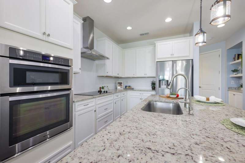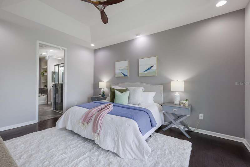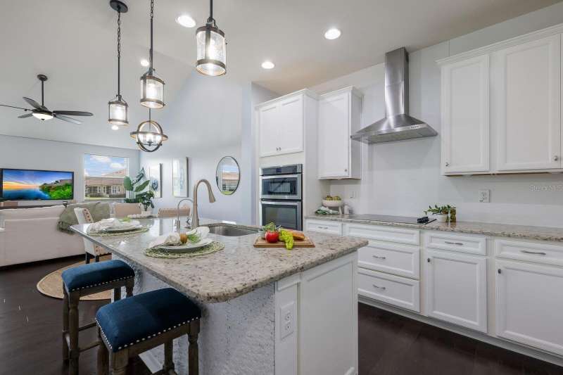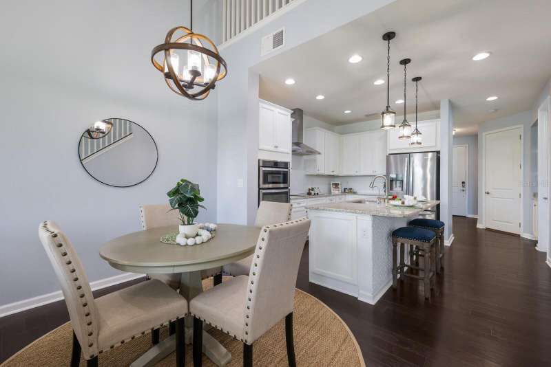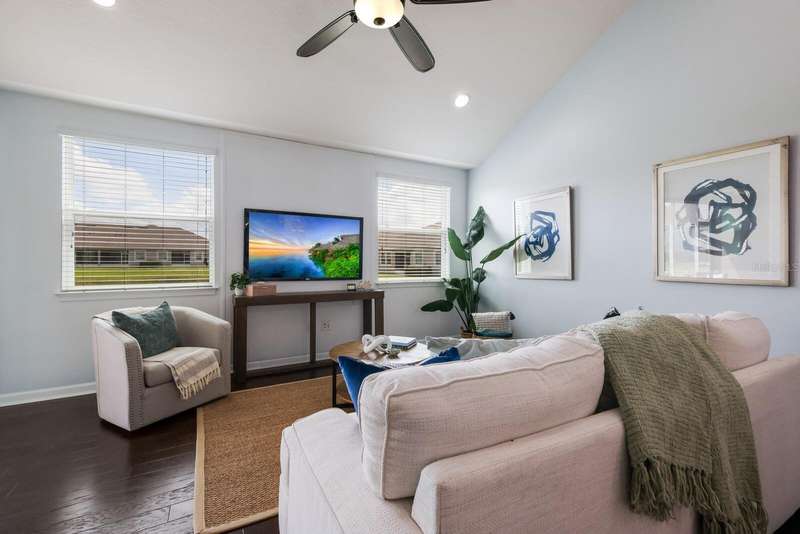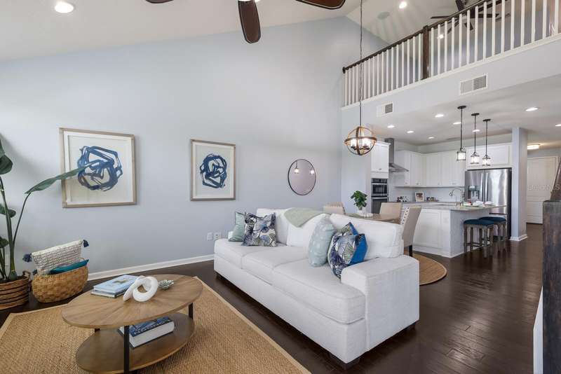 Under contract-accepting backup offers. Situated on an intimate street in Harmony at Lakewood Ranch, this stunning lakefront townhome has practically every upgrade available and then some. Built in 2018, the open 1,932 square foot plan features a light and bright great room plan adorned with wood floors & high ceilings plus an open loft area upstairs with unique extra bonus room area ideal for an office or just excess living space. The split 3-bedroom and 2.5 bath Sandbar model offers a main level owner's suite with wood floors, tray ceiling, extra recessed lighting, customized walk-in closet, and glass sliders to the screened lanai. The owner's bath features frameless glass shower enclosure, accent shower tile flooring, dual sink vanity, separate water closet and an oversized tub. Up the gorgeous wood stairway leads to the additional two guest bedrooms just off the second full bath, loft with speakers, and bonus room area. The gourmet kitchen below is open to the dining area and features a large island with quartz counters, white cabinetry, abundance of drawers, pull-out trash receptacle, walk-in pantry, built-in microwave and wall oven, separate cooktop and stainless steel appliances. A main level powder room, central vacuum, water filter system, a laundry room with storage cabinets, and a 2 car garage further sweeten this gem of a property. The community of Harmony at Lakewood Ranch has much to offer its residents with maintenance already included as part of the HOA fee, plus a resort-styled pool, fitness facility, clubhouse, playground, and access to the picturesque Lakewood Ranch trails.