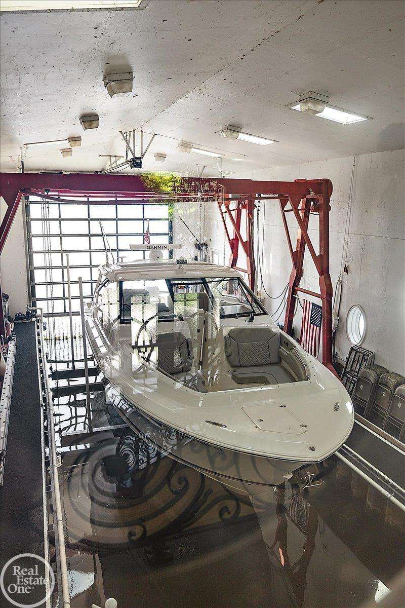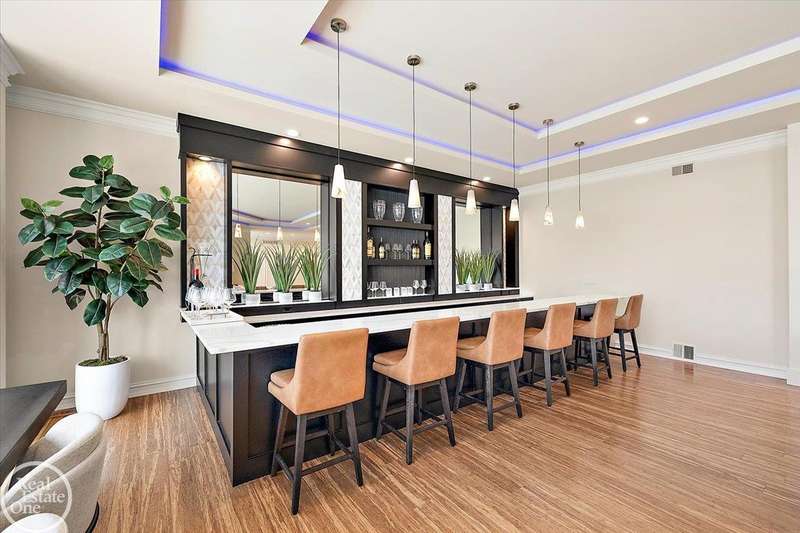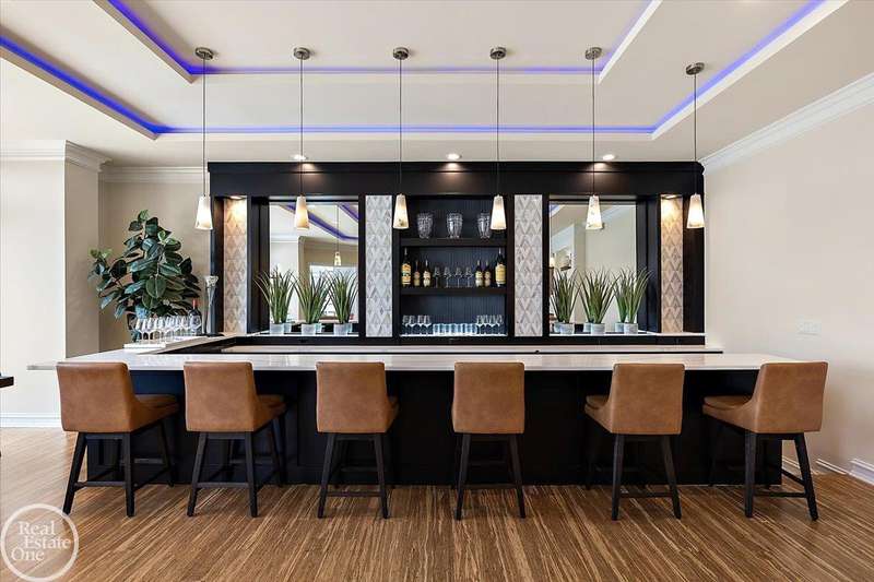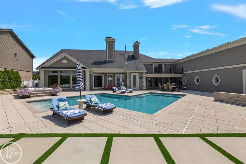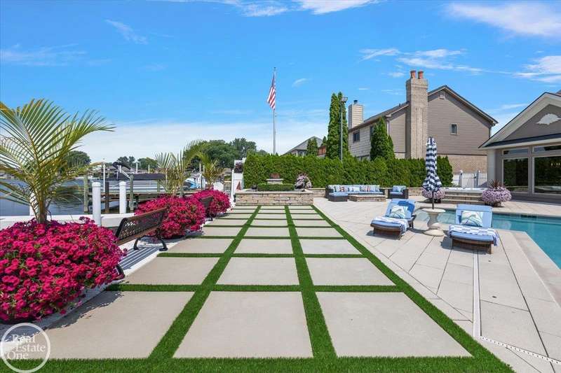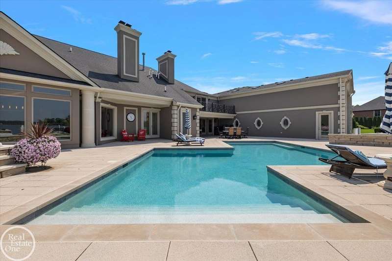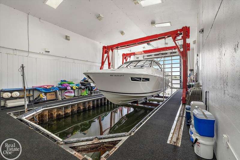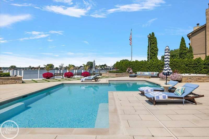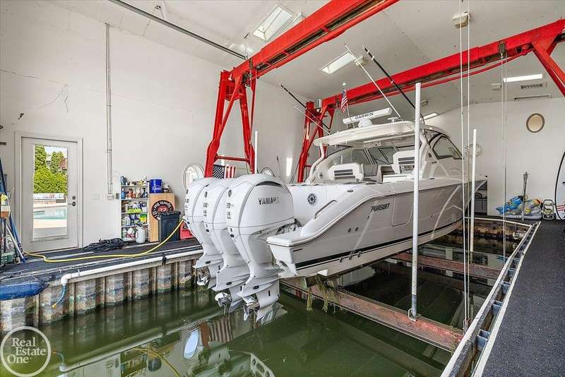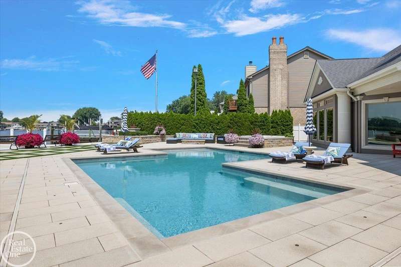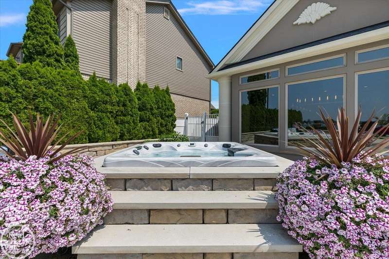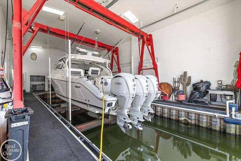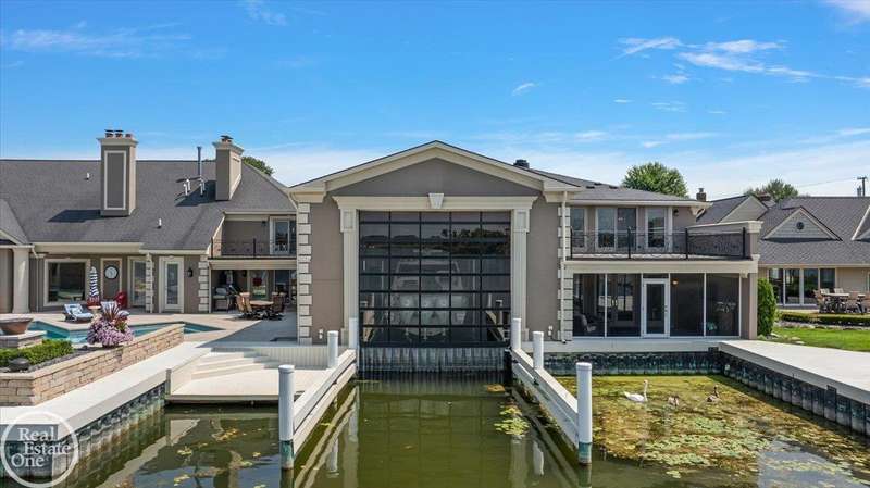 Experience this exceptional custom-built home situated on Black Creek Lagoon, featuring a 55-foot enclosed boat house and seven additional boat wells. This designer home showcases modern design trends and a fresh color palette. Enjoy a stunning built-in swimming pool, fire pit, and hot tub with picturesque views of Black Creek. The residence offers nearly 8,000 square feet of beautifully designed living space, highlighted by a grand two-story entrance foyer with a wrought iron staircase. The main level includes a luxurious owner's suite with a screened-in porch and an upscale bath. The expansive great room boasts a 40-foot wet bar and large windows that frame scenic water views. The gourmet kitchen features a spacious chef's island. The second floor provides an apartment-style suite complete with a full kitchen, bedroom, bath, and living room, perfect for in-law accommodations, along with three additional bedrooms with private baths. The property also includes a 3.5-car heated garage with ample guest parking. This home is ideal for boating enthusiasts and hosts, conveniently located just minutes from Lake St. Clair.