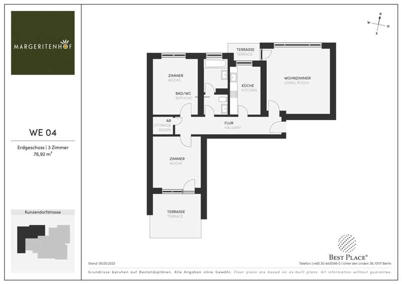 The practically designed 3-room flat with approx. 77 m² is located on the ground floor of the three-storey residential building. It has two terraces, one facing north and one facing south, as well as a private garden. The bathtub in the bathroom provides a wellness feeling and the separate WC ensures comfort. The storeroom offers storage space and room for household appliances, for example. This flat will also rent well in the future. Our modern Margeritenhof investment project offers investors practically designed, rented condominiums. The three-storey corner building was built in 1976 and has nine flats with two to three rooms and approx. 52 to 83 m². The Margeritenhof also has a beautiful communal garden with a barbecue area, screened by hedges. An underground car park beneath the building offers seven parking spaces.