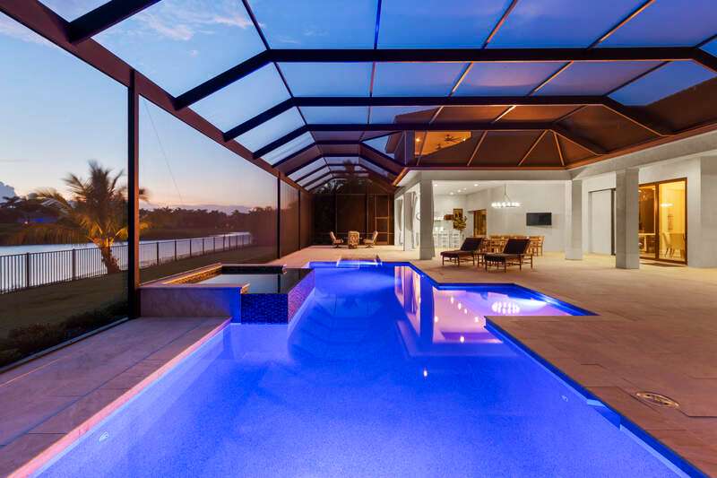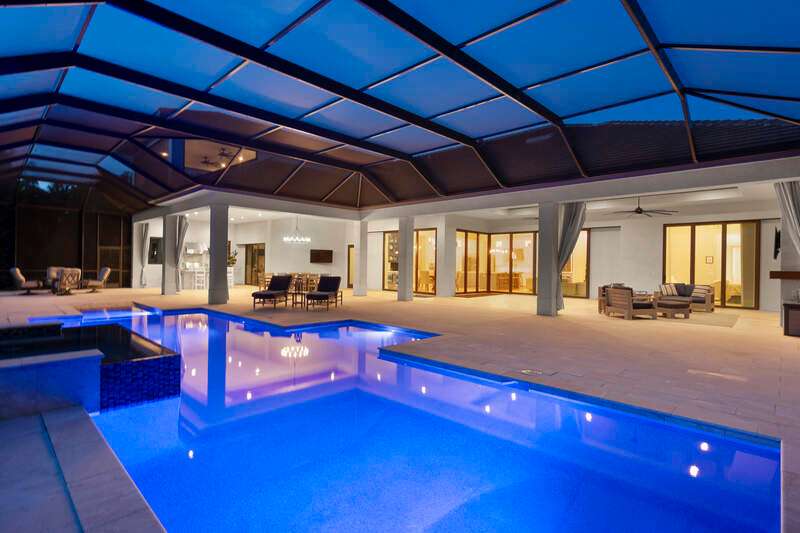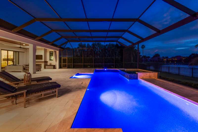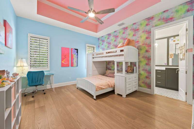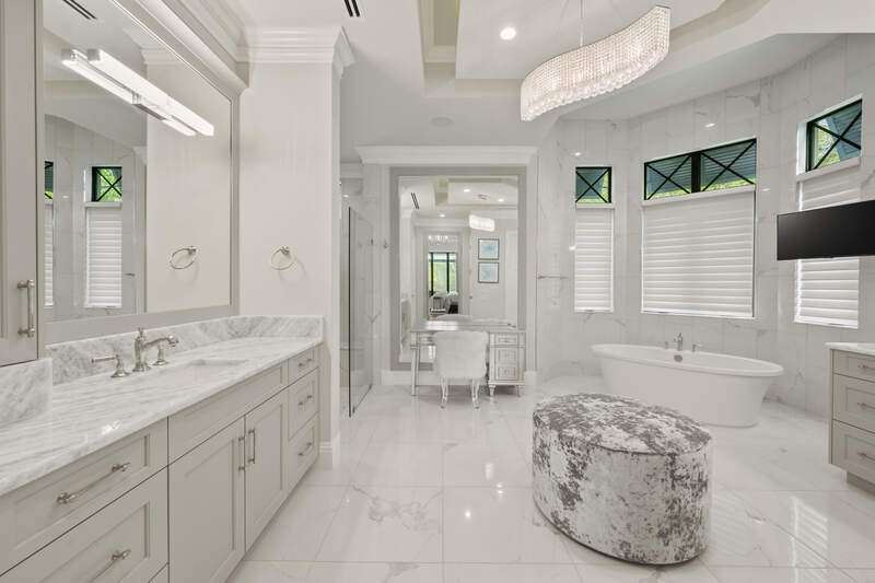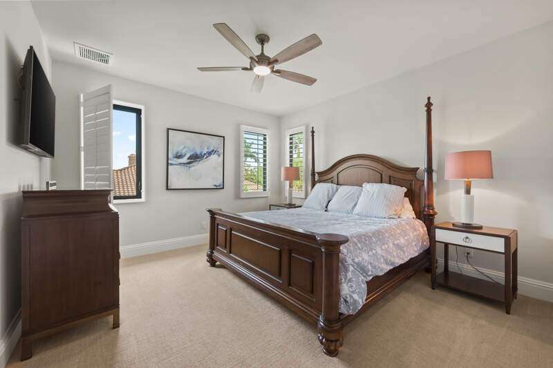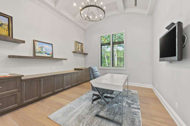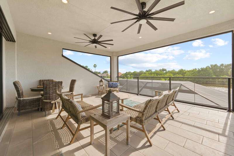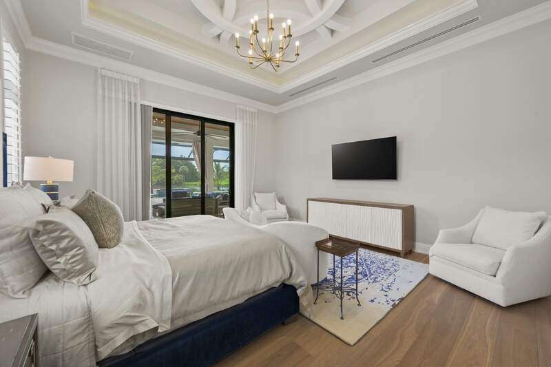 IMMEDIATE GOLF MEMBERSHIP AVAILABLE with this stunning custom home built by Florida Lifestyle. Elevated 16'1 feet above sea level and equipped with impact-resistant glass and a full-house generator, this home was meticulously designed for peace of mind and modern comfort. Every detail has been thoughtfully curated-from wide-plank Legno Bastone flooring to a 1,000-gallon propane tank, water filtration system, elevator, full security setup, and Sonos sound throughout. Beautifully furnished by Clive Daniel and Norris, this home is move-in ready for effortless Florida living. The chef's kitchen is an entertainer's dream, featuring dual porcelain islands, Thermador appliances, a wine refrigerator, and a spacious auto-lit walk-in pantry. A nearby bar area includes an additional wine fridge and seamlessly connects to the dining space for relaxed hosting.The luxurious primary suite offers a tranquil retreat with a custom ceiling accent, blackout shades, dual walk-in closets, and a spa-like bath with new shower heads and dual water closets. Two additional en-suite guest rooms are located on the main level in a split-bedroom layout, providing ultimate privacy.Take the elevator upstairs to a spacious fourth bedroom with double vanities and ample closet storage. This upper-level guest suite also features a lounge area, TV space, kitchenette, bar, and Sub-Zero wine cooler. The upstairs private screened lanai offers gorgeous golf views. On the main level, enjoy a generously sized laundry room with pull-out bins, extra cabinetry, a storage closet, and an additional refrigerator. The oversized four-car garage includes built-in storage, a refurbished four-seat "Hole In One" golf cart, and yet another refrigerator. For even more storage, a built-in mudroom with cubbies keeps everything organized. Entertain in style on the expansive lanai, featuring a beautiful wood ceiling, gas fireplace, covered lounging and dining areas, an air-conditioned pool bath, and a two-story panoramic cage. The fully equipped outdoor kitchen includes three TVs and custom drapes, creating an intimate yet chic setting for outdoor living. With western exposure and breathtaking water and golf course views, you'll enjoy glorious sunsets from the gas-heated saltwater pool and spa.This home truly has it all-style, functionality, and luxury-ready for you to enjoy the ultimate Florida lifestyle.