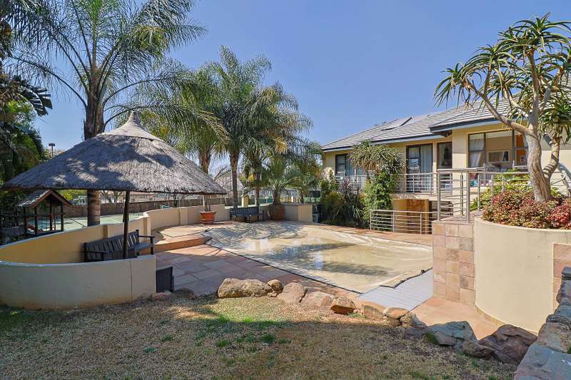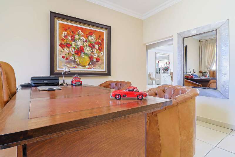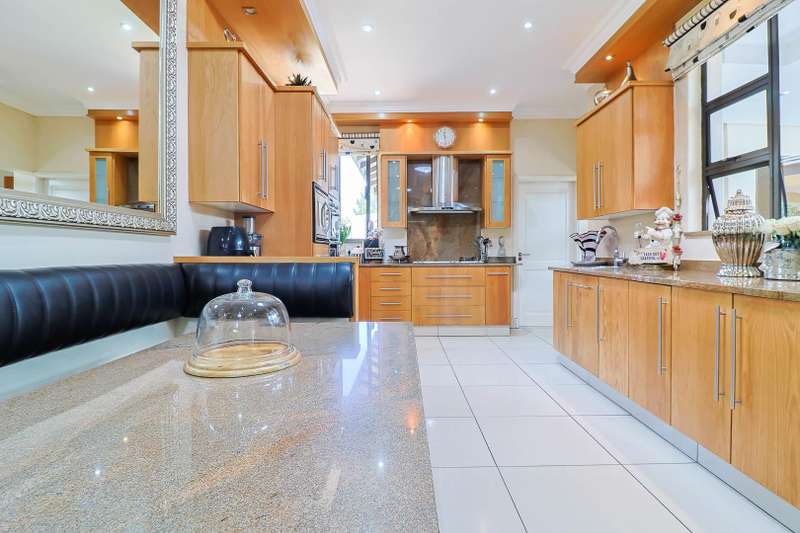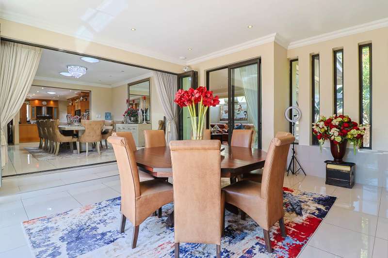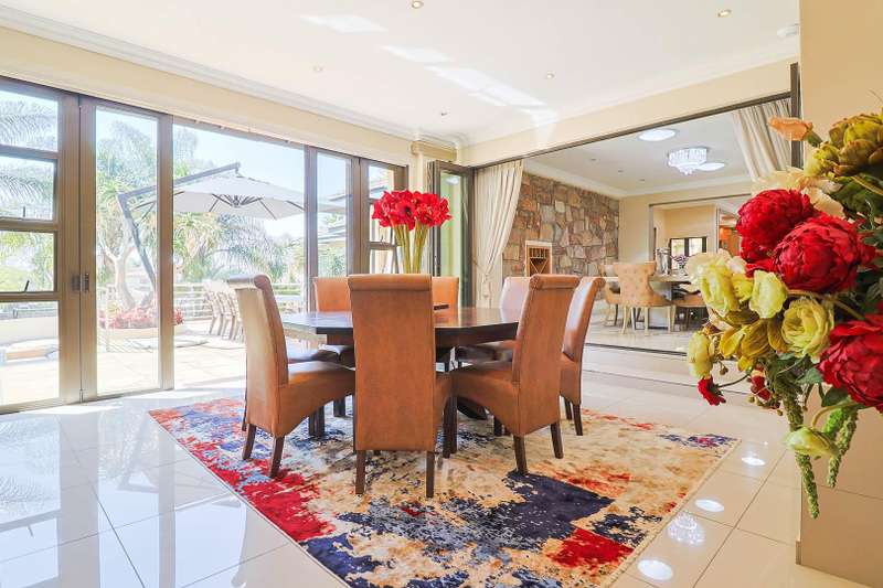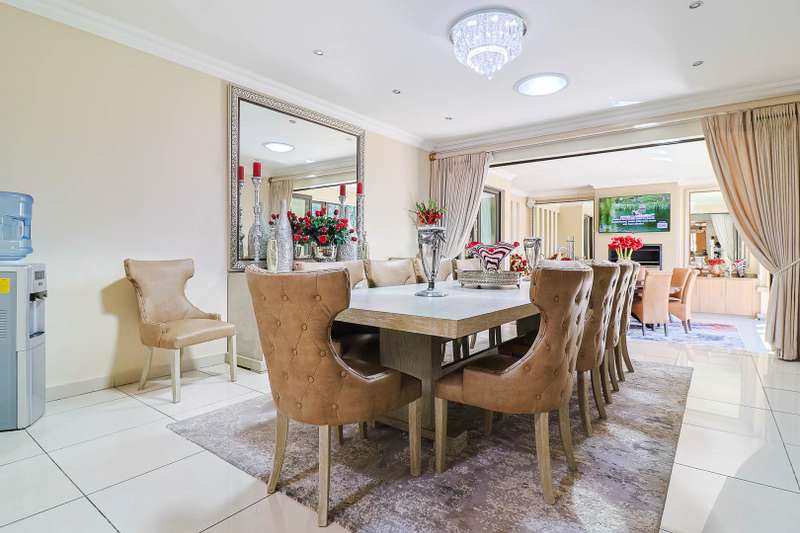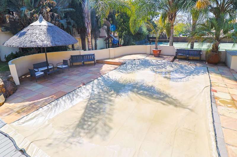 Rarely does a home of this calibre grace the market. Impeccably maintained and designed for refined living, this residence combines timeless elegance with modern sophistication to create a haven of comfort and style. Upon entering, a grand double-volume foyer adorned with stone cladding sets the tone for the home?ÇÖs impressive interiors. Expansive open-plan living spaces flow seamlessly throughout, offering the perfect balance between luxurious family living and elegant entertaining. The formal lounge, complete with air-conditioning and sleek flush-plastered ceilings, opens effortlessly to the dining area ?Çö a sophisticated setting for social gatherings. A separate TV lounge with a cozy fireplace extends to the covered patio, while two contemporary studies provide exceptional work-from-home versatility. An indoor entertainment room with built-in braai and prep bowl overlooks the manicured garden, ensuring effortless year-round hosting. The bespoke designer kitchen is a culinary masterpiece, featuring high-end appliances, an integrated breakfast nook, electric and gas cooktops, and a separate scullery and laundry. Accommodation comprises five beautifully appointed bedrooms, each with access to a private balcony. The luxurious master suite offers a walk-in dressing area and an elegant full en-suite bathroom. Additional bedrooms include two with en-suite bathrooms and a private guest suite. Outdoors, a sparkling heated swimming pool is complemented by a sprawling landscaped garden, complete with a jungle gym and trampoline ?Çö an idyllic playground for children. The lush surrounds feature a fully automated irrigation system and a stylish entertainment lapa. Additional Features: ?Çó Staff accommodation with private bathroom ?Çó 3x 500L JoJo water tanks with irrigation system ?Çó Generator and solar-heated geyser ?Çó Underfloor heating ?Çó Floodlit tennis court ?Çó 3-phase electricity ?Çó Garaging for up to 10 vehicles plus additional parking ?Çó Dedicated storeroom ?Çó High-speed WiFi ?Çó Exceptional estate security Set within the prestigious and secure Alberante Security Estate, this remarkable home offers the ultimate in family luxury, convenience, and peace of mind. A true gem for the discerning buyer seeking space, sophistication, and serenity.