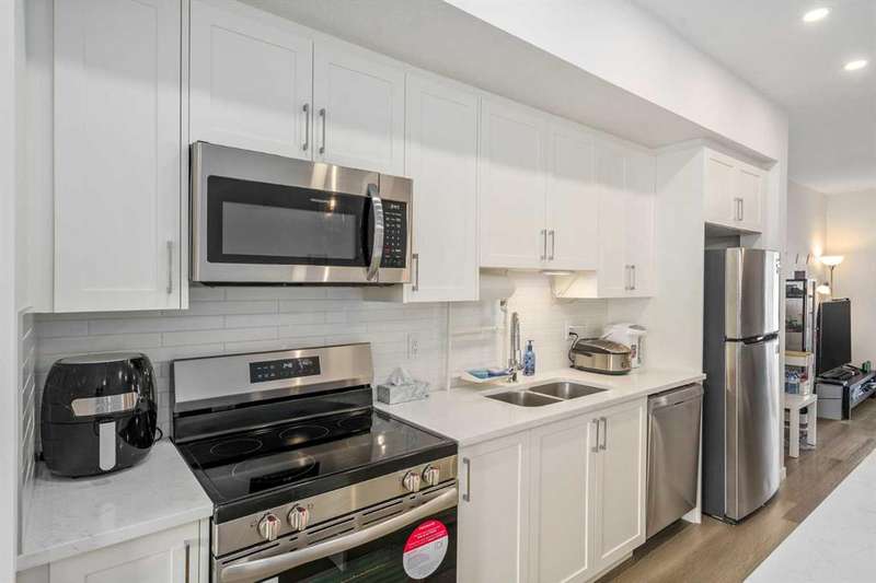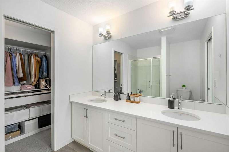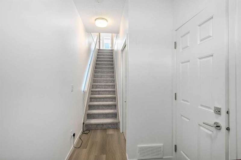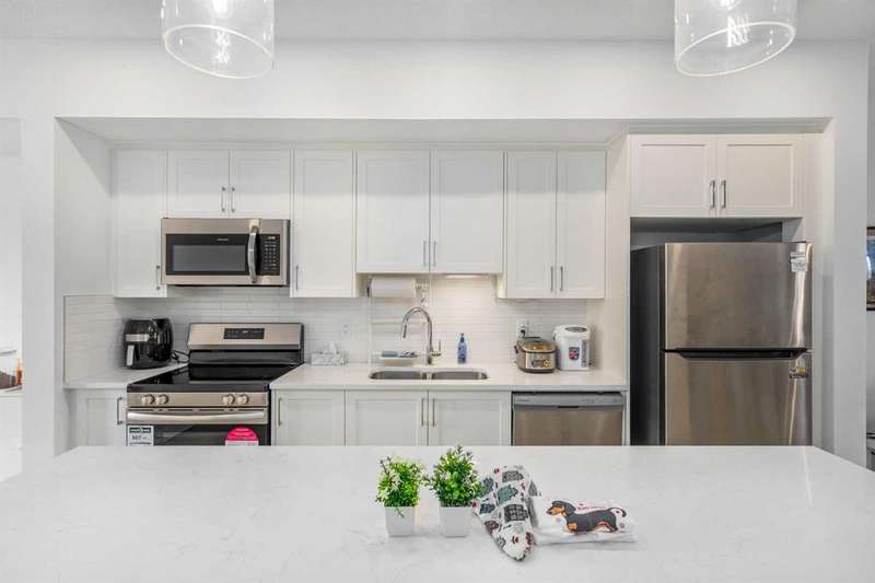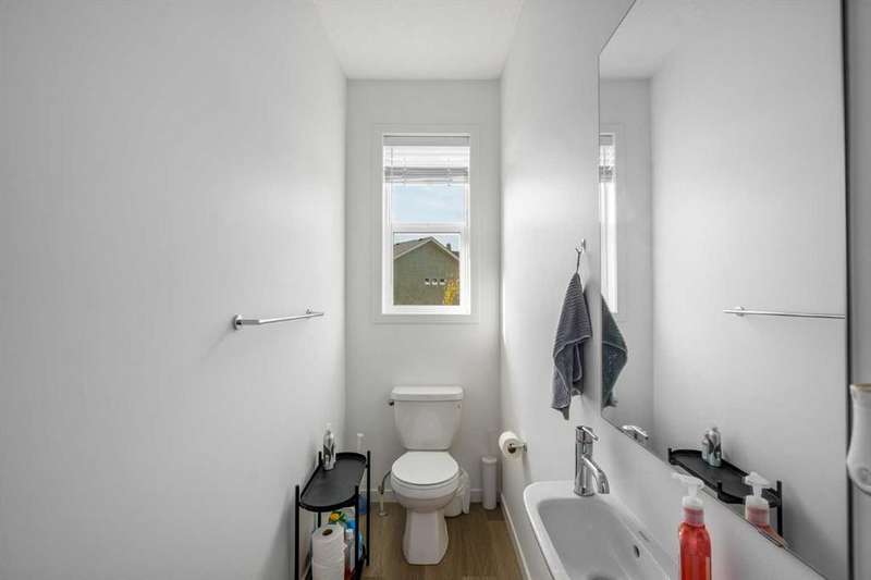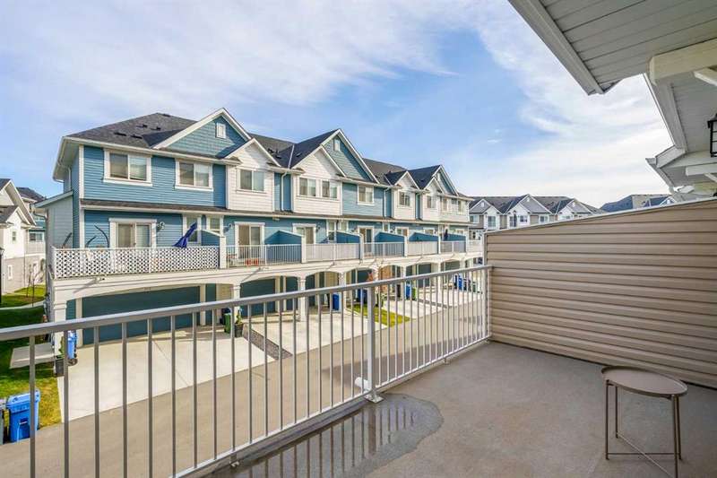 Step into modern comfort with this beautifully designed 2-bedroom, 2.5-bath townhome in the heart of Copperfield. Built in 2024, this bright and contemporary home offers over 1,400 sq. ft. of living space with clean lines, smart design, and quality finishes throughout. The open-concept main living area on the second floor is filled with natural light and features engineered laminate flooring, a stylish kitchen with quartz countertops, upgraded cabinetry, and stainless steel appliances. The spacious living and dining areas flow seamlessly to the balcony with a BBQ gas line—perfect for morning coffee or summer grilling. Upstairs, you’ll find two comfortable bedrooms, each with its own full bathroom, plus convenient upper-floor laundry. The ground level offers a tandem double garage (16’ x 40’) and access to a private rear patio space—great for relaxing or adding some greenery. Additional highlights include low condo fees ($259/month), new home warranty coverage, and a quiet location close to parks, playgrounds, schools, and shopping. Whether you’re a first-time buyer, young professional, or looking for a low-maintenance lifestyle in a growing community, this townhome checks all the boxes.