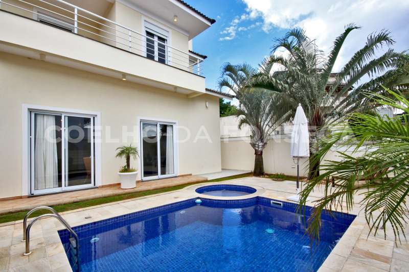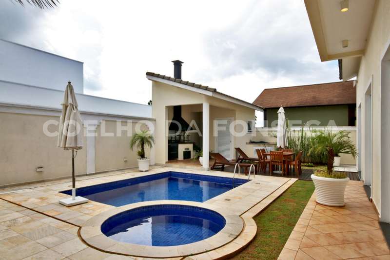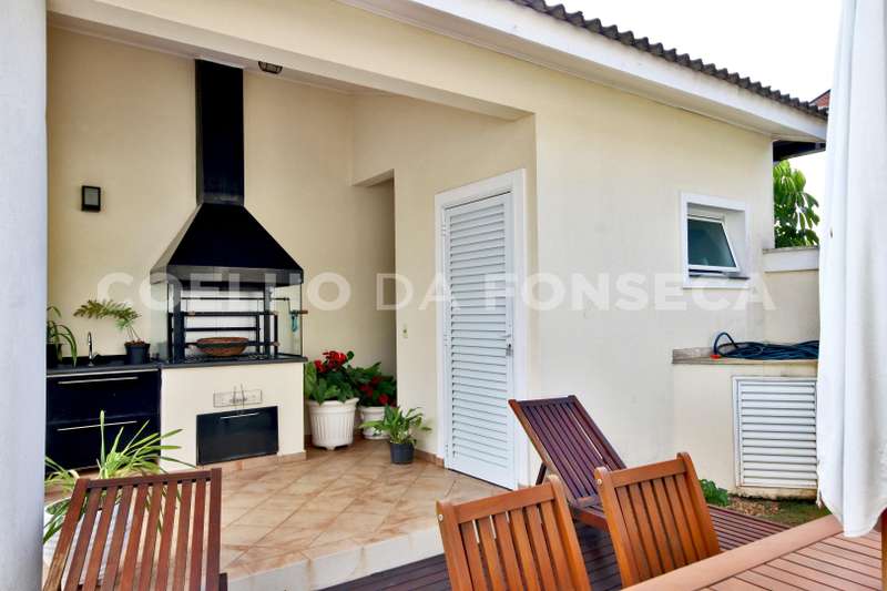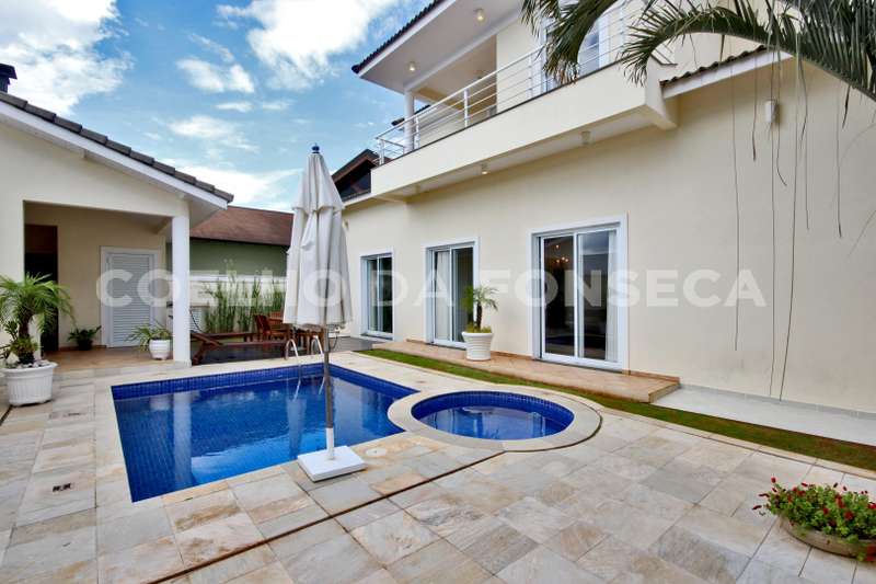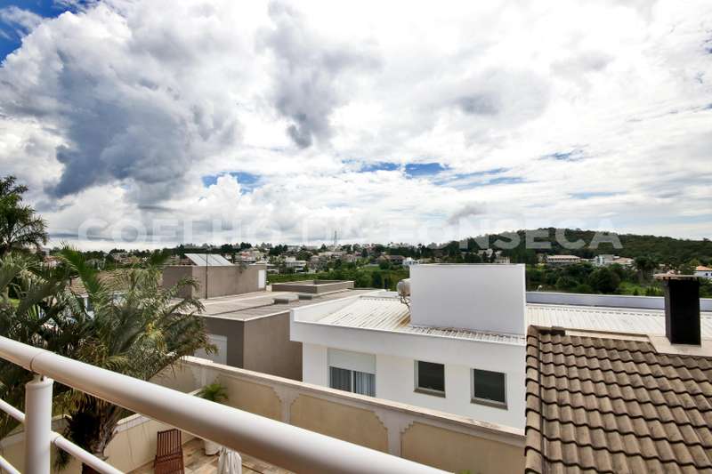 Casa, estilo americano, em condomínio fechado com segurança total, e clima de montanha. Casa com construção sólida, muito bem iluminada e ventilada, living para três ambientes com pé direito duplo e lareira. Quatro suítes com closet, todas com varanda, suíte master com dois closets e banheira com hidromassagem. Escritório, home theater, cozinha americana, área de serviço fechada, dependência de empregada (suíte), armários embutidos em diversos ambientes, três depósitos. Edícula com churrasqueira, banheiro de piscina, piscina e hidromassagem. Vagas para seis veículos. Área construída de 430 m², e área total de 480 m². Aceita permuta de até 60%, em casa em Aldeia da Serra, apartamento em São Paulo nos bairros de Perdizes e Pompeia, ou Imóvel no litoral norte.