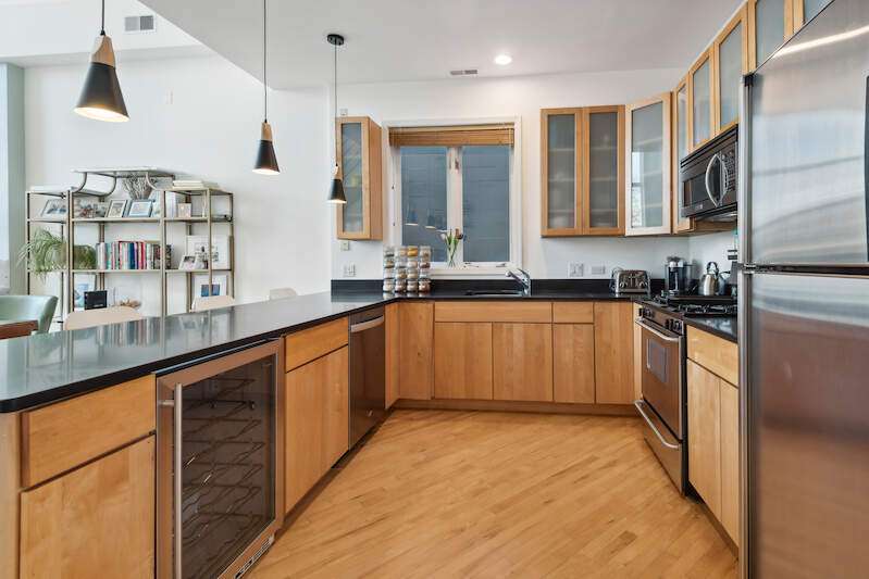 Ready for move-in ASAP! Introducing your urban sanctuary in Wicker Park! This sought-after 3-bed, 2.5-bath duplex penthouse offers 18-foot ceilings, stunning city views, and private decks. Flooded with natural light, the open-concept layout features a dramatic living room, stainless kitchen, and lofted bonus space. The primary suite boasts a private deck and spa-caliber bathroom. Hardwood floors, side-by-side washer/dryer, ample storage, and garage parking complete this package. Just steps from Division Street and transit options. Don't miss out on this urban oasis!
