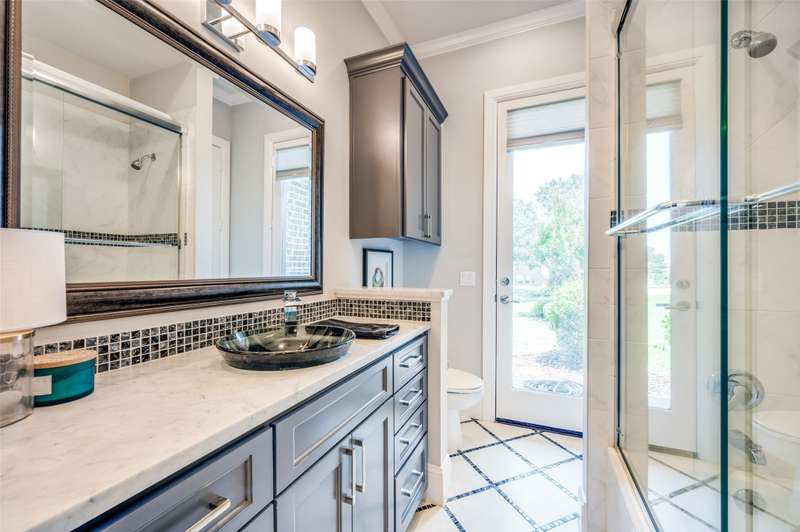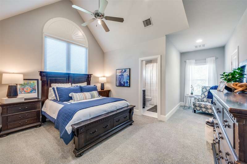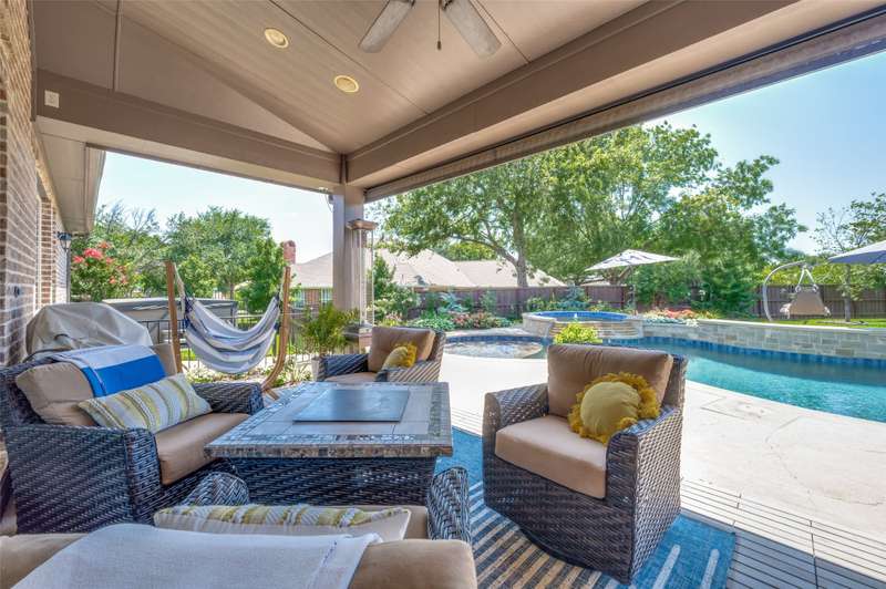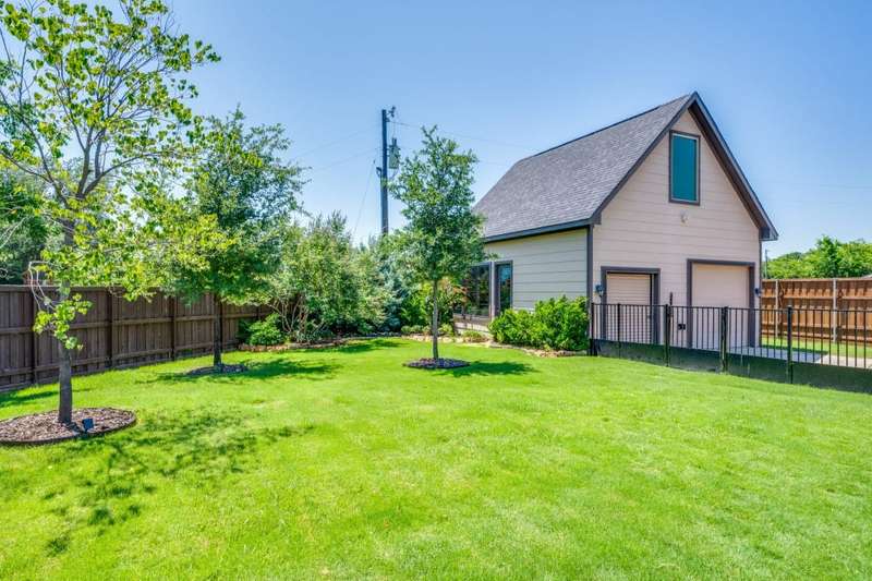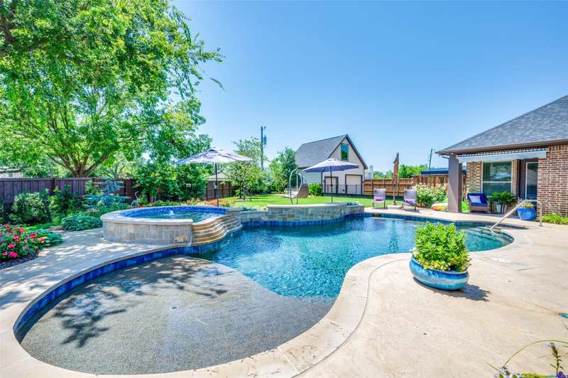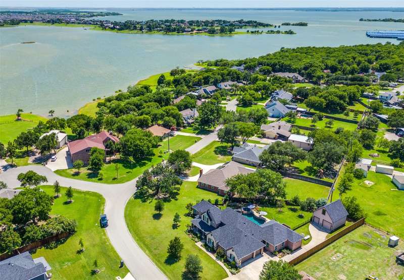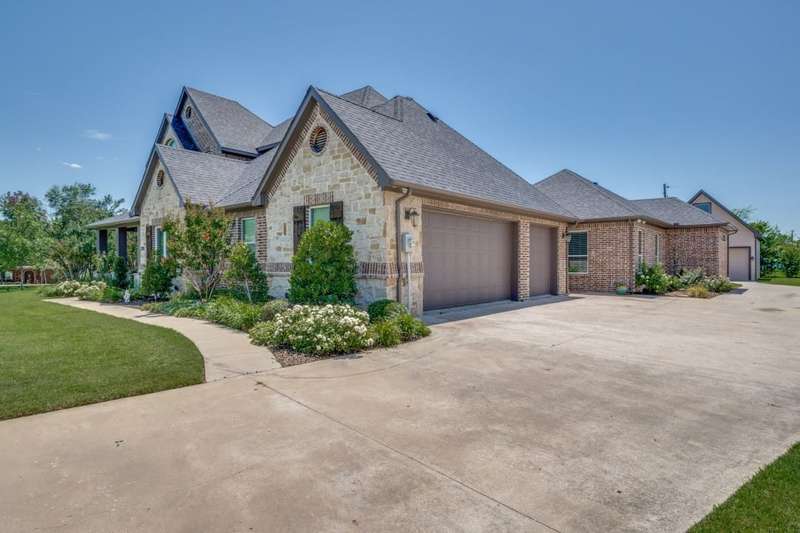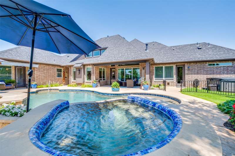 Multi-Gen Lakeside living in West Frisco! DESIGNED with HEART ~ with an attached 1 story Mother-in-Law .54 acre with Peek-a-Boo lake views. This custom Hensley-built home with constructed in 2014, spans 3,817 square feet, the residence features 4 bedrooms, 6 bathrooms, a dedicated study, two distinct living areas. Inside, modern luxury abounds with custom window coverings, stylish lighting fixtures, fresh and sophisticated paint tones, and intricate ceiling details. Wide plank smooth hardwood floors flow throughout, complementing custom built-in display shelves and cabinetry, a dedicated wine niche, and a sleek, modern kitchen. Marble counter tops, with upgraded stacked cabinets with lite display glass, beamed ceiling details, cool lighting and hardware. Hardwood floors, SS appliances, gas c-top, double ovens. The primary retreat, kitchen, and main living areas all offer spectacular views of the backyard pool oasis. The beautifully landscaped backyard is a true highlight, featuring a saltwater pool with water features, a raised spa, an outdoor shower, and a convenient pool bath, plus a hot tub capable of seating six added in 2023. The pool area is enhanced by a large covered patio with direct access to the pool bath, living room, primary suite, and the attached guest house. MULTI-GENERATIONAL attached guest house provides single-story living with a full kitchen, island, living area, and a bedroom with a reading nook, the spa-inspired ensuite bath is complete with a full over-sized ADA Shower, dual vanities, a walk-in closet. This guest house has Front door entry and back covered patio. Adding to the property's appeal is a detached two-story *she-shed* workshop with a one-car garage and a golf cart garage. This exceptional home is located in the Saratoga subdivision, a lakeside community known for its desirable absence of HOA fees and No city taxes. Residents can enjoy easy access to Hidden Cove Park and Marina at Lake Lewisville, just a short walk away.