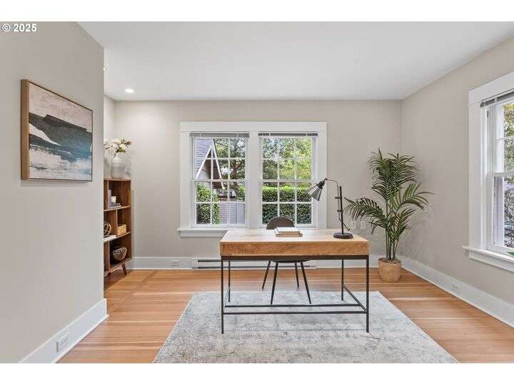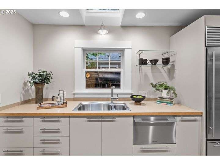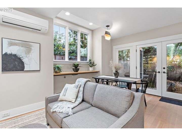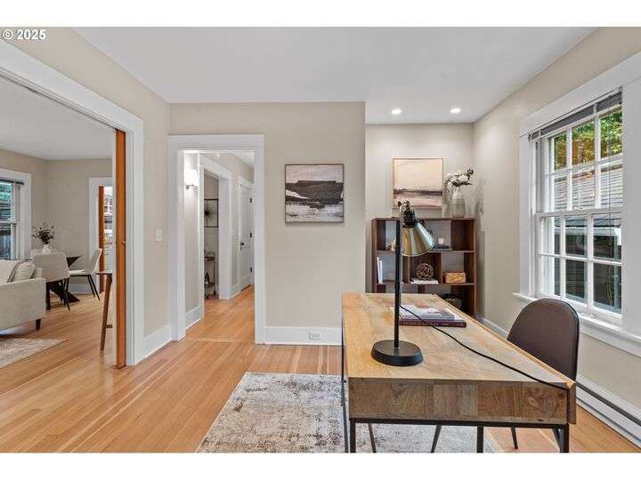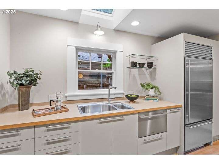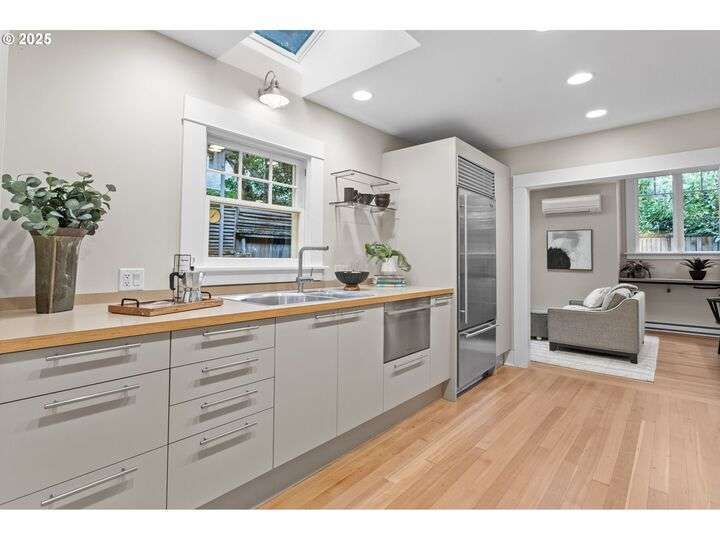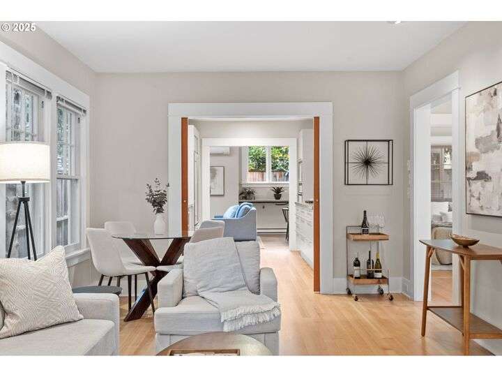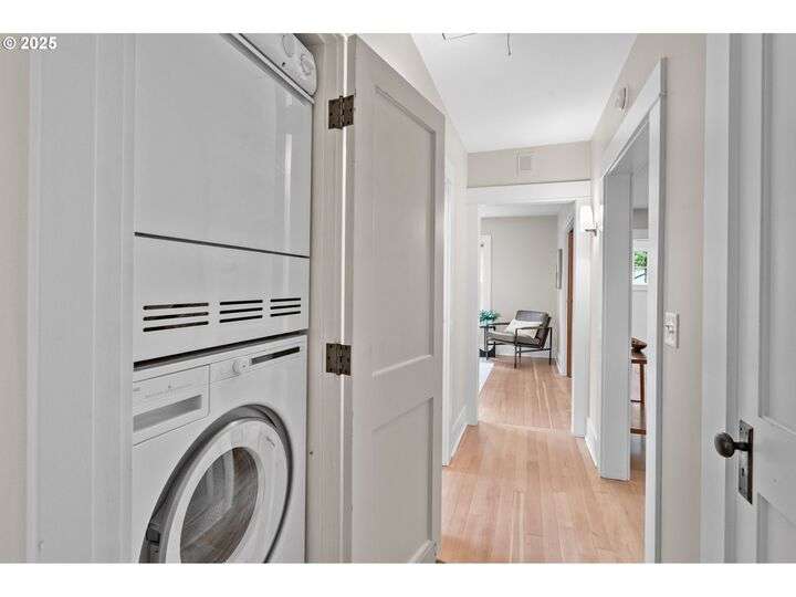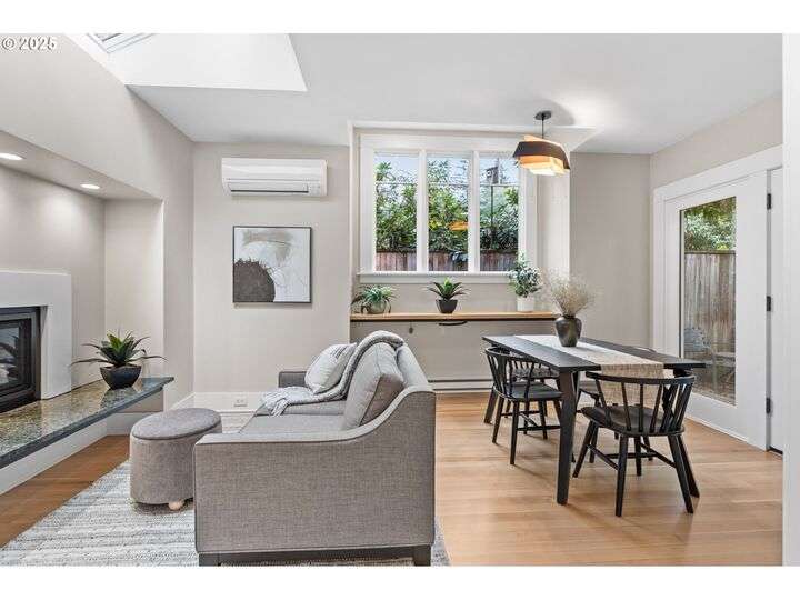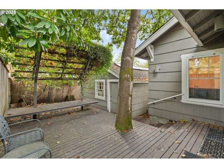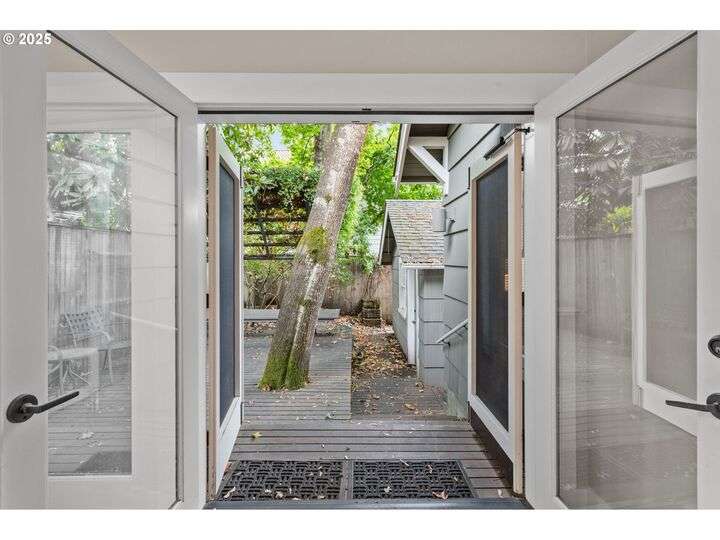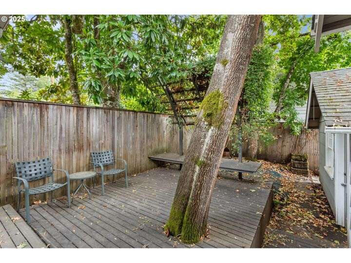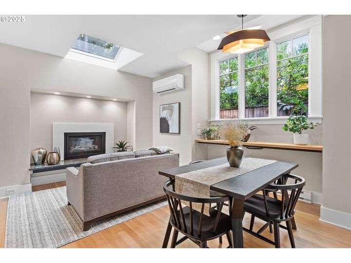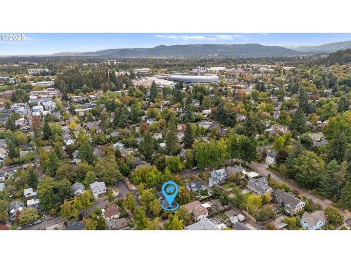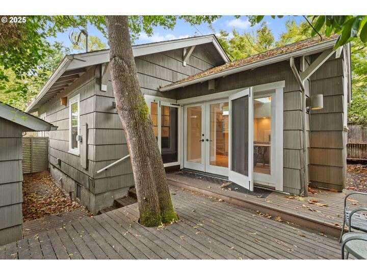 This home sits on a private lot four blocks from the U of O. In 2001 the original interior was taken back to the studs, replumbed, rewired, replastered and fir floors added. Skylights added much additional light.Additions of a light-filled foyer and multi-purposed room at the rear of the house contribute to its most dramatic feature; openness and the feeling of an urban loft. Standing in the front entry, there are fifty feet of uninterrupted space from front to back. Two sets of etched-glass pocket doors allow the space to be partitioned when desired.The rear addition includes a gas fireplace, built-ins and French doors that look out onto a hardwood deck with bench, water fountain, and private courtyard.In addition to a mini-split heat pump, all of the windows can be opened during summer nights permitting the quiet, whole house attic fan to bring in cool night air.The kitchen features all stainless appliances including a Sub-Zero refrigerator/bottom-drawer freezer, DACOR convection oven, microwave oven and gas cooktop. Also a Fisher & Paykal drawer-style dishwasher and a slim Kitchen-Aide pullout exhaust fan.The bath is a spa-like retreat with a no-enclosure, Italian-style shower, Italian porcelain tiles and radiant heat warming the floor tiles. Duravit wall hung toilet and vanity. An unusually deep Kohler tub make everyday moments memorable. Stacked ASKO washer and dryer are located nearby.Immediately adjacent to the house is an oversized one-car garage, with four large skylights. The back door of the garage is conveniently located just a few steps from the rear entry of the house.