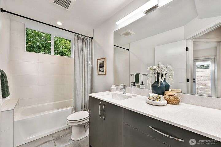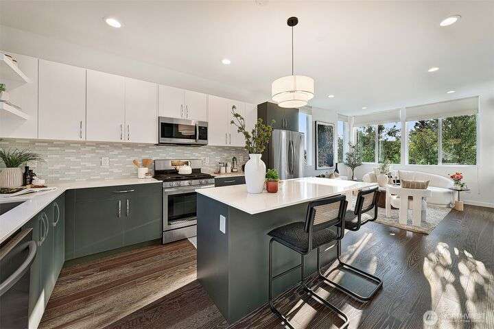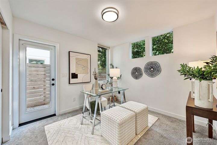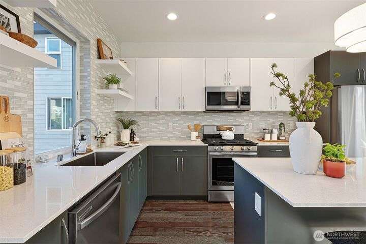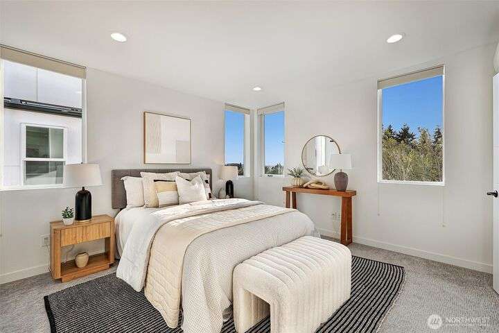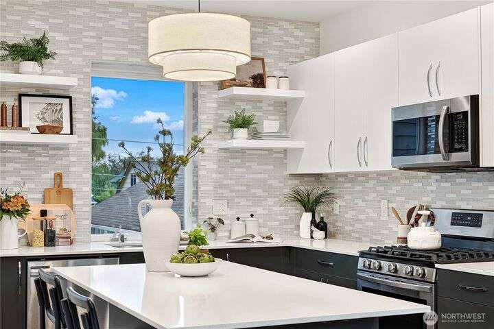 This townhome has a layout you'll love. Wider and brighter than most, with tall ceilings and walls of windows to bring in the natural light. The neutral and modern aesthetic won't look dated in 10 years - with gas range, and large kitchen island for cooking and entertaining. Don't compromise on outdoor space - with a fully fenced turf yard and a large rooftop deck for relaxing and hosting. This Whittier Heights home lives large with three bedrooms, and plenty of parking for you and your guests, including a dedicated spot with EV charging. On a quiet residential street, you get to live in one of Seattle's most desirable neighborhoods, close to Ballard amenities, transit, and tech commuter routes. Pre-inspected - come see it in person!