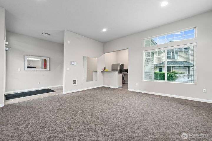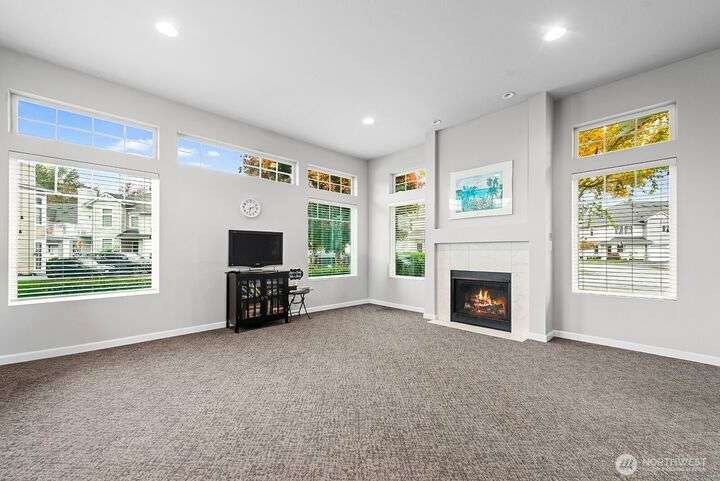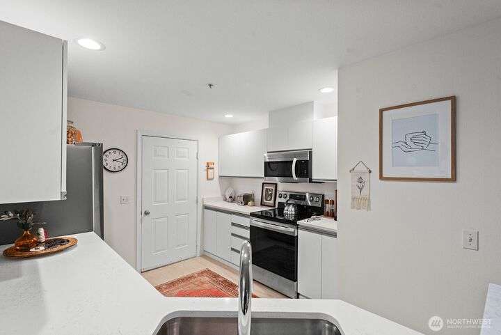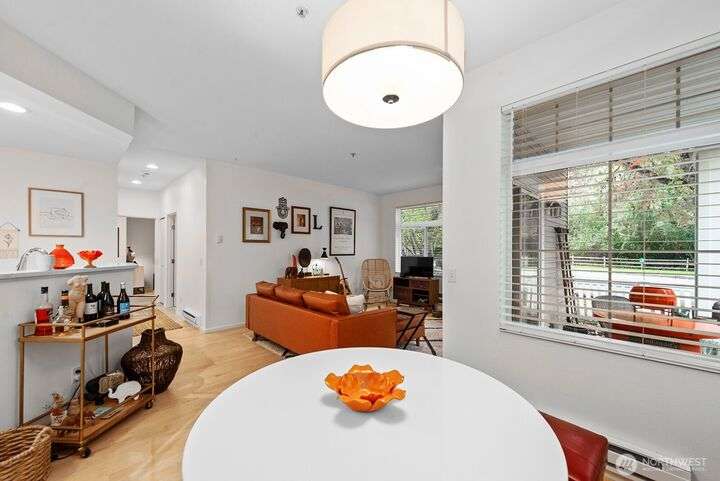 Stunning garden level end unit with covered patio, high ceilings, hardwoods, open dining & living room with wood burning fireplace. Professional remodel in 2024 includes kitchen and baths with quartz counters, ceramic tile floors, all new appliances including full size washer & dryer, carpet in both bedrooms. Spacious primary with walk-in closet, new tiled walk-in shower, floors. New wood slat blinds, new heaters, freshly painted throughout Garage parking plus extra parking in driveway. Guest parking, clubhouse w/gym, sauna & party room, walking & biking trails, beautiful water features & wildlife viewing. Wonderful community & location. Easy access to I5 N. & S. VETERANS can assume 5.75% 30 yr. fixed VA mortgage easily! A rare opportunity!
