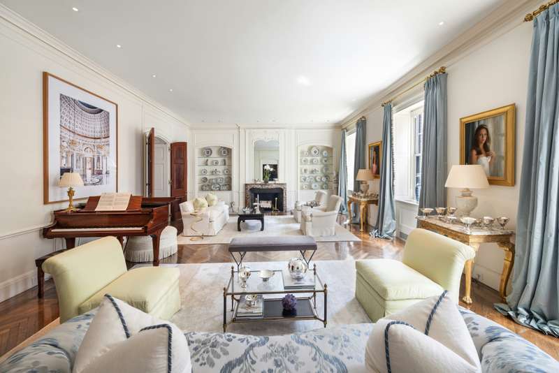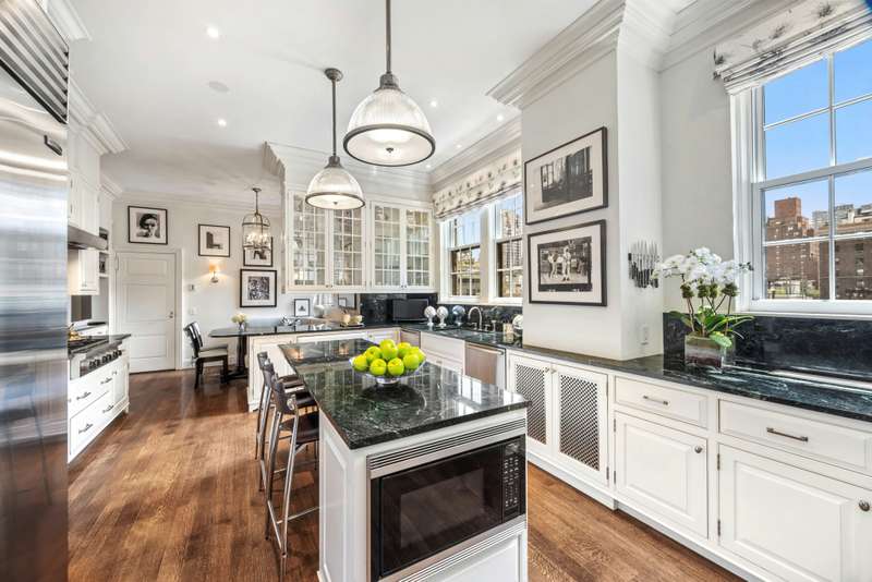 Designed by renowned architect Rosario Candela, the residence offers grand scale rooms with a gracious layout accentuated by magnificent ; architectural elements. ; A sweeping 23-foot gallery opens onto a sprawling 31 x 20 ft. living room with a woodburning fireplace and three large windows overlooking Park Avenue. The home's soaring 11 ft. ; ceilings are enhanced by beautiful traditional moldings throughout, ; and restored herringbone flooring may be found in all of the public rooms. Adjacent to the living room, there is a handsome paneled library with a wood-burning fireplace ; that also faces the Avenue. A powder room may also be found off the gallery. At the opposite end of the gallery is an elegant 25-foot formal dining room with a fireplace, ; a separate dry bar and a closet for china and stemware storage. ; ; The dining room has open views to the east. ; ;A modern and impressive ; Chef's eat-in-kitchen ; with four large windows overlooking townhouse gardens may be found along the Eastern wing of the home. The enormous 28 x 13 ft. kitchen has top-of- the line appliances, ample counter space, and custom cabinetry. ; ;The bright and open views over townhouses and gardens to the east make it one of the best eat-in-kitchens on Park Avenue.