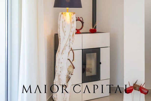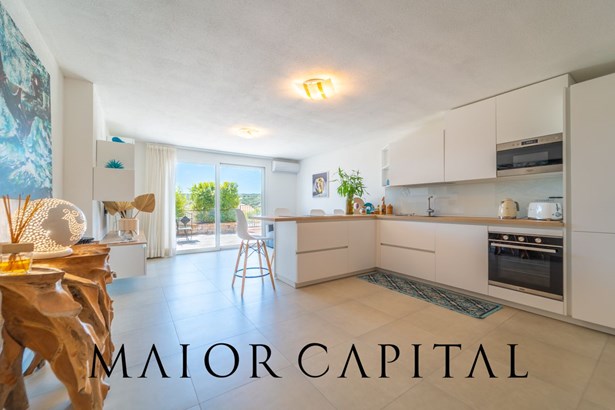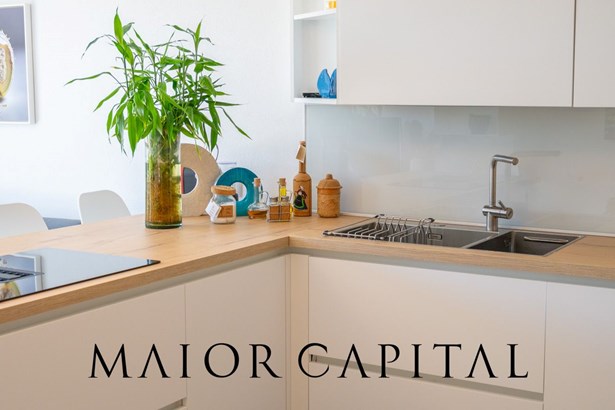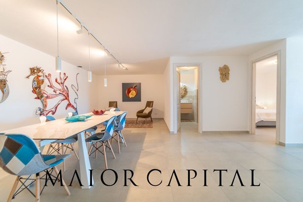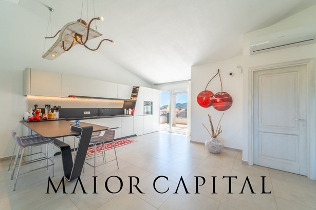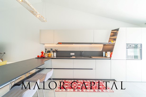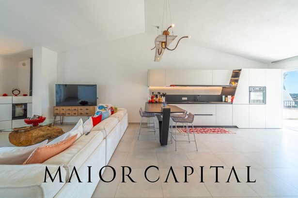 The living area is designed for maximum living comfort, with thoughtfully selected furnishings and a seamless connection between the living room and the kitchen. The latter, modern and minimalist, opens onto a second veranda, further increasing the brightness and creating a perfect synergy between indoor and outdoor spaces.