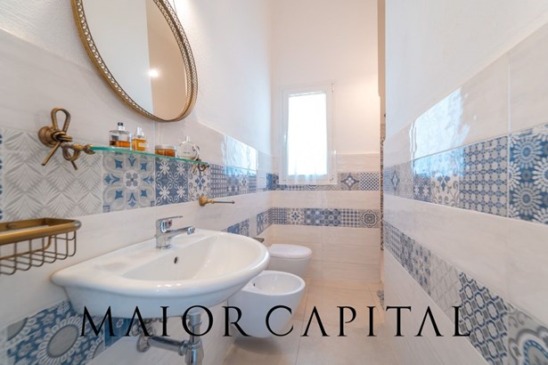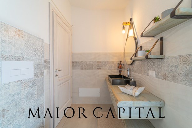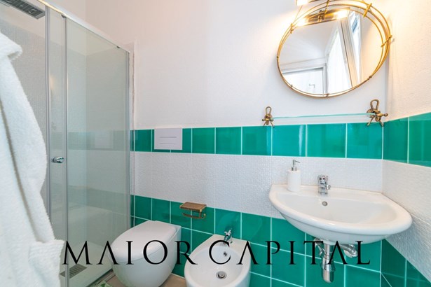 An internal staircase leads to the basement level, characterized by a warm and authentic atmosphere. Here, we find a living area decorated with artisan elements, paintings, and marine-themed accents, all in perfect Mediterranean style. This level also includes a double bedroom and a bathroom with a spacious wall-mounted shower, finished with high-quality materials in neutral and relaxing tones.