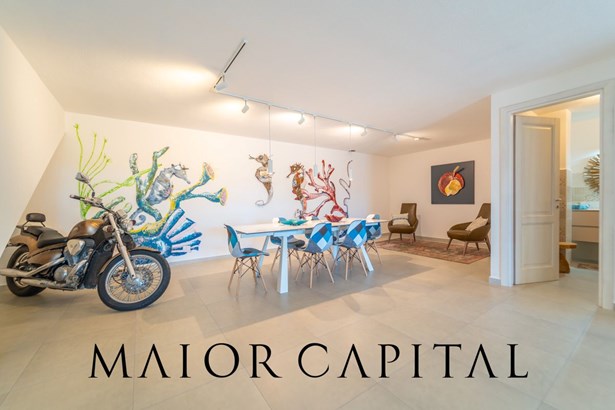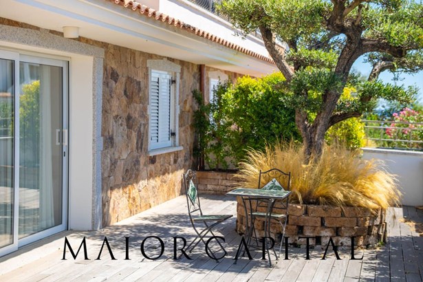 The exterior is an exclusive setting where every detail is designed to offer comfort, privacy, and beauty. The villa is surrounded by a lush Mediterranean garden, carefully landscaped with native and ornamental plants, and enhanced by a majestic centuries-old wild olive tree perfectly integrated into the outdoor paving. The private pool dominates the landscape, offering an open sea view and evoking pleasant emotions.