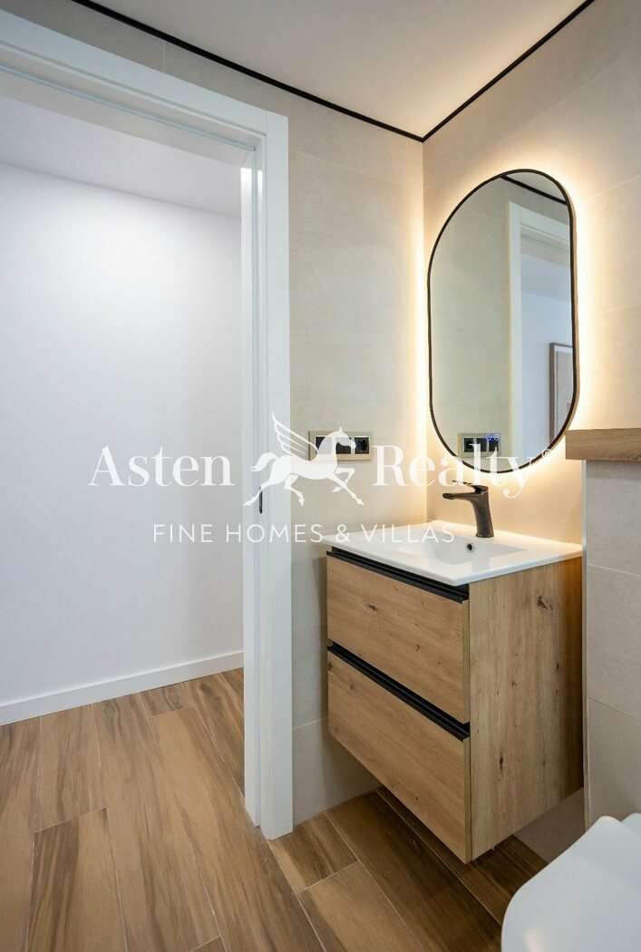 - Suspended wooden furniture with white ceramic sinks in bathrooms.