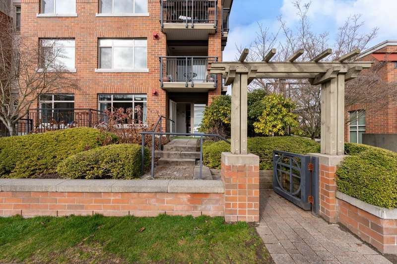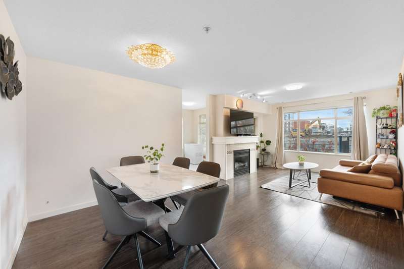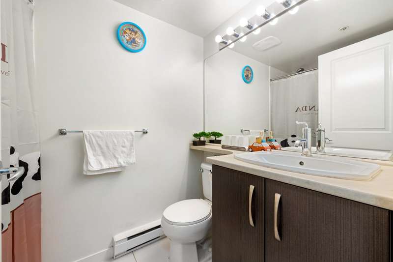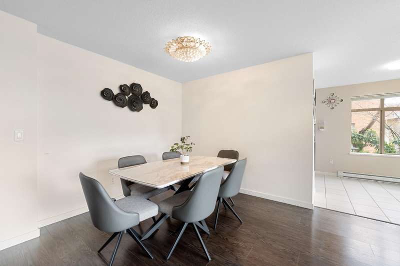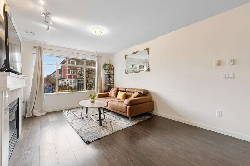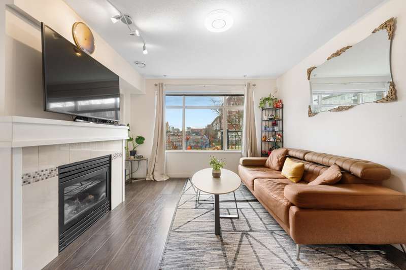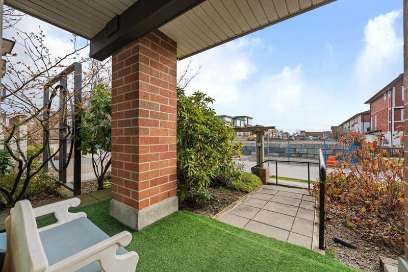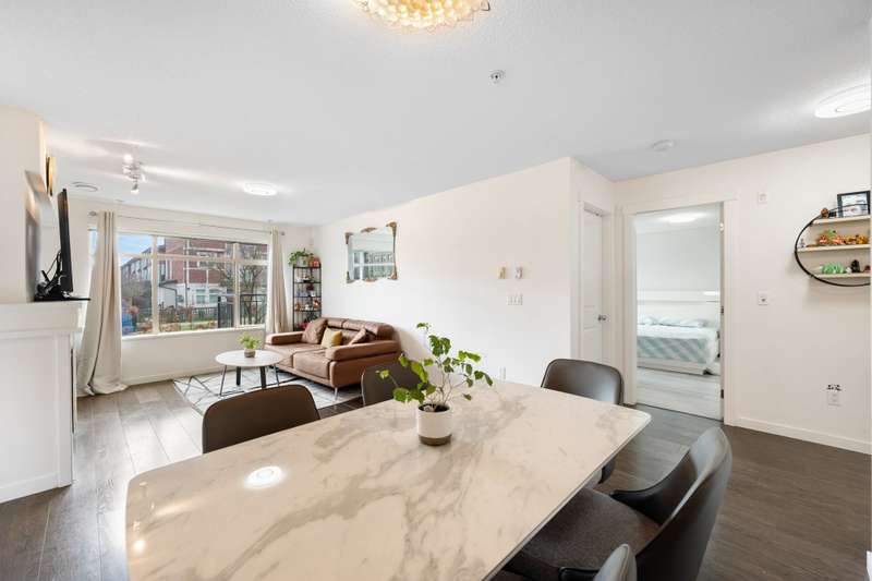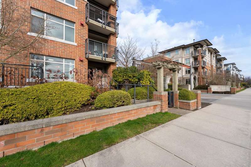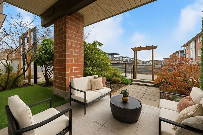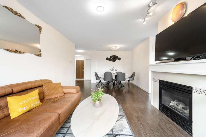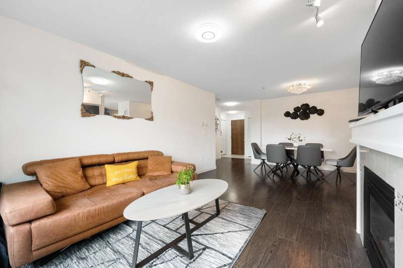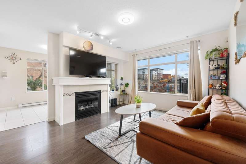 Meridian Gate by Polygon. Experience tranquillit in this beautifully maintained ground-floor southeast corner unit, offering a townhouse-like setting with your private entrance---Enjoy the bright and spacious layout over 1225 Sq Ft featuring 3 bedrooms & 2 full baths w no neighbor on both sides. The unit boasts granite countertops, stainless steel kitchen appliances with a gas stove, a gas fireplace, and laminated hardwood flooring in the living and dining rooms. The expansive master bedroom includes a walk-in closet & double sinks. Residents can access a grand clubhouse with an outdoor pool, hot tub, exercise room & theatre room. Conveniently located within walking distance to Walmart, banks, shopping malls, restaurants, parks, schools & Skytrain. Perfect for families with young kids!