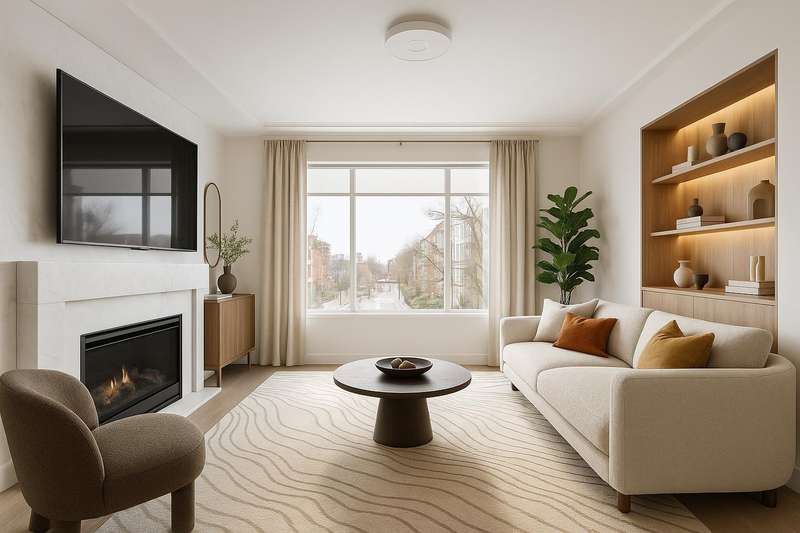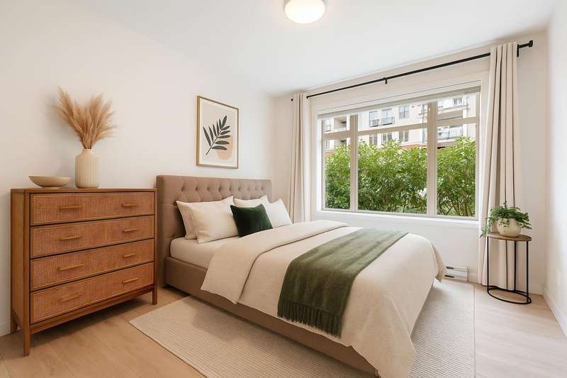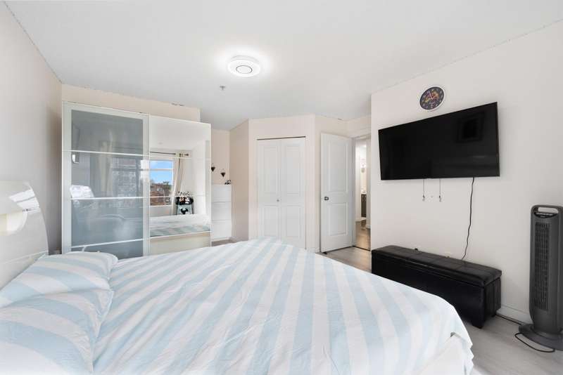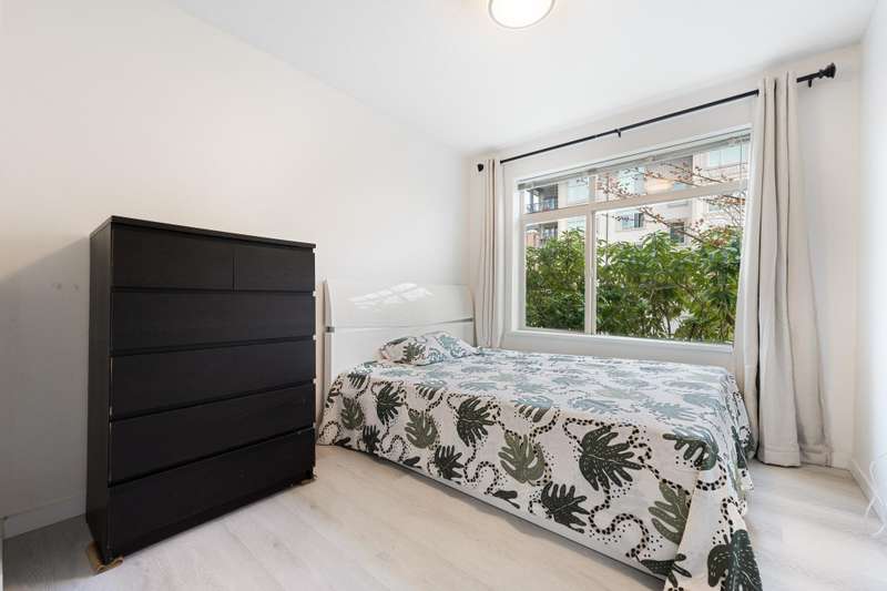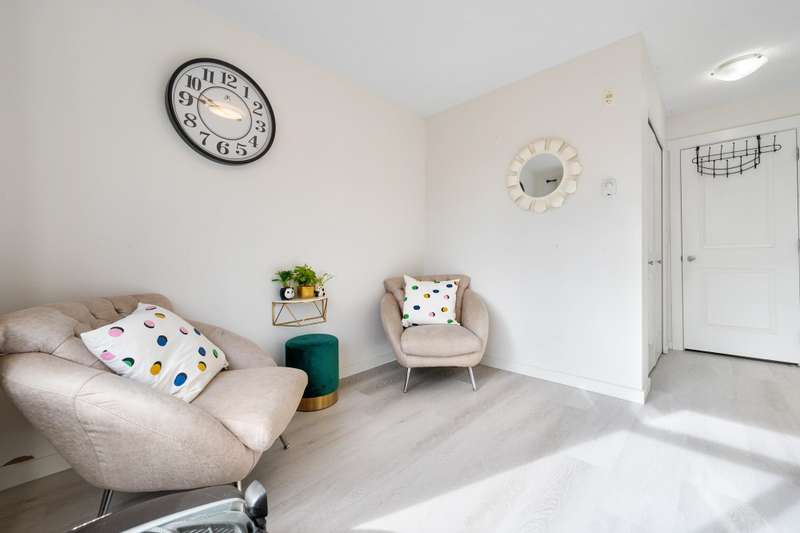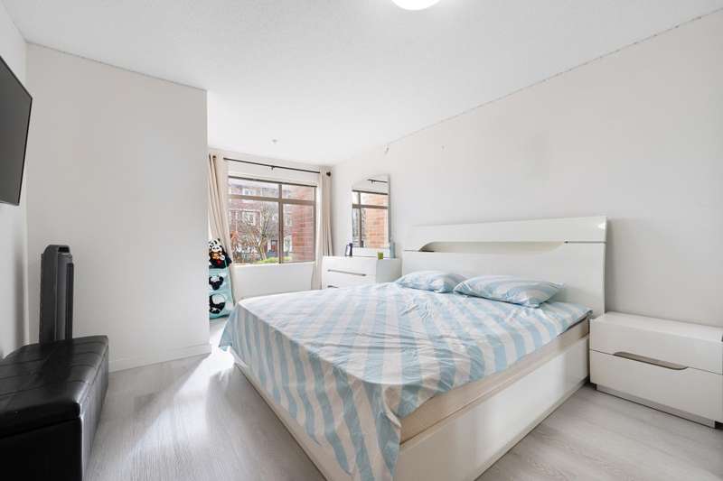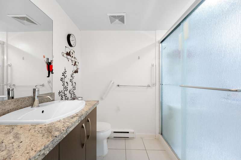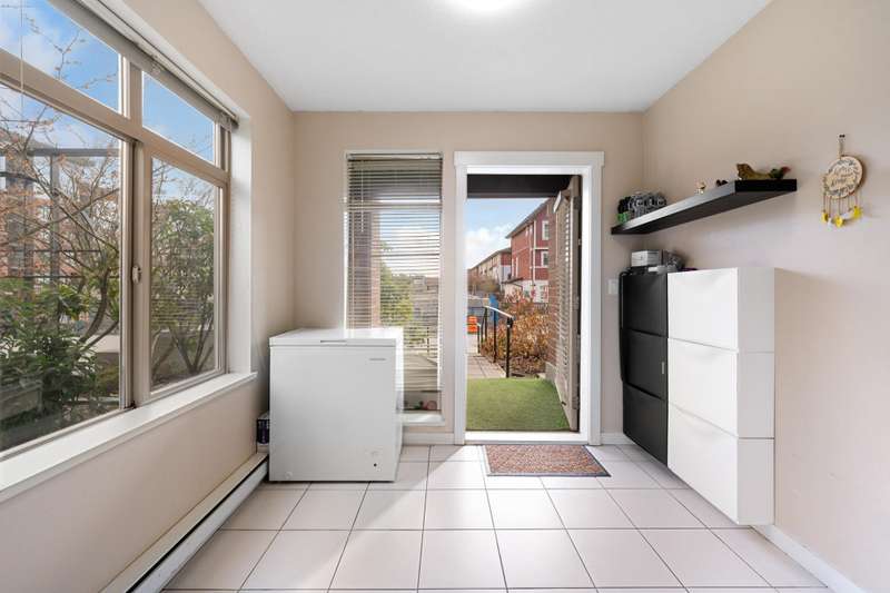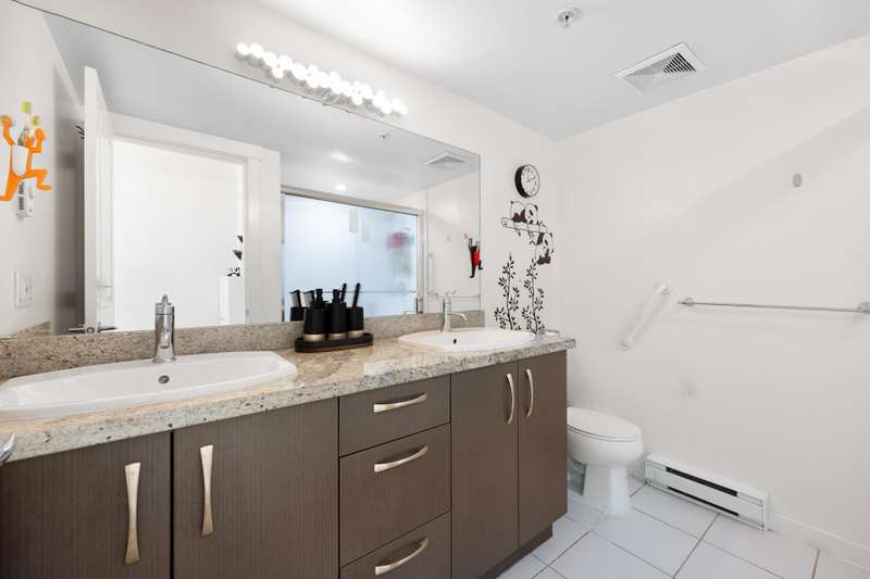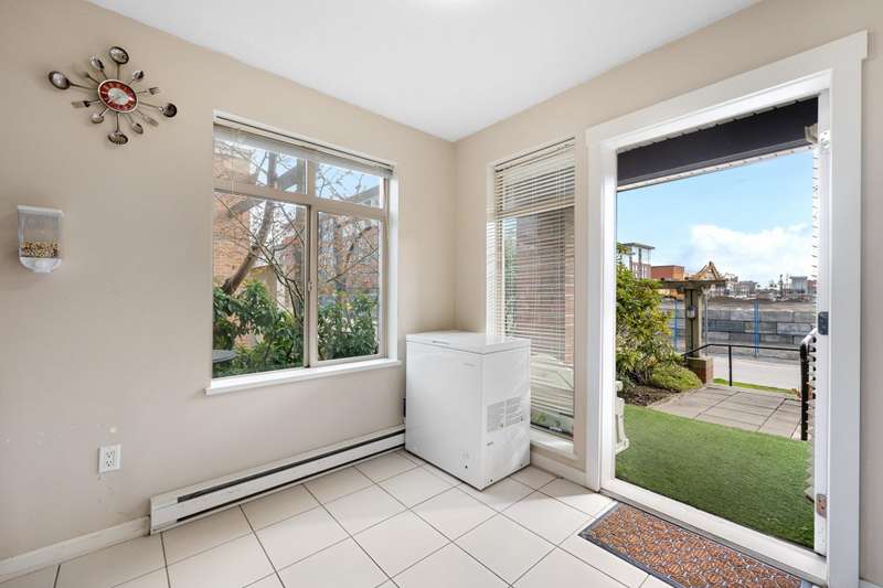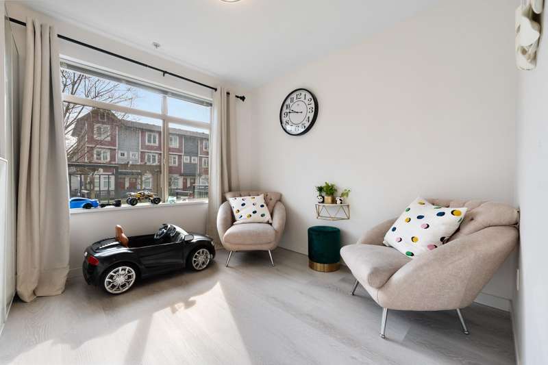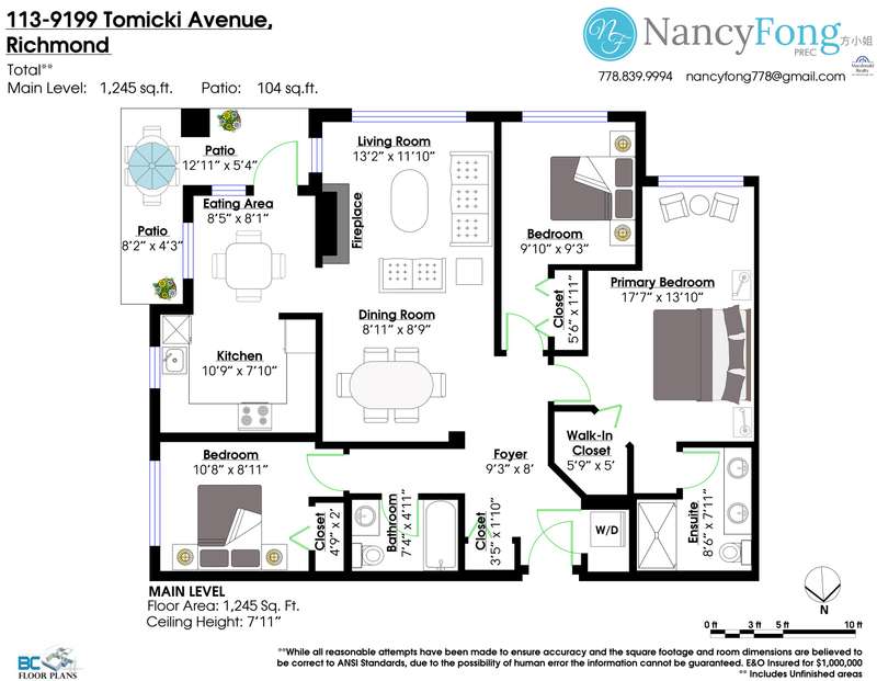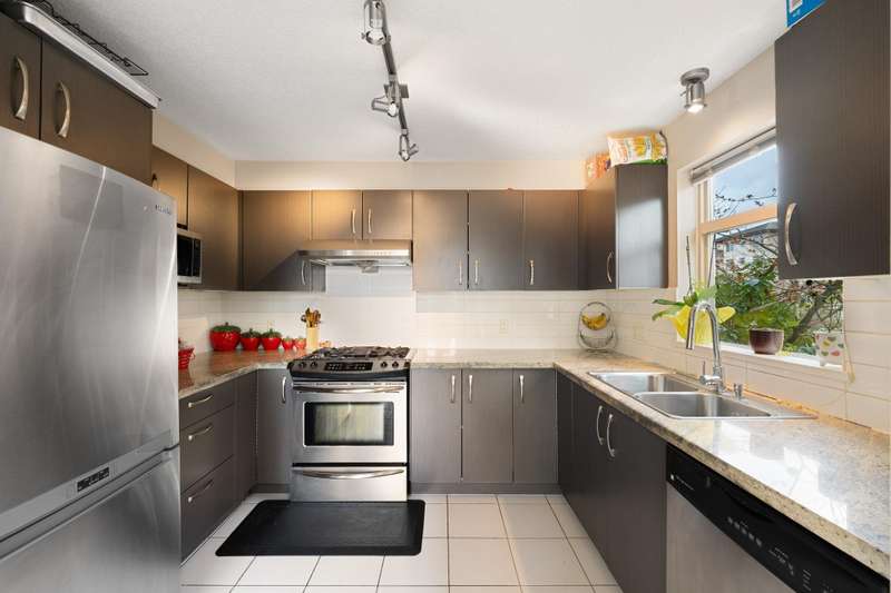 Meridian Gate by Polygon. Experience tranquillit in this beautifully maintained ground-floor southeast corner unit, offering a townhouse-like setting with your private entrance---Enjoy the bright and spacious layout over 1225 Sq Ft featuring 3 bedrooms & 2 full baths w no neighbor on both sides. The unit boasts granite countertops, stainless steel kitchen appliances with a gas stove, a gas fireplace, and laminated hardwood flooring in the living and dining rooms. The expansive master bedroom includes a walk-in closet & double sinks. Residents can access a grand clubhouse with an outdoor pool, hot tub, exercise room & theatre room. Conveniently located within walking distance to Walmart, banks, shopping malls, restaurants, parks, schools & Skytrain. Perfect for families with young kids!