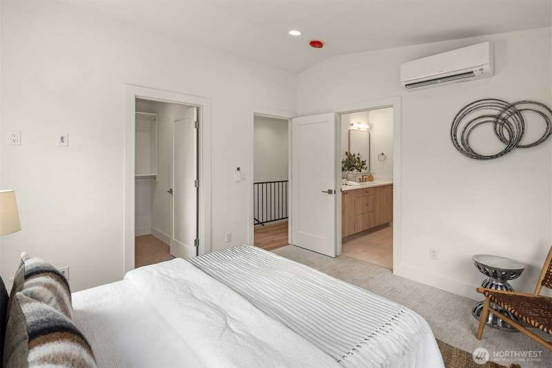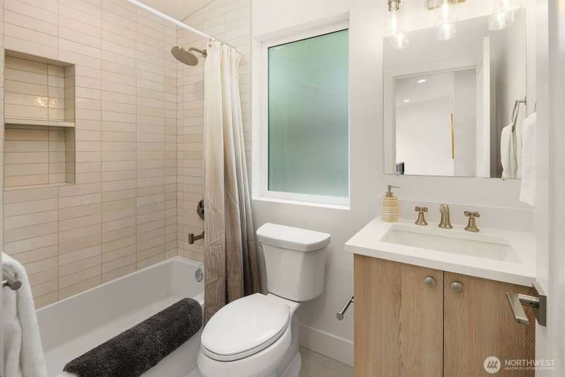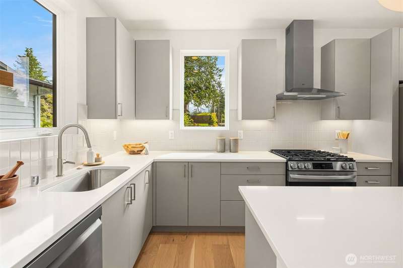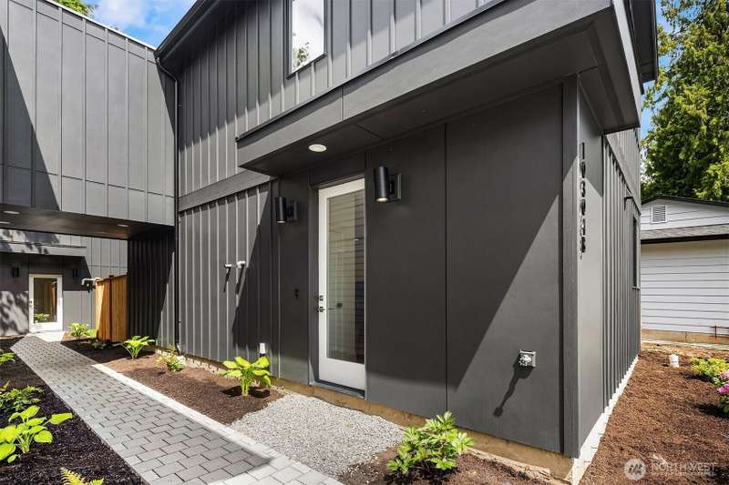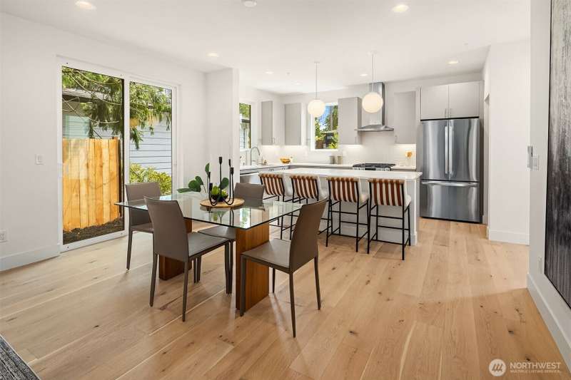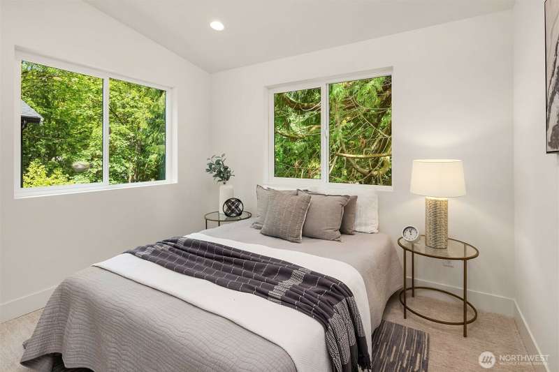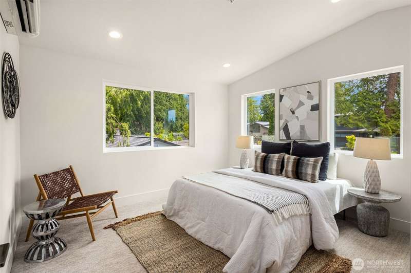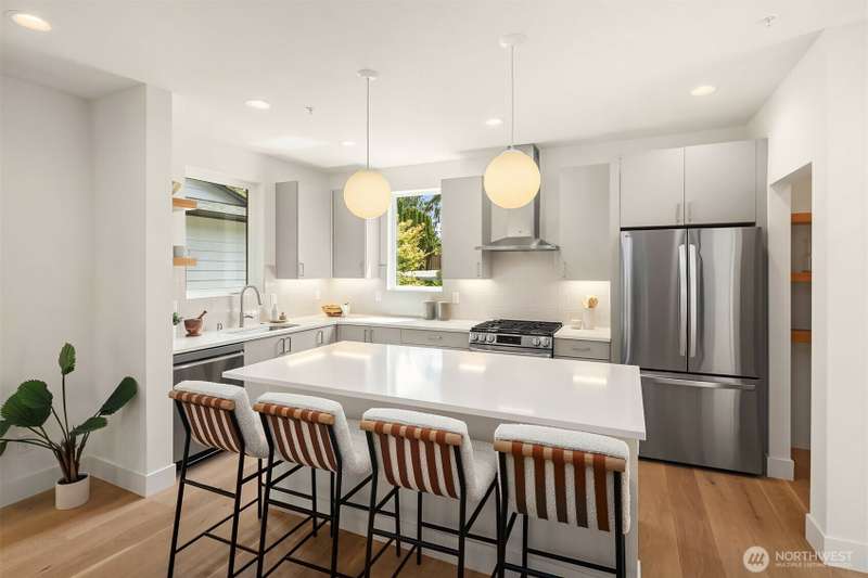 ID Construction Group presents a charming new cottage in Kirkland! The open-concept main floor is filled with natural light from floor-to-ceiling windows and features a stylish kitchen with gas range and large island with unique matte quartz counters. Double sliders open to a private fenced yard and patio—perfect for BBQs or soaking up the sun. Upstairs you'll find your secondary bedroom, full bath, and laundry with washer/dryer included. Primary suite includes well-appointed serene bath with heated floors. Dedicated off-street parking adds convenience. Ideally located just minutes from Juanita Beach parks, shopping, and dining options and an easy commute to downtown Kirkland or Bellevue.