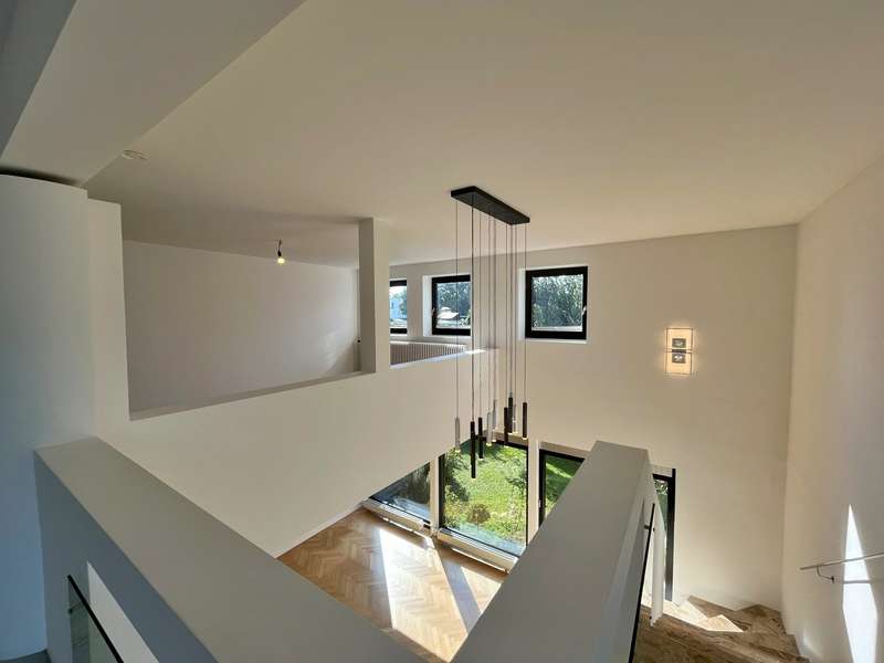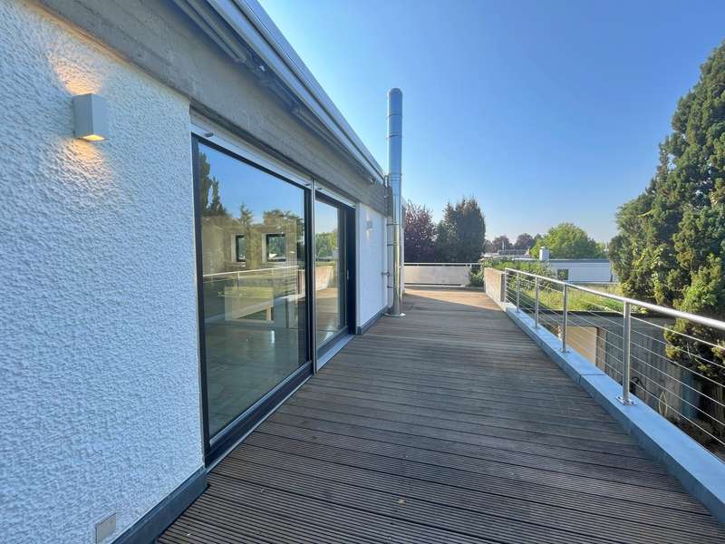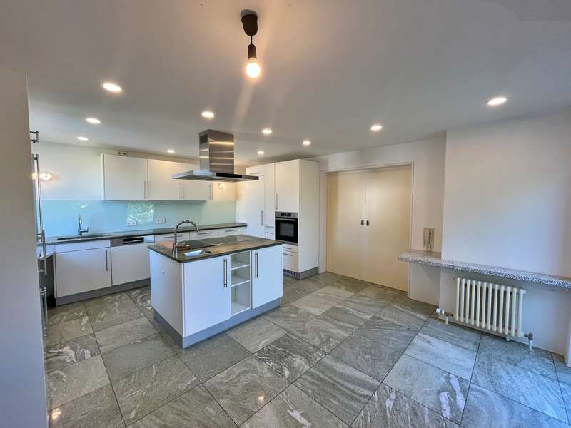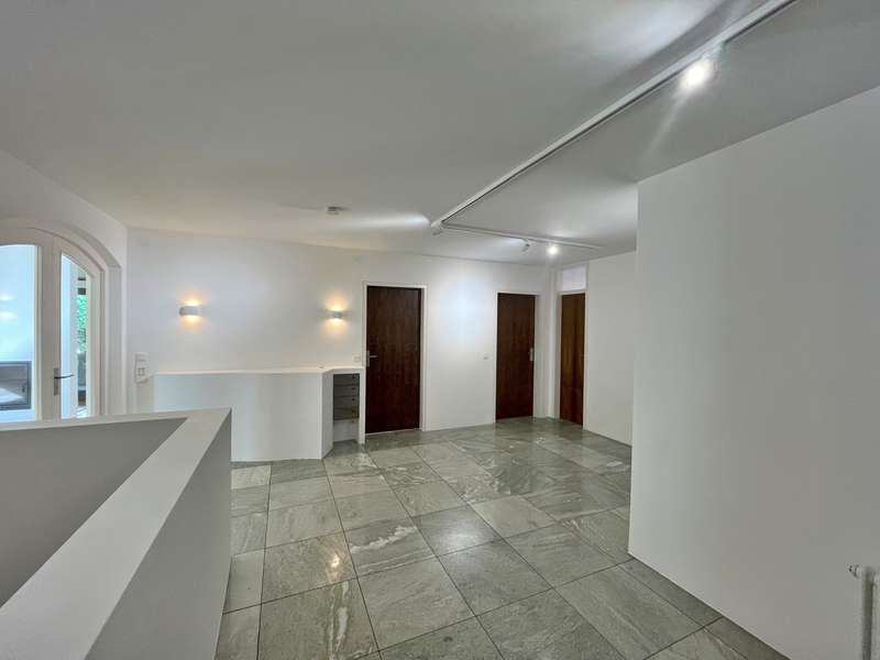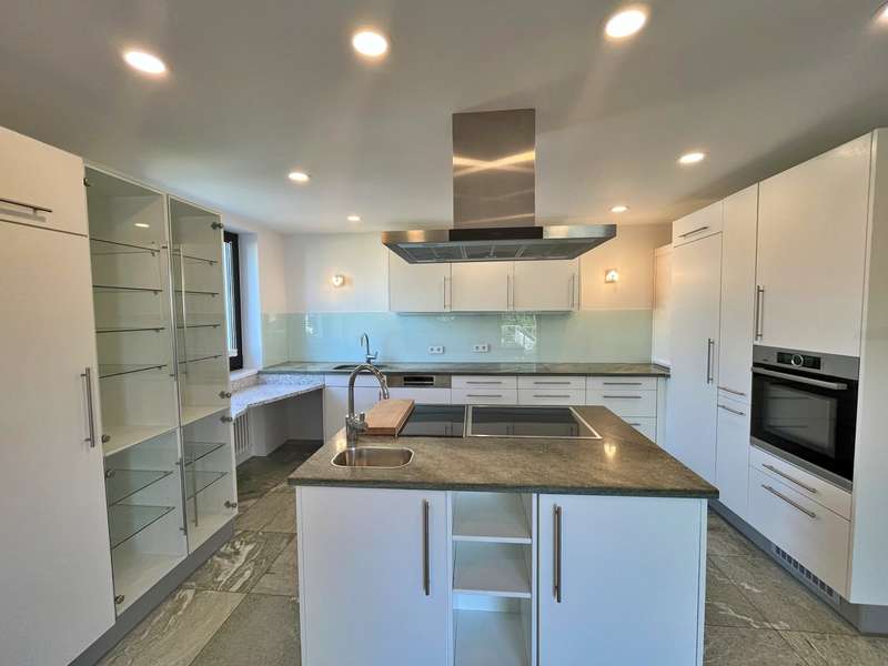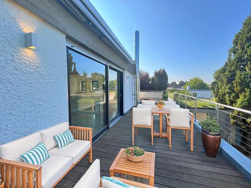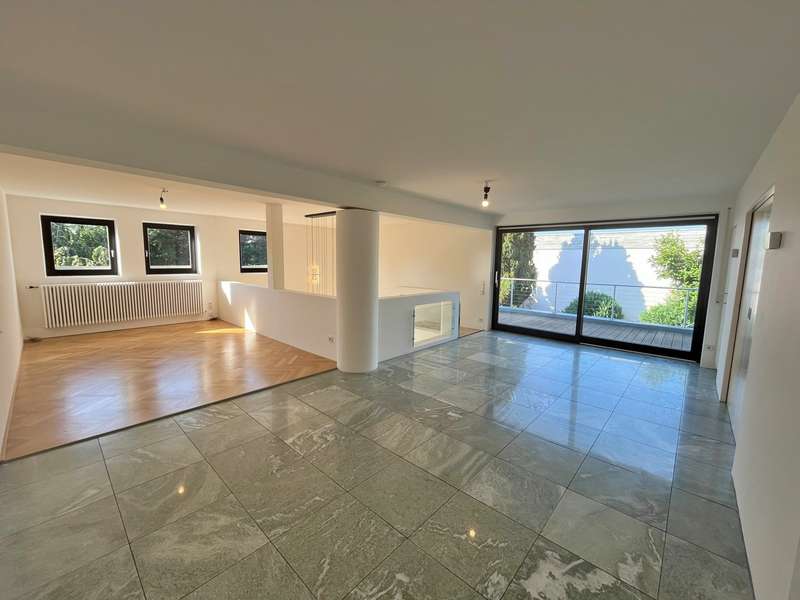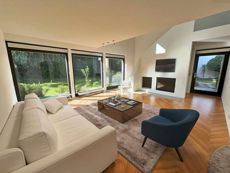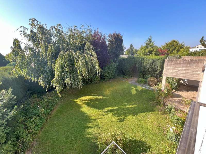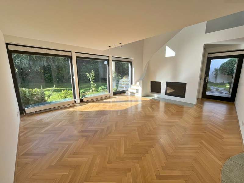 Built in 1973 and extensively modernized in 2006, this architect-designed house presents itself in modern splendor. The living space of 355 m² is spread over three floors and offers sufficient space for individual design and exclusive requirements. The property is situated on a 684 m² plot of land with no privacy and is surrounded by an attractive garden that offers both relaxation and leisure opportunities. From the garden, there is access to a double garage and a spacious, covered terrace, which is ideal for both socializing and quiet moments outdoors. The first floor has a spacious hallway that leads to three bright rooms. A bathroom equipped with a bathtub offers the opportunity to relax. The guest WC is equipped with a shower for additional comfort. The rooms include a spacious living room with a fireplace and large south-southeast-facing windows. It has access to the garden and is ideal for cozy get-togethers. Upstairs there is a modern kitchen equipped with high-quality appliances and offering plenty of space for culinary development. From the dining area, a large sliding door leads directly onto the large balcony. A library adjacent to the dining area invites you to spend cozy evenings. Another place to relax is the bedroom, which is equipped with its own bathtub. The bedroom also has a small balcony. Another separate WC and a bathroom with shower and bidet complete the offer on this floor. In the basement there is a large room with an outdoor seating area, which can be used for a variety of purposes. A cellar room with heating, a further cellar room with natural stone flooring, a boiler room and a laundry room provide ample storage space. Worth mentioning is the room with sauna, relaxation area and shower - an ideal retreat for well-being. There is also an apartment with a bathroom, which has a separate entrance and can be used as a granny apartment. The property offers a perfect blend of luxurious living comfort, modern amenities and two separate garden areas, which provide a quiet and secluded retreat and thus offer an incomparable and versatile living experience for the whole family.