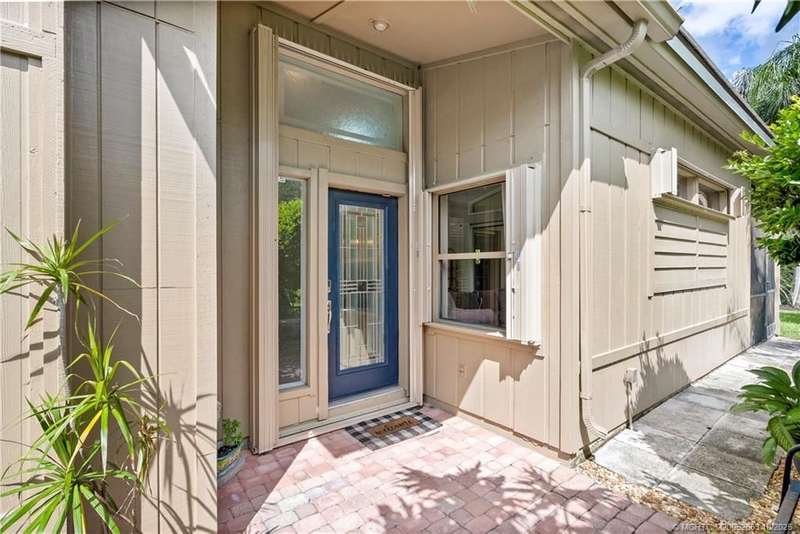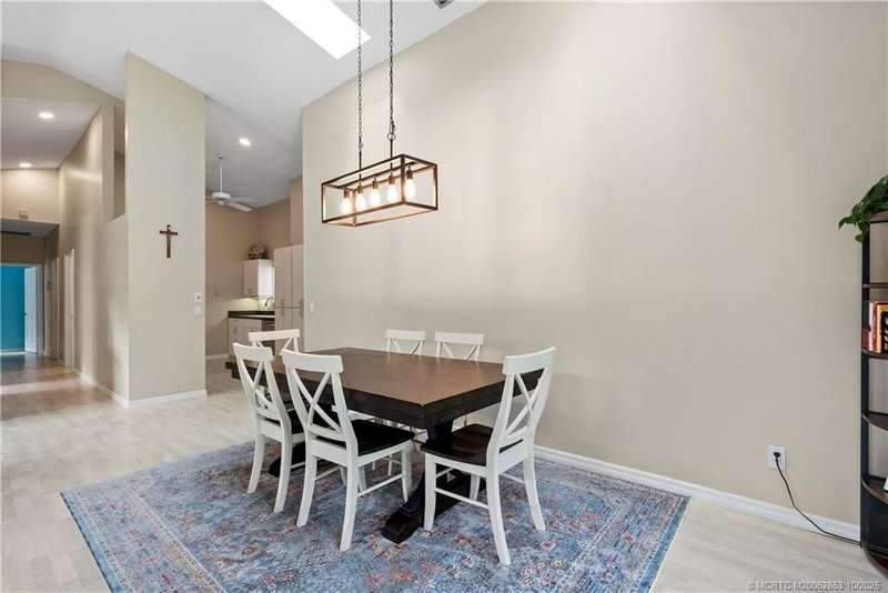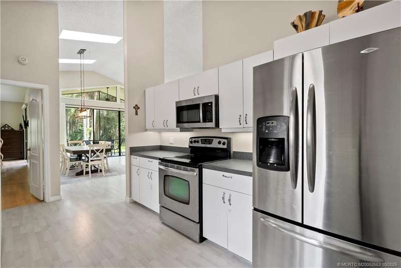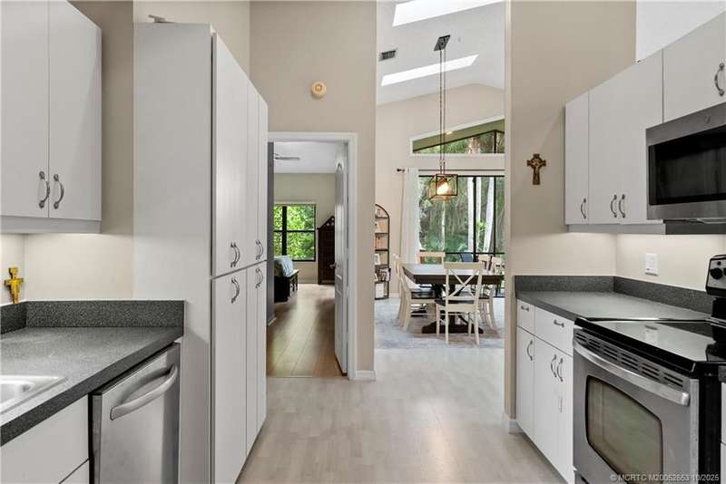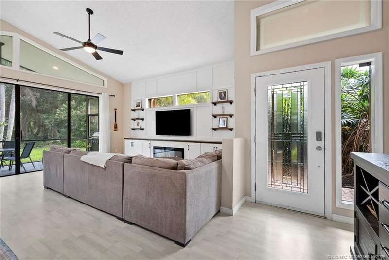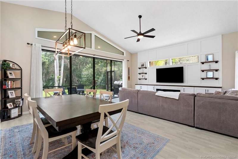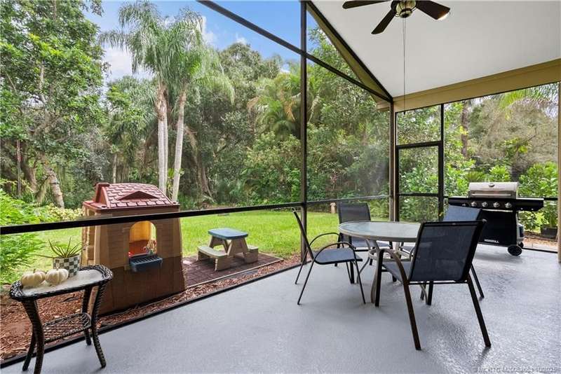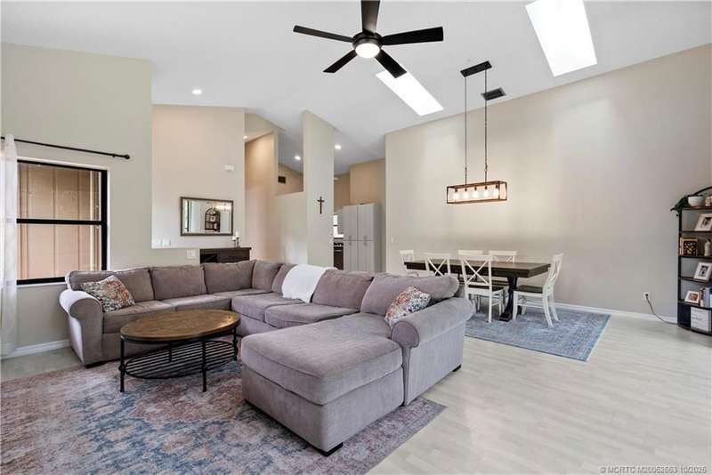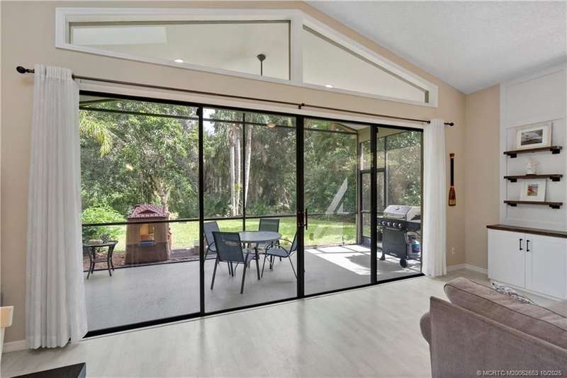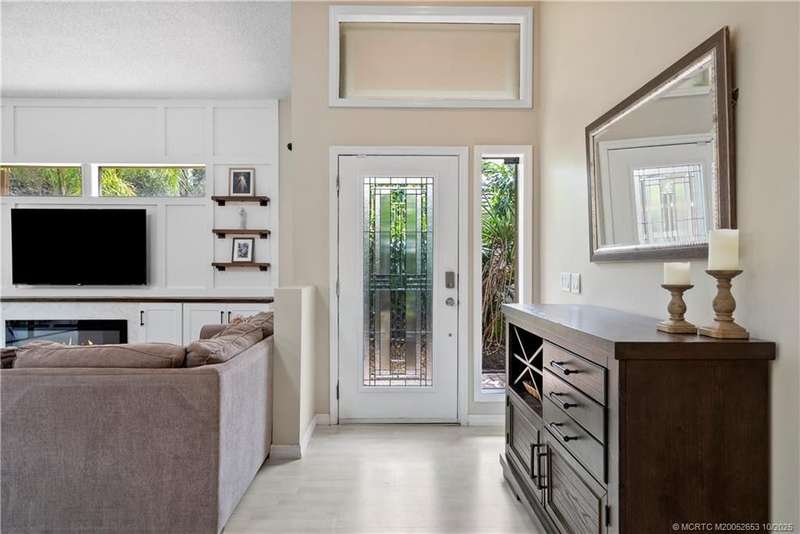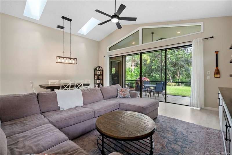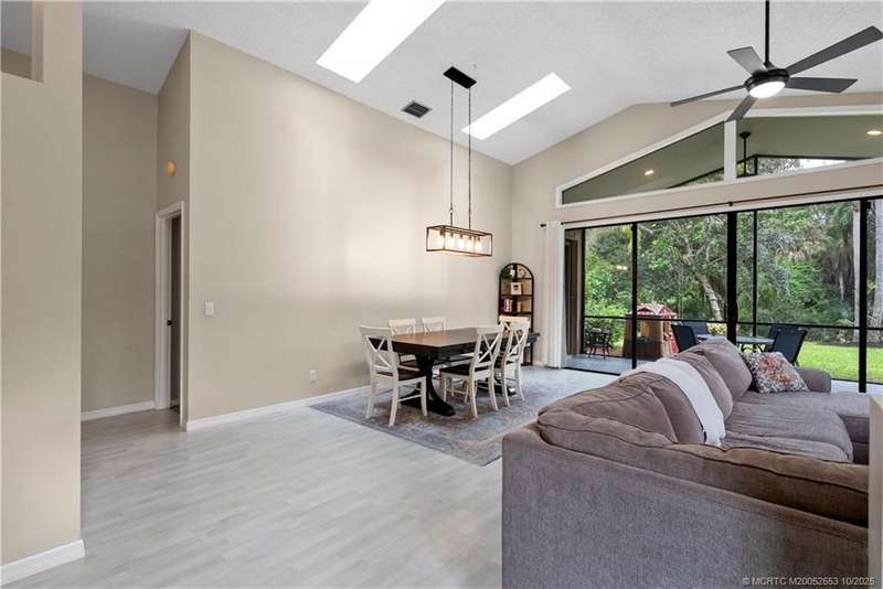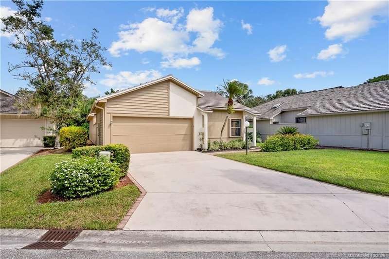 Welcome t? M?llard Cre?k, tu??k?d b?h??nd th? gates of Martin Down??! Th??s charming 3-bedroom, 2-bathroom split floor plan home is filled with natural light, enhanced by skylights that illuminate the open living and dining areas. The spacious living room features a custom entertainment wall with electric fireplace, perfect for cozy evenings. Primary suite has a gorgeous accent wall, new laminate flooring, walk-in shower, and direct access to the screened-in patio. Additional highlights include a large hallway closet, laundry room with extra storage, Accordion shutters, a Brand New concrete tile roof (September 2025), and a 2020 A/C with replaced coils. This light-filled home blends comfort, style, and functionality in one of the most desirable communities. Enjoy peace and privacy in this serene retreat overlooking the lush preserve in your own backyard. Optional memberships available at The Village Club & Preserve, allowing access to pools, tennis and pickleball, and much more.