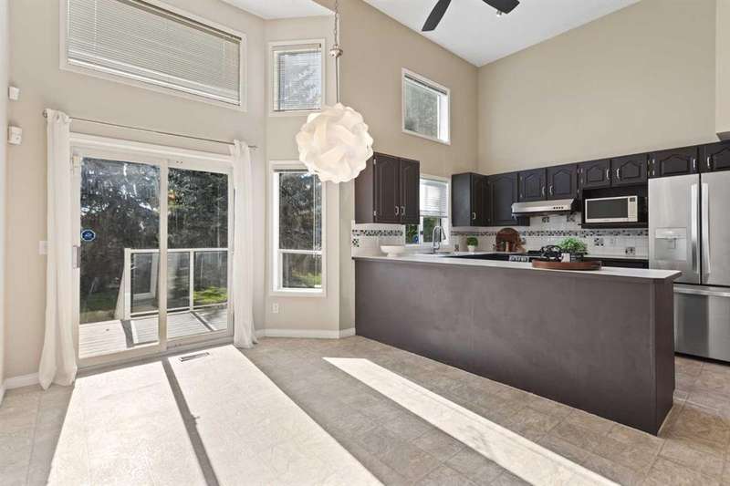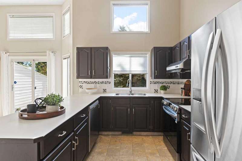 Welcome to this bright and spacious 3-bedroom, 2.5-bath end unit townhouse in the heart of Kingsland, backing directly onto peaceful green space. The main level showcases a stunning kitchen and dining area with soaring ceilings, expansive windows, and loads of natural light. The kitchen is equipped with stainless steel appliances, generous counter space, and plenty of storage—perfect for both everyday cooking and entertaining. Just a few steps up, the inviting living room features gleaming hardwood floors, a cozy gas fireplace, and large windows that create a warm, welcoming atmosphere. Upstairs, the oversized primary suite offers a walk-in closet and private ensuite, while two additional bedrooms and another full bathroom complete the top floor. The finished basement provides even more living space—ideal for a media room, home office, or workout area—along with ample storage. Recent updates include a newer furnace and hot water tank for peace of mind. Outside, enjoy your private deck overlooking mature trees and tranquil green space. The property also includes an attached single-car garage, adding everyday convenience and security. With its desirable location close to shopping, schools, parks, and transit, this Kingsland gem offers the perfect combination of space, style, and comfort.