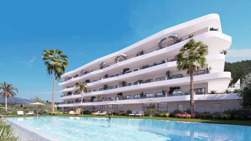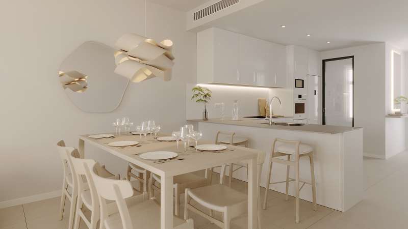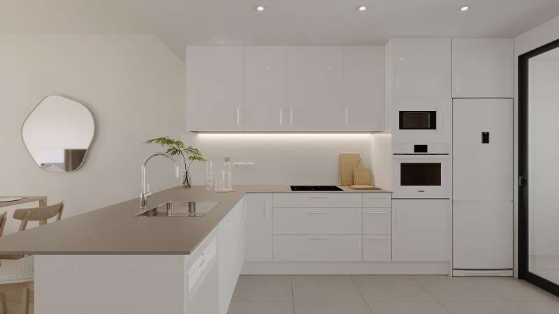 The homes for sale in La Nucia, Alicante consist of 2 and 3-bedroom apartments and penthouses, each with 2 bathrooms. Interiors feature open-plan living and dining areas filled with natural light, contemporary kitchens with central islands, and large terraces ideal for outdoor living. Penthouses offer private solariums with stunning views of the sea and mountains. All homes include a private garage, and the layouts focus on practicality, comfort, and bright, modern design.