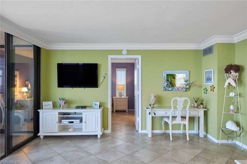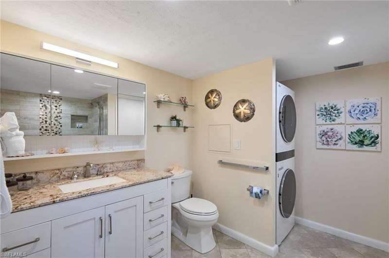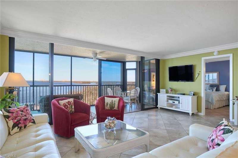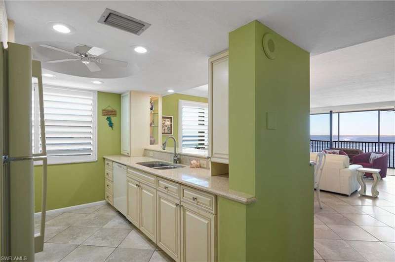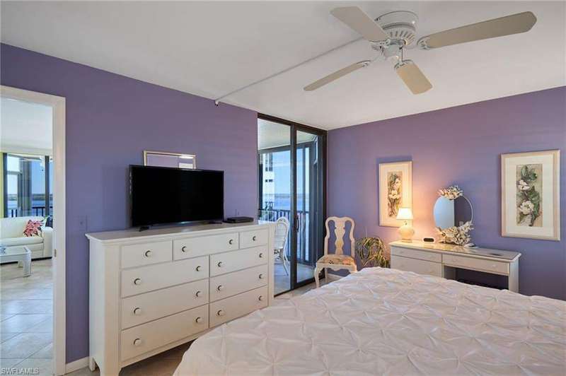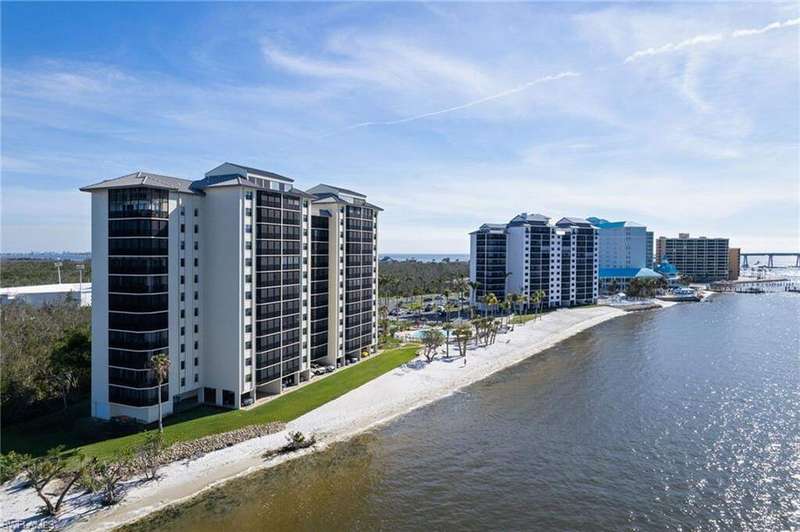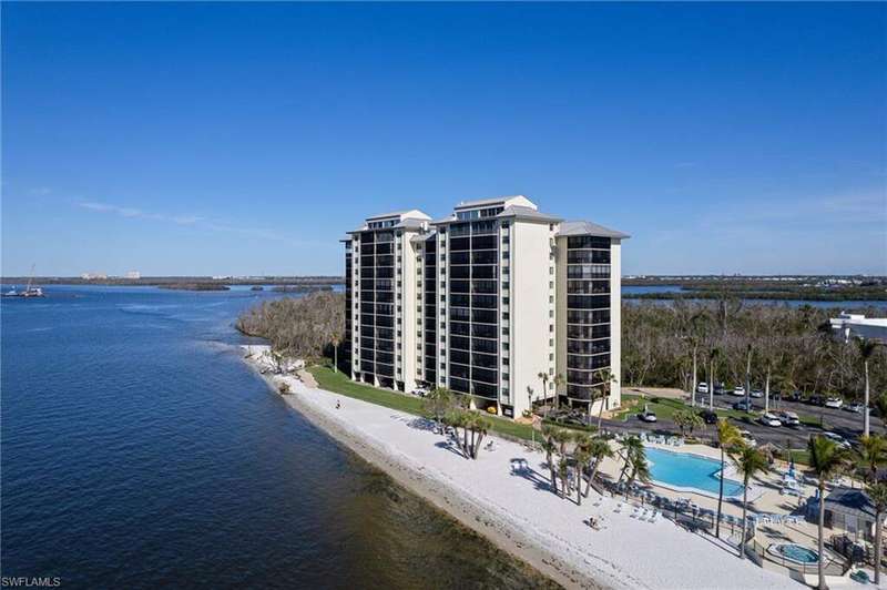 LOCATION AND LIFESTYLE, HAVE IT ALL at THIS BEACHFRONT CONDO! Absolutely stunning panoramic views of the San Carlos Bay from your large corner balcony equiped with two sets of sliding glass doors creating the perfect all-weather space you can enjoy any day you please. This 2 bed, 2 bath condo has many upgrades including new fridge in 2024, hurricane windows 2024, dishwasher 2021, primary bath remodel in 2021 moving the W/D to the bathroom and updated bedroom & lanai ceiling fans. As you enter you are greeted with the open living/dining area with floor to ceiling sliding doors on 2 walls allowing SWFL's warm sunlight and coastal breezes in. The large tile on the diagonal throughout provides easy maintenance. The vibrant colors and decor set the scene for the perfect coastal getaway. Sanibel Harbour Towers offers resort style living with its own beautiful pool or walk next door to the Marriott and enjoy several restaurants and bars! Marriott also offers a discounted membership to Sanibel Harbour Towers owners so you can enjoy their Spa & Fitness facilities, Tennis courts and indoor Pool!
