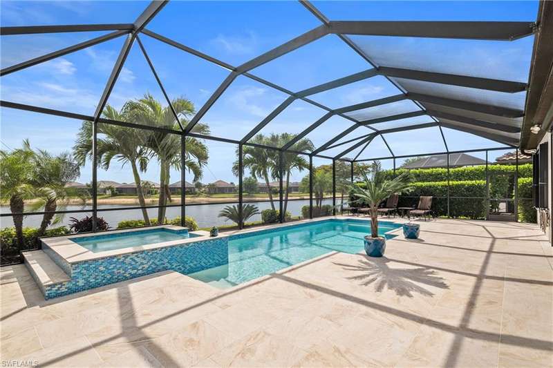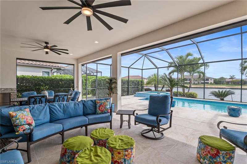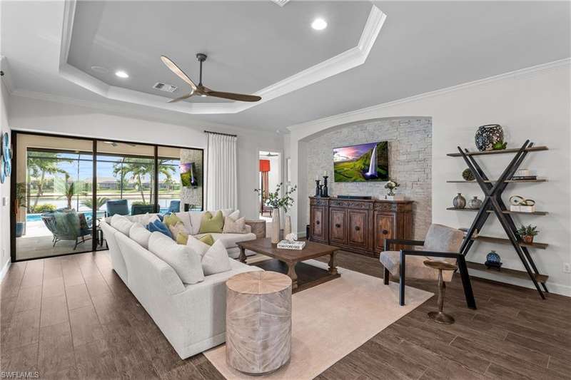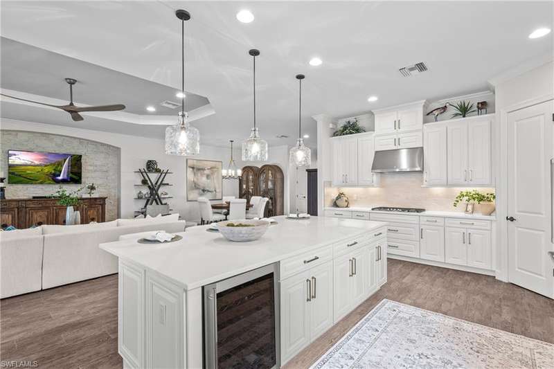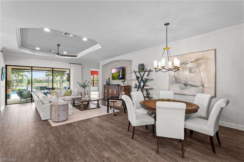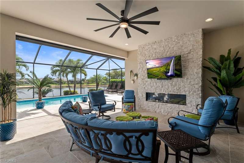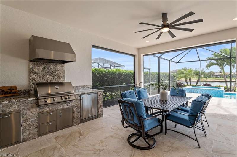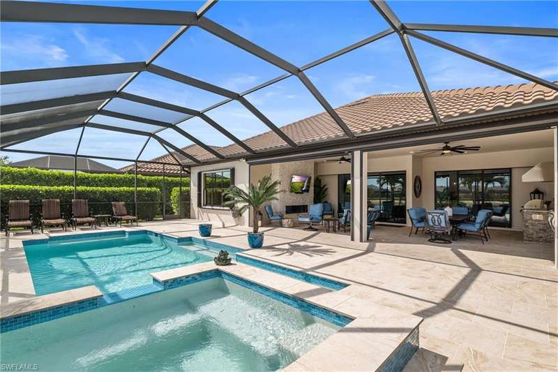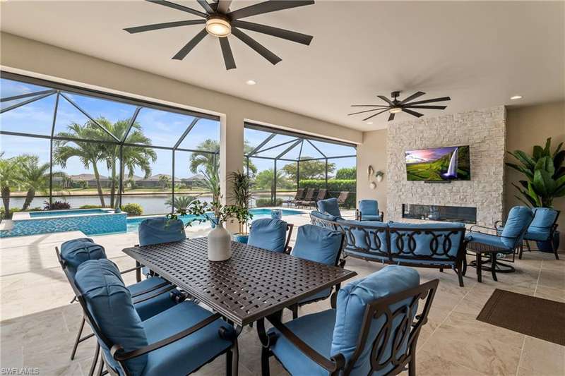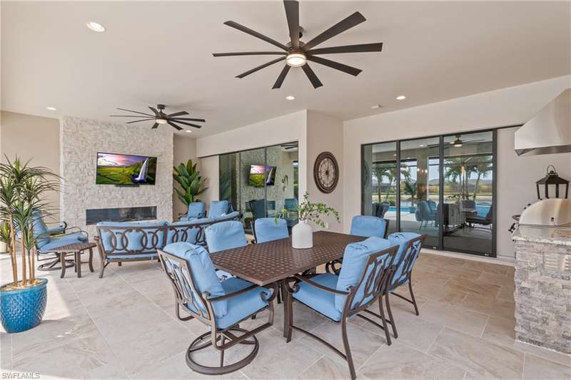 LIVE A VACATION LIFESTYLE IN ESPLANADE! FULL GOLF MEMBERSHIP INCLUDED! Step into this beautifully appointed Palazzio model home, offering 3 spacious bedrooms, a dedicated den, 3 full bathrooms, air conditioned 2 car garage, and nearly 3000 sq ft under air. With oversized rooms throughout, the open great room floorplan creates a seamless flow for entertaining and comfortable living. Two sets of pocketing sliding glass doors invite you to the expanded lanai, where you can enjoy picturesque wide lake views and SOUTHERN EXPOSURE, making this outdoor space an absolute retreat. The private pool area boasts a gas-heated saltwater pool with a raised spa, complete with new pool tile and porcelain decking. For those who love outdoor living, the lanai is equipped with an outdoor kitchen, a feature wall with an LED fireplace, and an electric motorized roll-down hurricane screen, ensuring year-round enjoyment. Inside, the home features beautiful wood-look plank tile throughout the living area