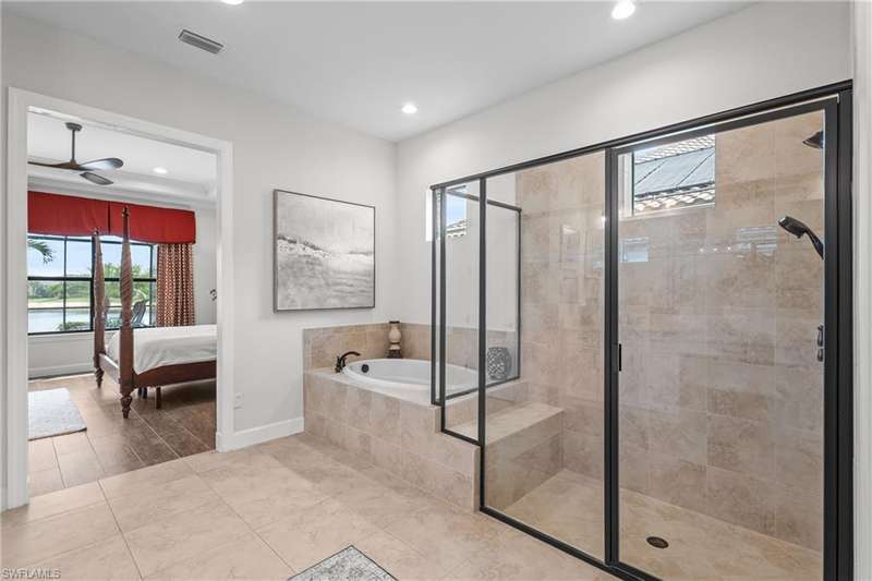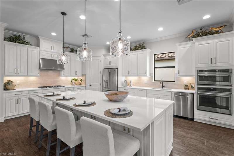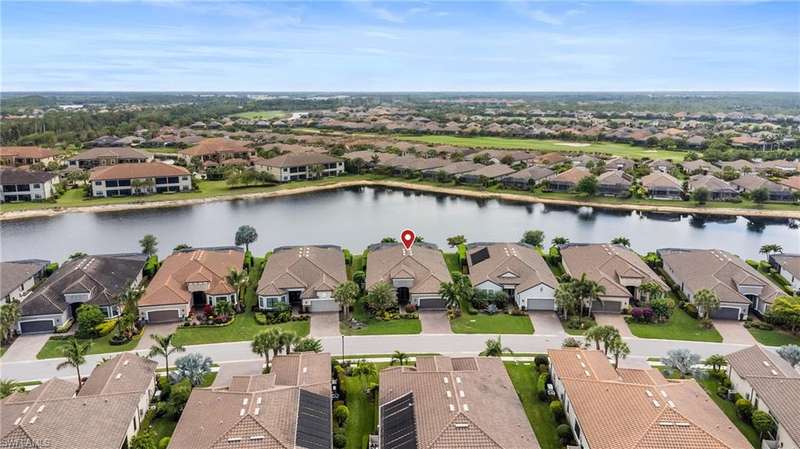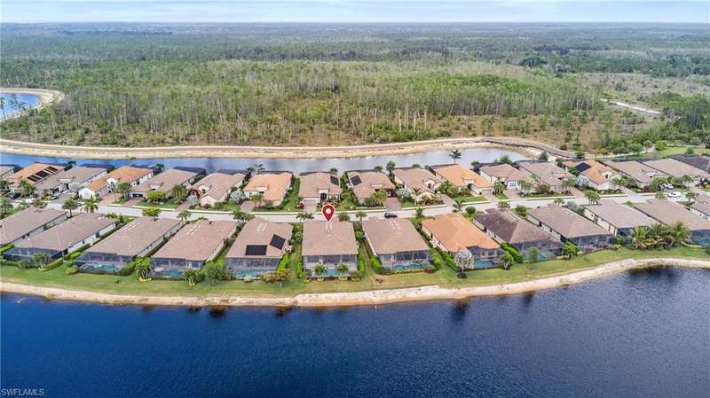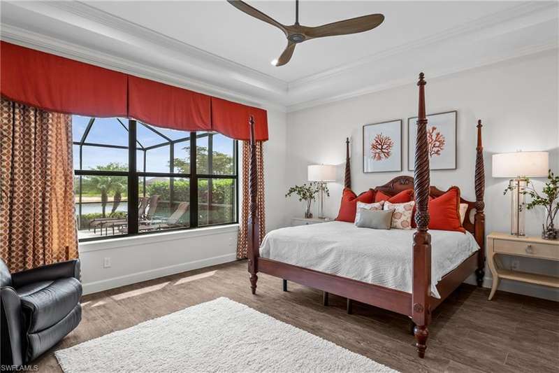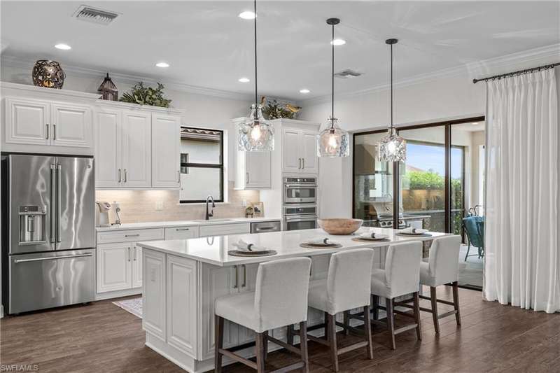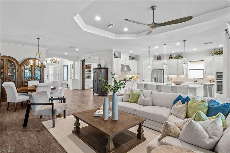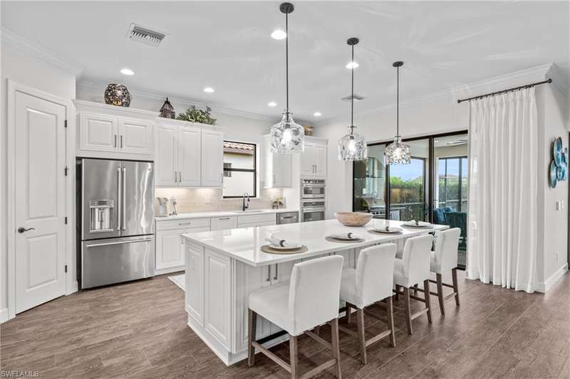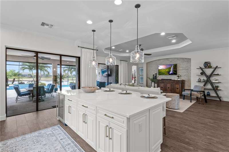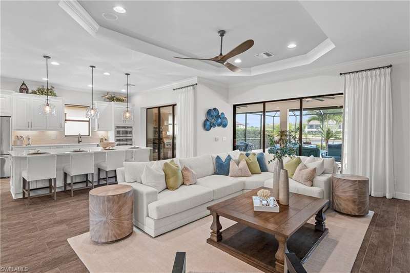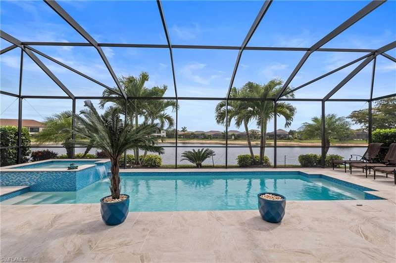 LIVE A VACATION LIFESTYLE IN ESPLANADE! FULL GOLF MEMBERSHIP INCLUDED! Step into this beautifully appointed Palazzio model home, offering 3 spacious bedrooms, a dedicated den, 3 full bathrooms, air conditioned 2 car garage, and nearly 3000 sq ft under air. With oversized rooms throughout, the open great room floorplan creates a seamless flow for entertaining and comfortable living. Two sets of pocketing sliding glass doors invite you to the expanded lanai, where you can enjoy picturesque wide lake views and SOUTHERN EXPOSURE, making this outdoor space an absolute retreat. The private pool area boasts a gas-heated saltwater pool with a raised spa, complete with new pool tile and porcelain decking. For those who love outdoor living, the lanai is equipped with an outdoor kitchen, a feature wall with an LED fireplace, and an electric motorized roll-down hurricane screen, ensuring year-round enjoyment. Inside, the home features beautiful wood-look plank tile throughout the living area