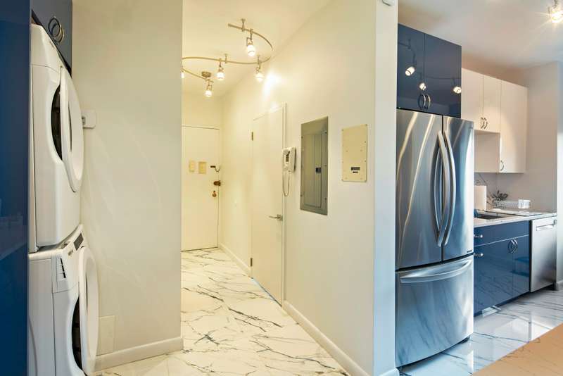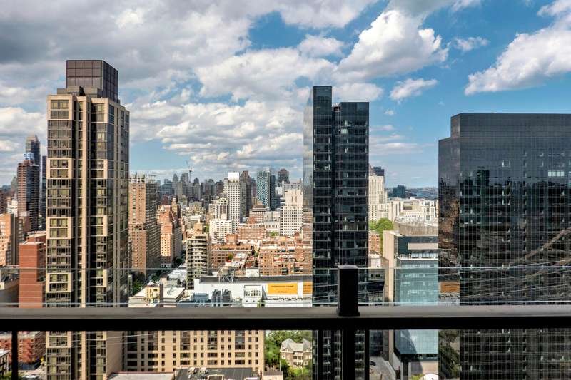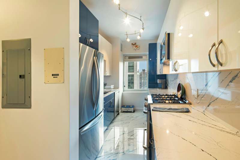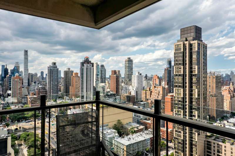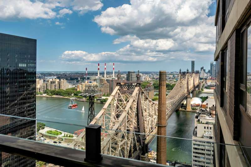 Enter this magnificent, light filled home through a marble gallery with a north facing living room and balcony and a south facing formal dining room with views of the city skyline including the Chrysler Building. The windowed kitchen has been totally renovated with blue and white custom cabinetry and ; porcelain floors and backsplash. There is an additional prep sink and a washer and dryer. The primary bedroom has a luxurious bath with a large walk in shower. ; There are abundant closets and spectacular south and west views. ; There are an additional two bedrooms and baths as well as a powder room.