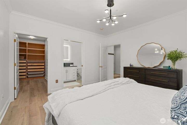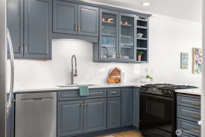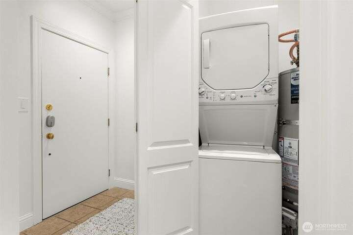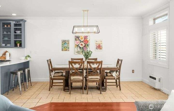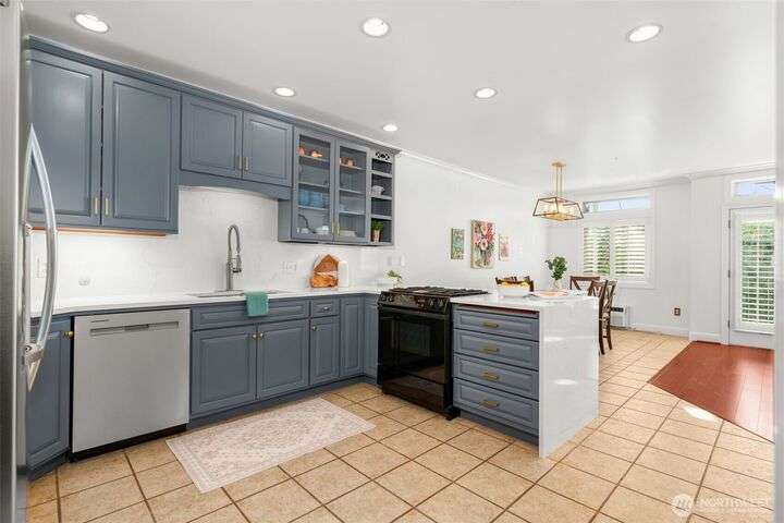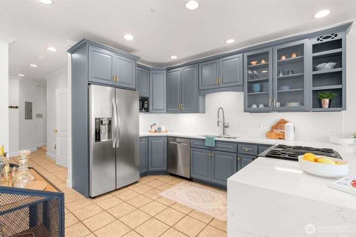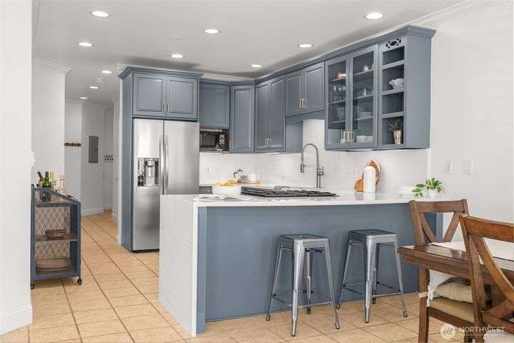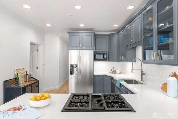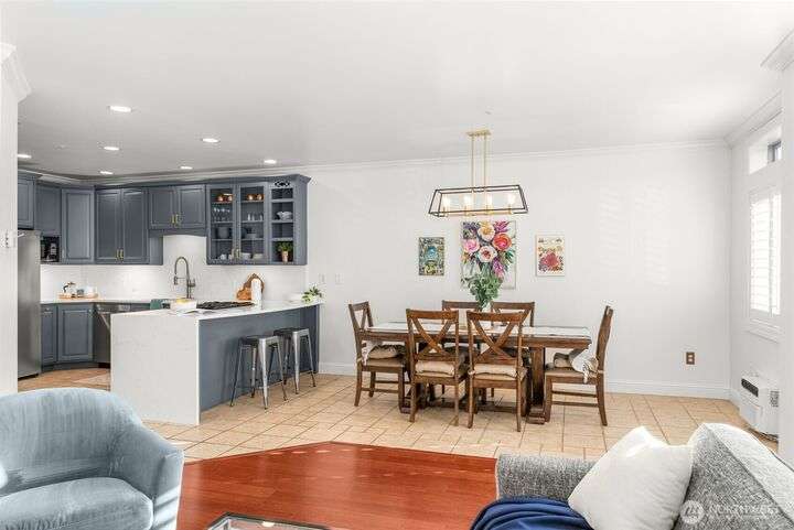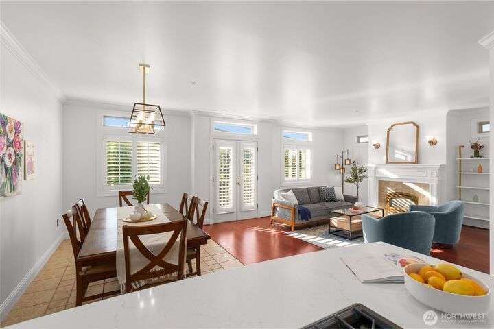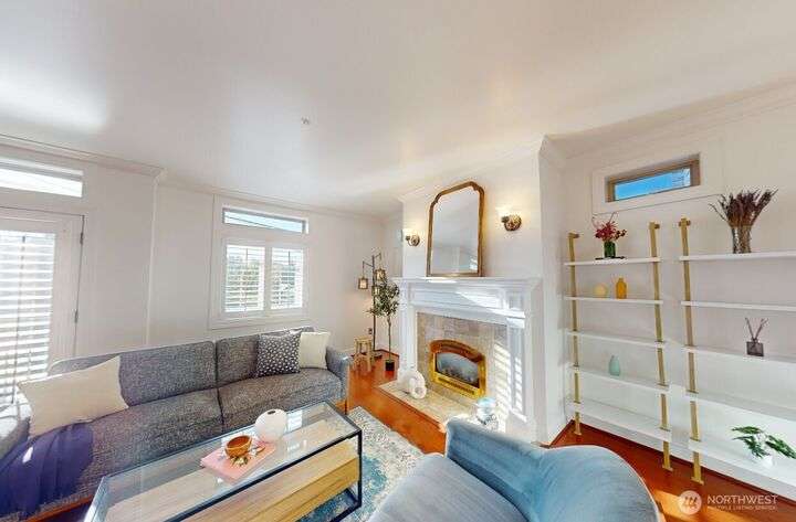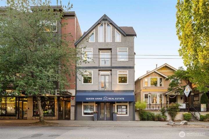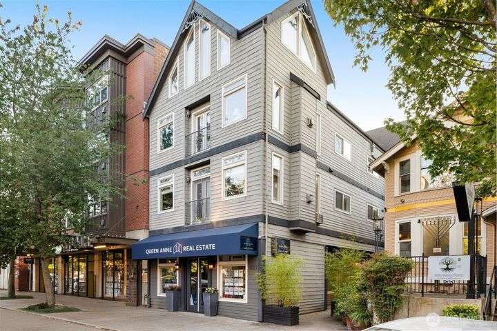 Stunning end unit showcasing designer spaces in a boutique building on the top of Queen Anne! Sited on the Avenue yet unit is in the quiet back half of the building. Spacious floorplan opens to Living room w 9' ceiling height, statement gas fireplace, oversized windows & west-facing Juliette balcony. Open kitchen design: chefs workspace includes newer cabinetry, slab counters with waterfall peninsula. Dining room can fit a real table w effortless connectivity to both living & kitchen. Primary suite has walk-in closet & it's own 3/4 bath. Elevator, garage parking, storage unit, updated/refreshed baths, laundry in-unit & AC. Unparalleled top of QA location w a plethora of amenities right out your front door. Truly a cherished opportunity!