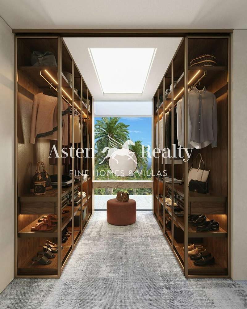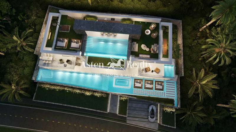 The house has two swimming pools, one of which is located on the ground floor and is 18 meters long, with a sun lounger area and jacuzzi built into the water surface, creating a single water surface 36 meters long.The 2nd pool is located on the roof top floor. There are 3 areas on the roof top floor: a central one with an 8 m long pool, a barbecue area, a large dining area shaded by a pergola and equipped with its own toilet and lift. The right wing has a lounge area with sofa and fireplace, while the left wing has a sunbathing area with spacious sunbeds and shower.