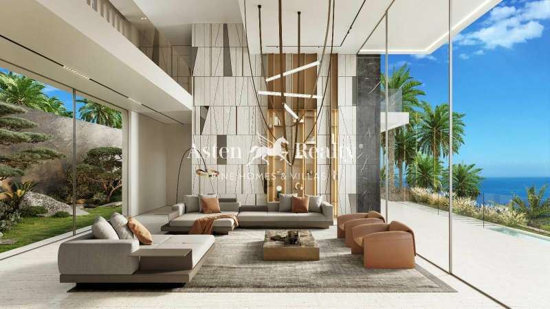 Balancing this composition, the luxurious master bedroom with a jacuzzi on its own terrace is located on the other side, offering panoramic views of the golf courses drenched in greenery, with the vast ocean as a backdrop.
