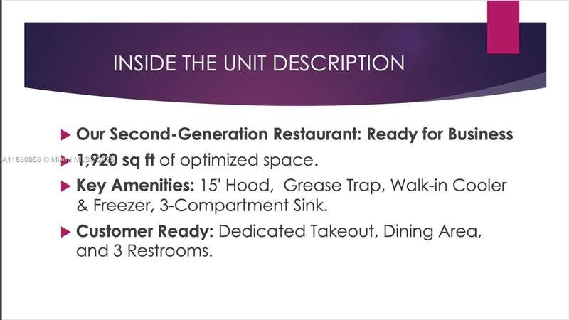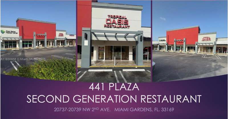 Our Second-Generation Restaurant: Ready for Business 1,920 sq ft of optimized space.Key Amenities: 15' Hood, Grease Trap, Walk-in Cooler & Freezer, 3-Compartment Sink.Customer Ready: Dedicated Takeout, Dining Area, and 3 Restrooms.441 Plaza: High Traffic, Easy Access Constant Walk-ins. Ample Parking. A Truly Busy Plaza.Community Profile:Miami GardensPopulation: Approx. 111,000 residents (2023).Diverse Community:Predominantly African American (around 62%) with a significant Hispanic population (around 34%), including strong Caribbean influences.Median Household Income:Around $61,000 (2023).Age:Median age of approx. 38 years.Workforce:A working and middle-class community.Foreign-Born:Around 37% of residents are foreign-born, indicating a vibrant multicultural presence.
