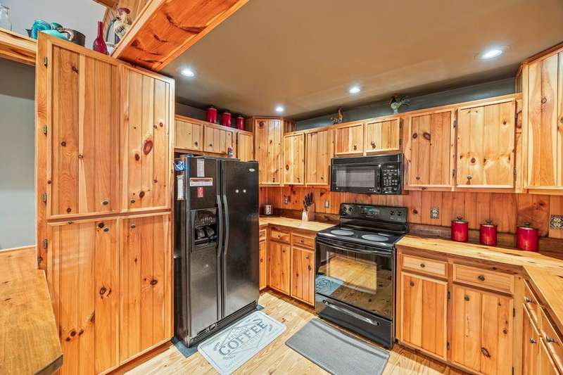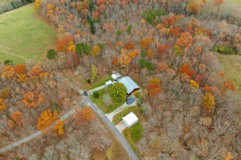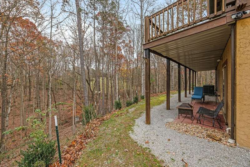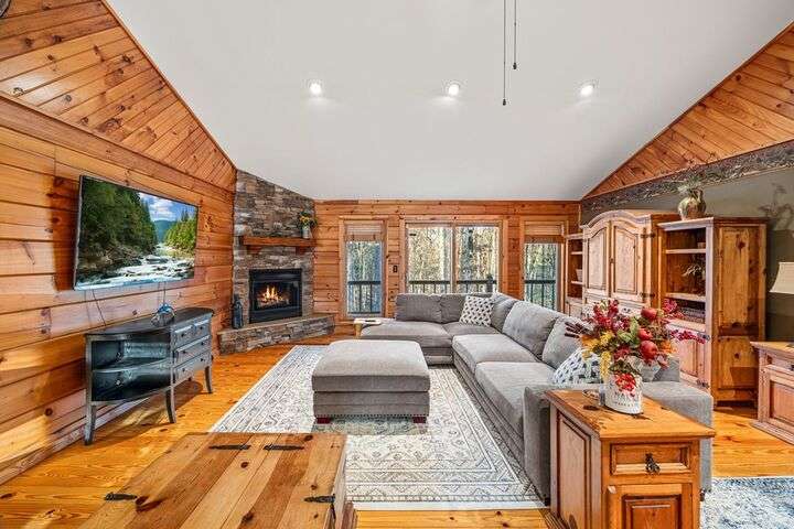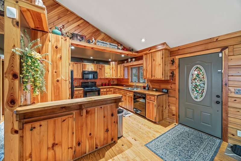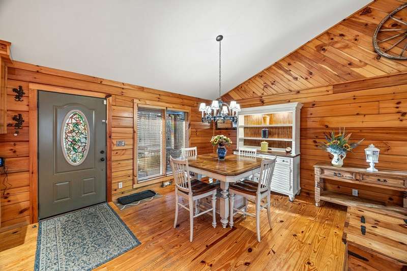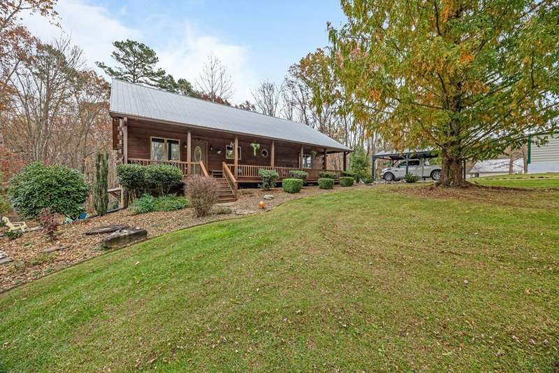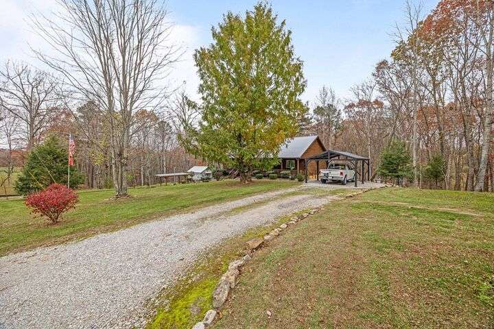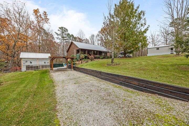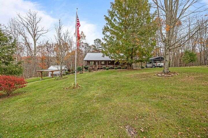 Escape to the tranquility of this beautifully maintained log cabin with a walk-out basement, nestled at the end of a quiet dead-end road. Surrounded by 300 acres of rolling pastureland, this home offers unparalleled privacy, charm, & scenic beauty. With only 5 homes on the street & located on unrestricted land, this property offers a rare combination of seclusion & convenience, just minutes from Jamestown, local schools, & the amenities of the Upper Plateau region. The main level welcomes you with a spacious open floor plan, soaring cathedral ceilings, & a cozy natural gas log fireplace, perfect for gatherings or quiet evenings. The well-appointed kitchen features plenty of cabinetry, making it ideal for everyday living or entertaining. The main level also includes a primary bedroom with ample closet space, an additional room with a closet that could function as an office or second bedroom, and large windows that flood the space with natural light while showcasing stunning views.