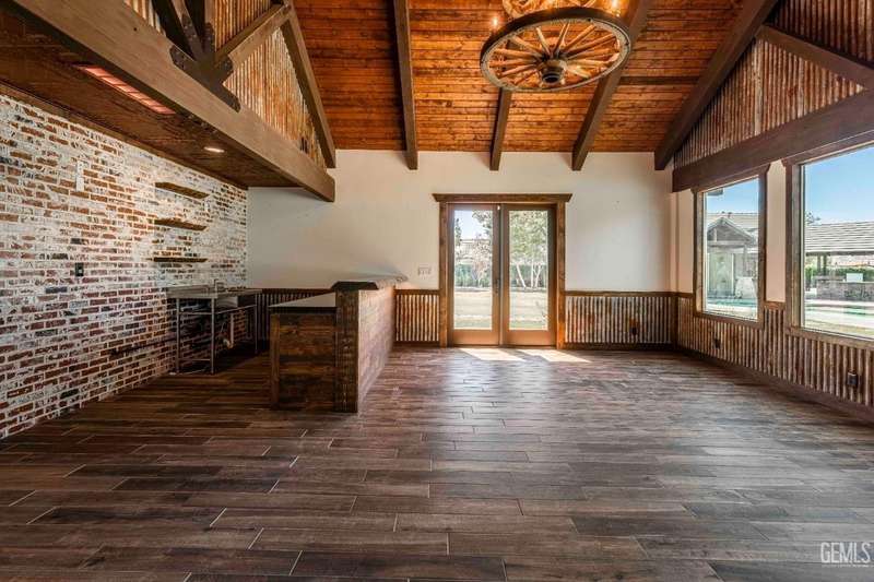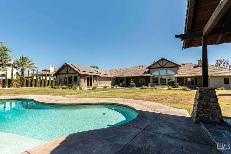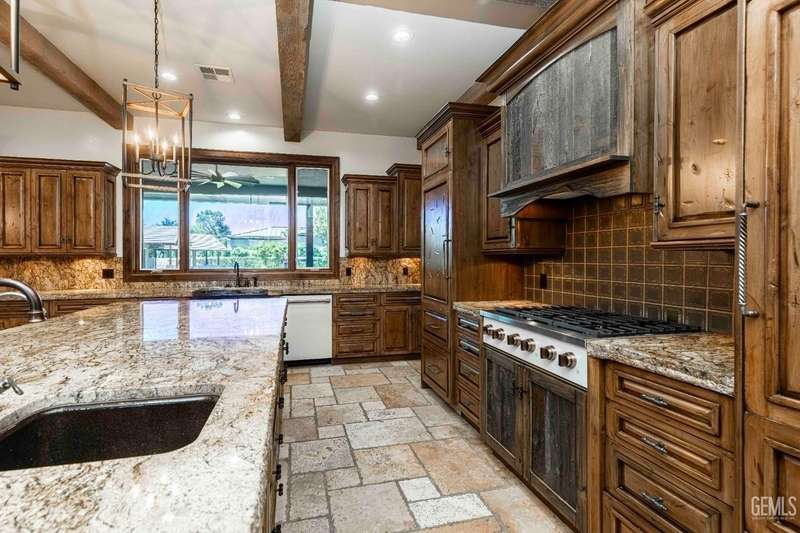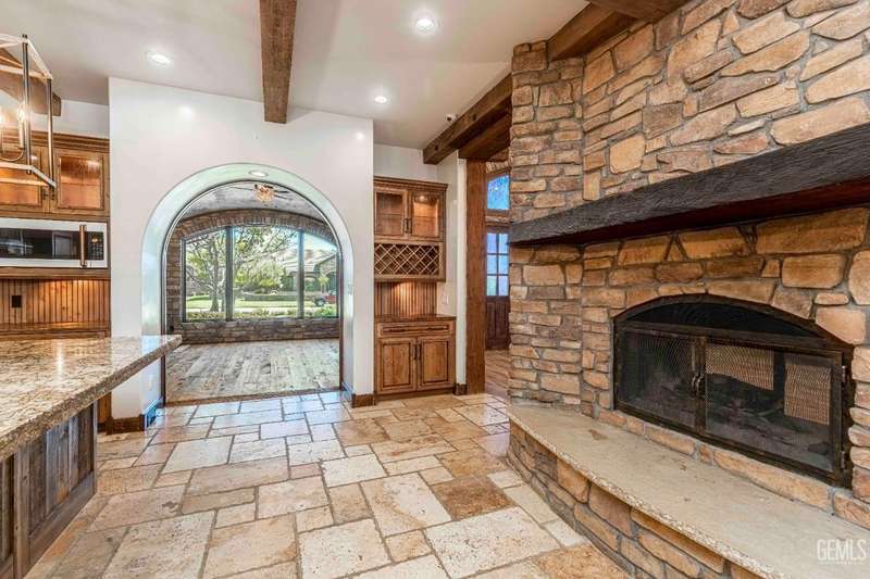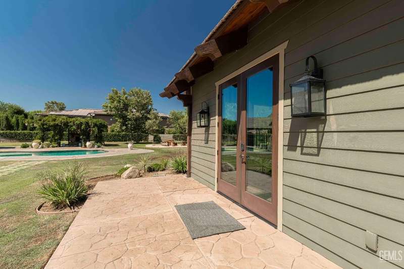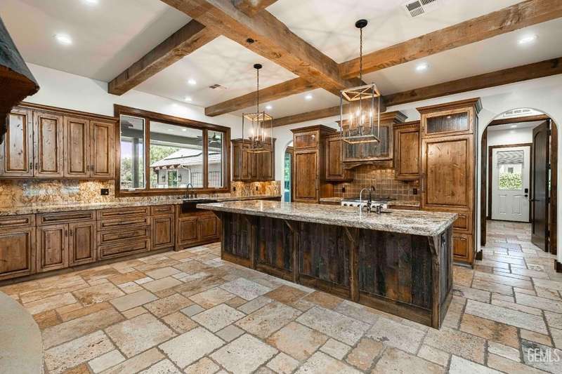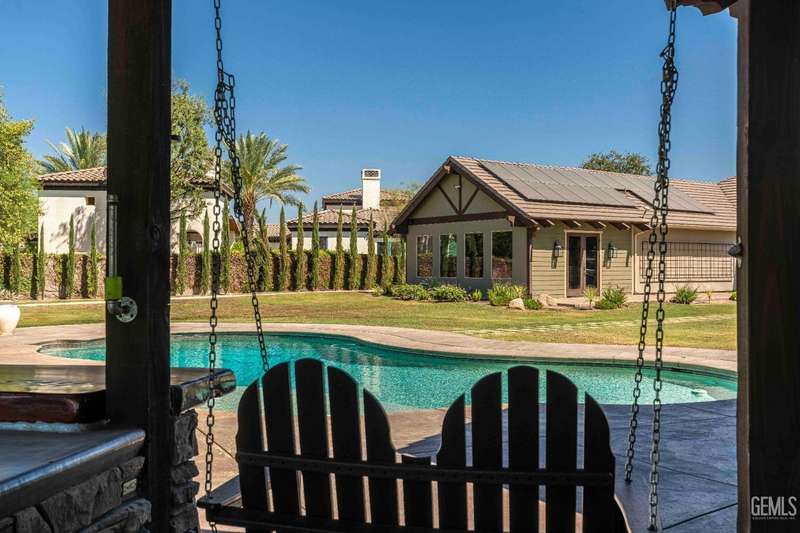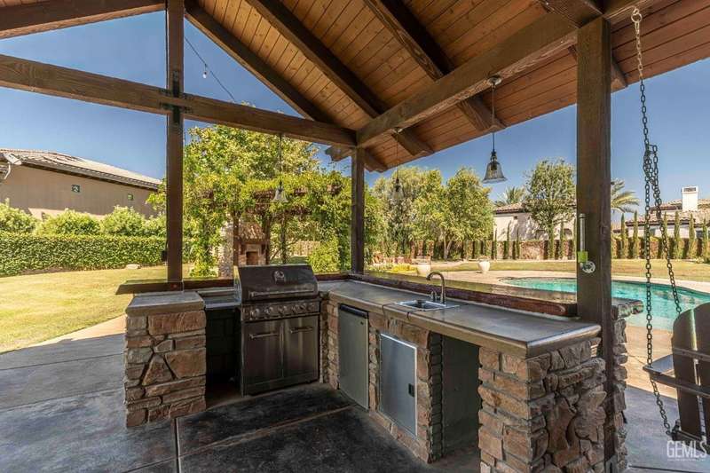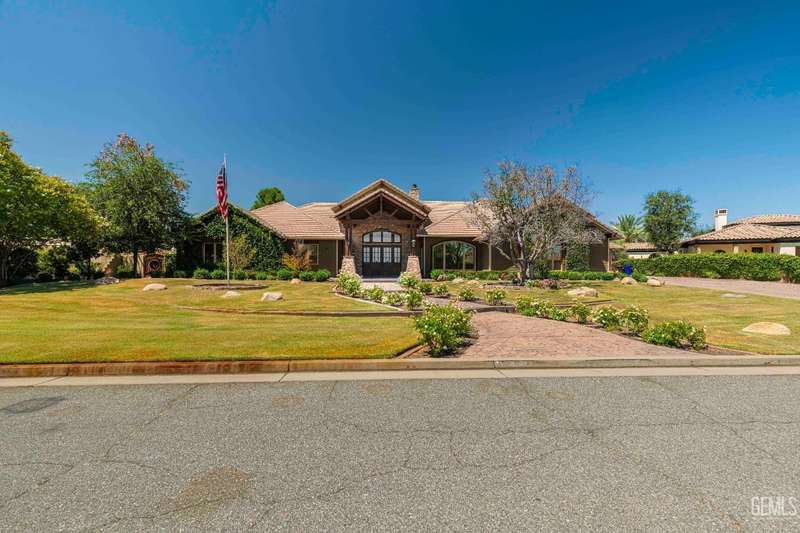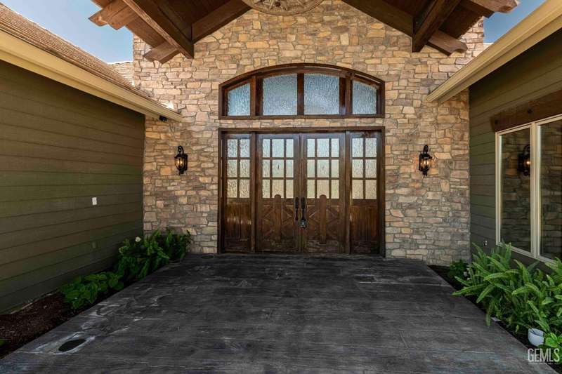 A luxurious blend of rustic elegance and refined living, this private 1-acre estate stuns w/ a Hunting Lodge-style exterior and Tuscan-inspired interior finishes. A dramatic stone faade, exposed beams, and lush landscaping set the tone, while inside, soaring vaulted ceilings, hand-hewn wood details and arched windows create warmth and sophistication. The majestic great room boasts a floor-to-ceiling stone fireplace and expansive views. The chef's kitchen is richly appointed w/ chiseled granite counters, travertine tile flooring, custom cabinets and professional quality appliances. An attached game room w/ bar offers endless versatility. Detached guest house w/ a full bar and outdoor covered BBQ w/ bar seating makes entertaining effortless. Additional amenities such as a sparkling pool, outdoor fireplace, 6-hole putting green, a fire pit and a huge, covered patio help to create a home which provides resort-style living, redefined.