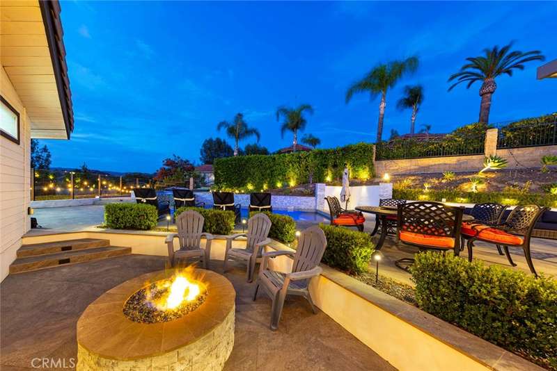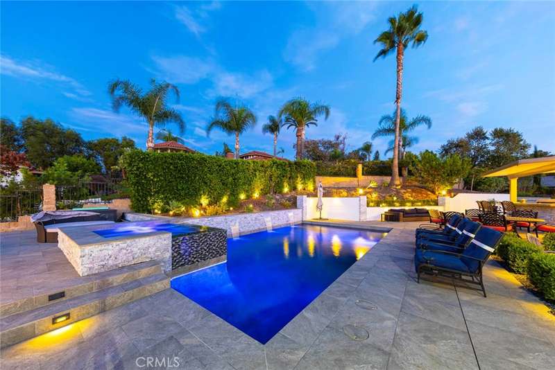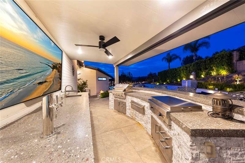 Step outside to discover an entertainer's dream yard, featuring resort-style amenities: wraparound Trex decking with lighting, multiple entertaining areas, a rose garden, saltwater pool & spa, and an outdoor kitchen complete with BBQ grill, double keg dispenser, fridge, sink, ample storage, and high-end True appliances, a gas fireplace, outdoor shower and bathroom, and landscape lighting.