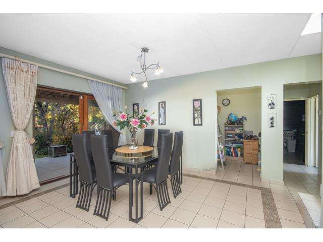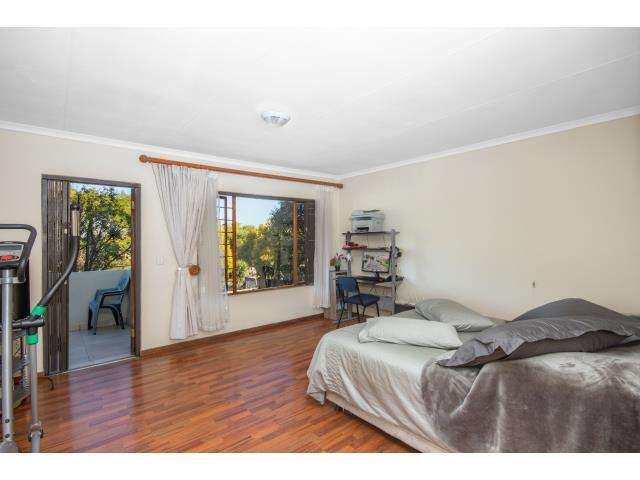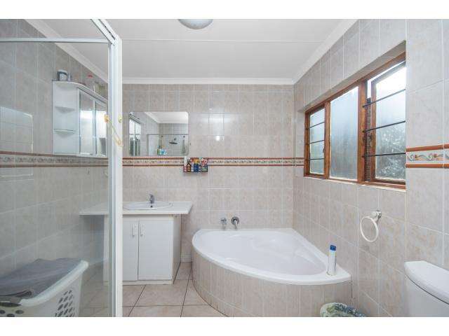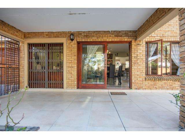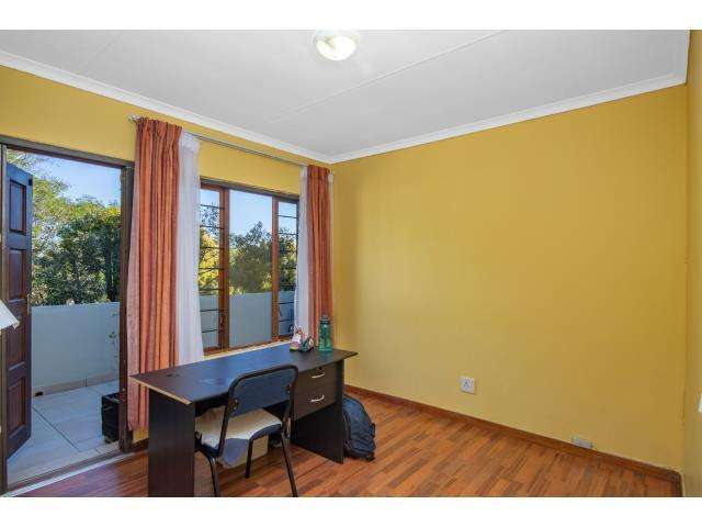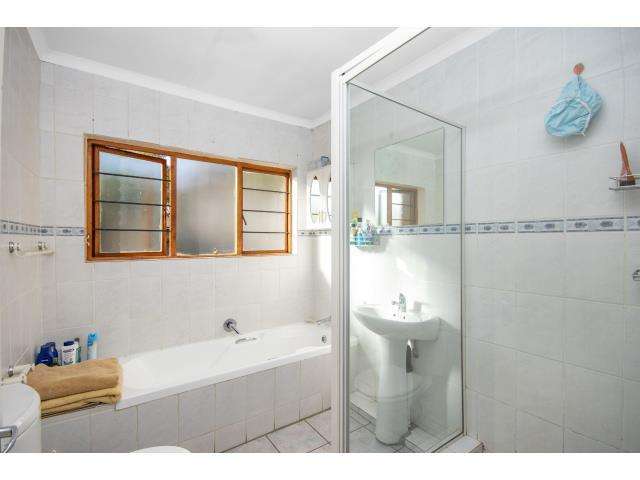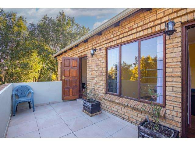Up the stairs are 3 double bedrooms that share a full bathroom. This bathroom has a bath, shower, loo and basin. The one bedroom leads onto the balcony. At the end of the passage is a very large main bedroom en suite with a dressing area. This bathroom consists of a corner bath, shower, loo and basin.This bedroom also leads onto the balcony with views over the trees. The complete the picture there is a security gate at the top of the stairs if people feel vulnerable when sleeping.