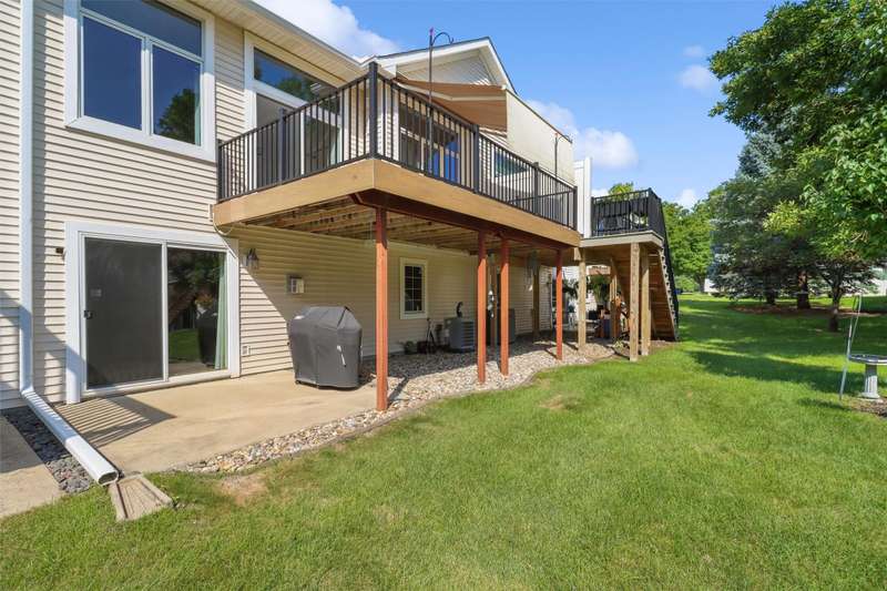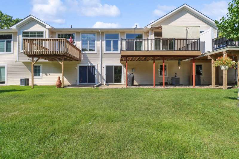 Sold before it came on the market (but now back on the market). Outstanding 1.5 story walkout townhome in Johnston offering both a 1st floor master bedroom and a laundry. Backs to the quiet privacy of a greenbelt behind. Remodeled kitchen (2022) featuring granite tops, tile backsplash, under/above cabinet lighting, roll-out shelving, and SS appliances. Walkout offers a northern feel with knotty pine touches, wood ceiling beams, log wainscoting, stone fireplace, and more. Roof replaced in 2025. Shaded east-side concrete patio and large composite deck (compete with an auto-awning with a privacy screen). Flexible loft offers multiple uses (office, extra bedroom, etc.). Other features include a vaulted ceiling, central vac, security system, wood flooring, and a bath per floor. Just back on the market and ready for a new buyer (PERHAPS YOU!). Dont delay in scheduling your showing!