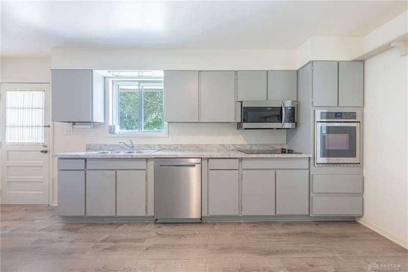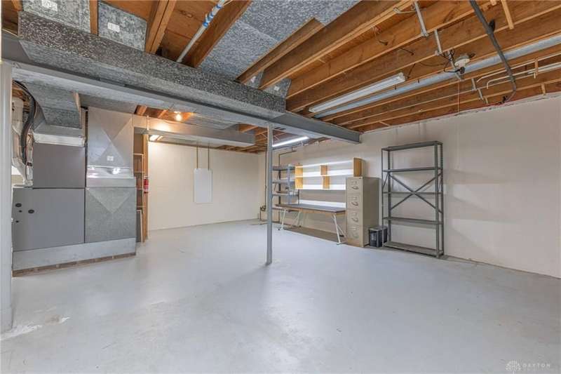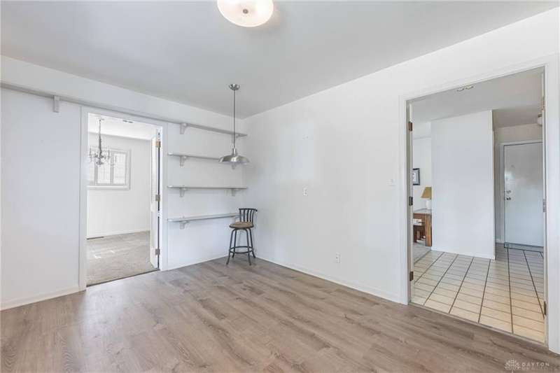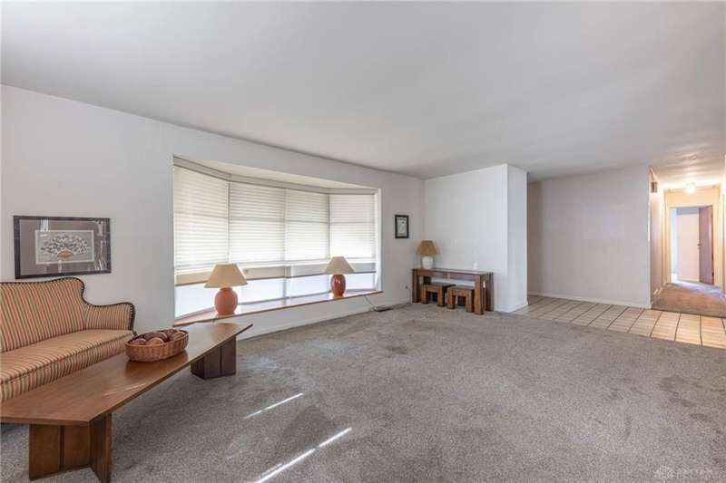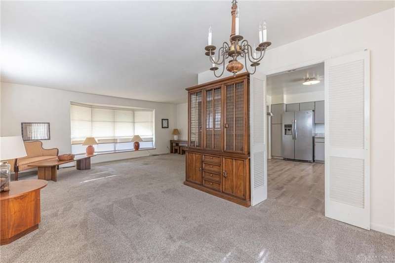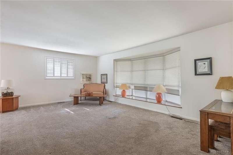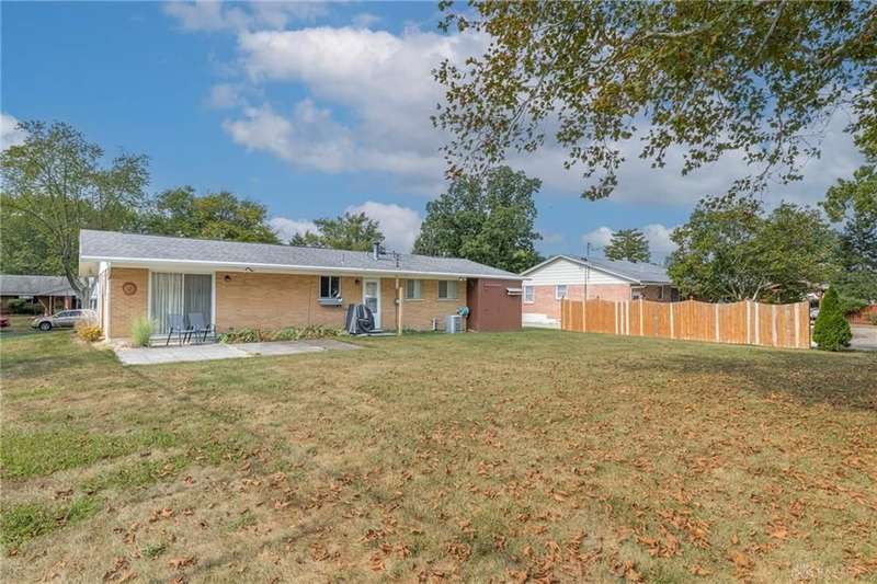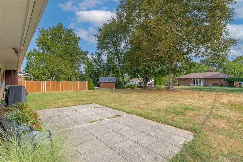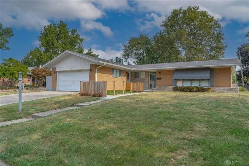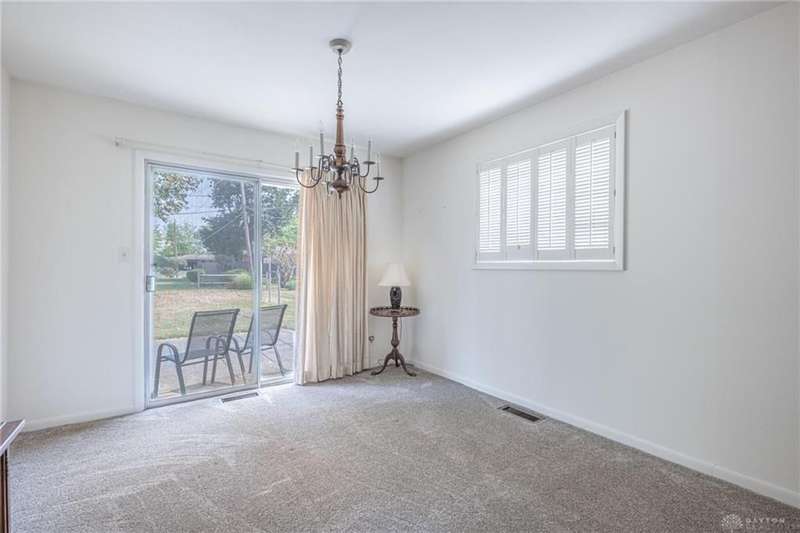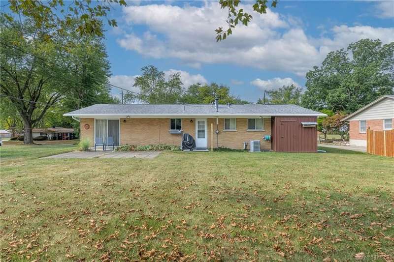 Step into this beautifully maintained ranch offering an abundance of natural light throughout. The spacious living room features three elegant bay windows with classic shutters, creating a warm and inviting atmosphere. The dining room opens through sliding glass doors to a lovely patio area—perfect for outdoor dining and entertaining. Enjoy a beautifully landscaped backyard adorned with established perennials, plus the convenience of attached storage sheds for all your gardening and outdoor needs. The eat-in kitchen showcases modern gray cabinetry, stainless steel appliances, and stylish open display shelving—ideal for both cooking and entertaining. Curb appeal abounds with attractive canvas awnings highlighting the home's welcoming front, complemented by a newly installed sidewalk leading to the front door. The garage includes built-in shelving and a workbench, perfect for projects and extra storage. Downstairs, the expansive basement offers ample shelving and a flexible open layout—ideal for a game room, home theater, or entertainment space. Recent Updates for Peace of Mind: New furnace installed in November 2022. Hot water heater replaced in February 2021. Roof replaced in April 2012. Located in a sought-after neighborhood in Kettering close to shopping, dining, and everyday conveniences, this move-in ready home is a must-see!