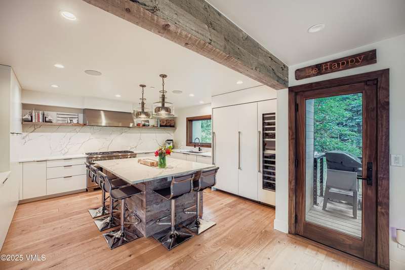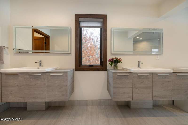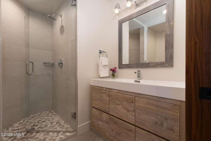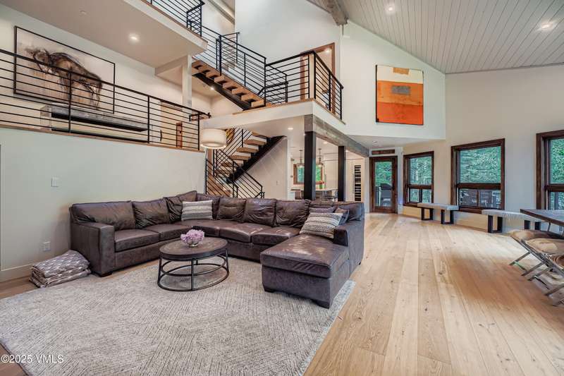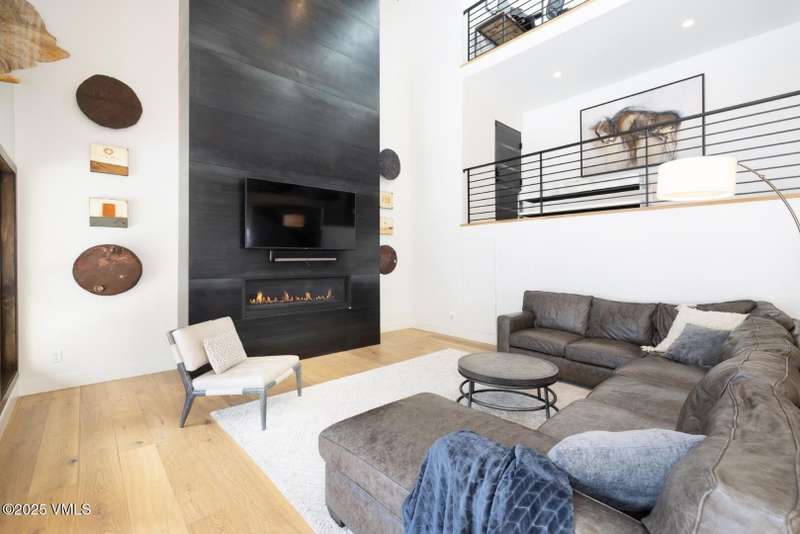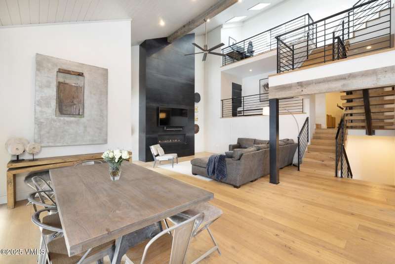 Step into this beautifully remodeled home that offers an open concept main floor, where living and dining areas seamlessly blend under soaring vaulted ceilings with the kitchen. Expansive windows flood the home with natural light, creating a cozy and inviting atmosphere. The living room is perfect for entertaining or relaxing, complete with white oak wide-plank floors and a floor-to-ceiling fireplace. From here, take in the breathtaking views of the waterfall and ice climbing area - the perfect backdrop for your elevated mountain lifestyle. The kitchen is a chef's dream with its functional layout, high-end appliances and large island. Wood beams and iron railings add character and coziness to its design. The voluminous family room was designed where family and friends can gather to watch the big game or movies and is spacious enough for work out equipment. Upstairs, enjoy a lofted office space with skylights, offering a bright and inspiring work environment. The primary suite is a true retreat, featuring his and hers closets with custom built-ins for storage and organization. The primary bath has abundant natural light and features a water closet, two separate vanities, luxurious soaker tub, and over-sized shower with dual rain heads. Three spacious bedrooms are located downstairs, each with its own en suite bath, offering ultimate comfort and privacy for family members or guests. For added convenience, the home also features two separate laundry areas, and mudroom with abundant storage, ideal for all of your gear. The two-car attached garage with epoxy flooring provides space for vehicles and additional storage. The home's unique design ensures fabulous privacy- the garage is the only common area between the duplex.