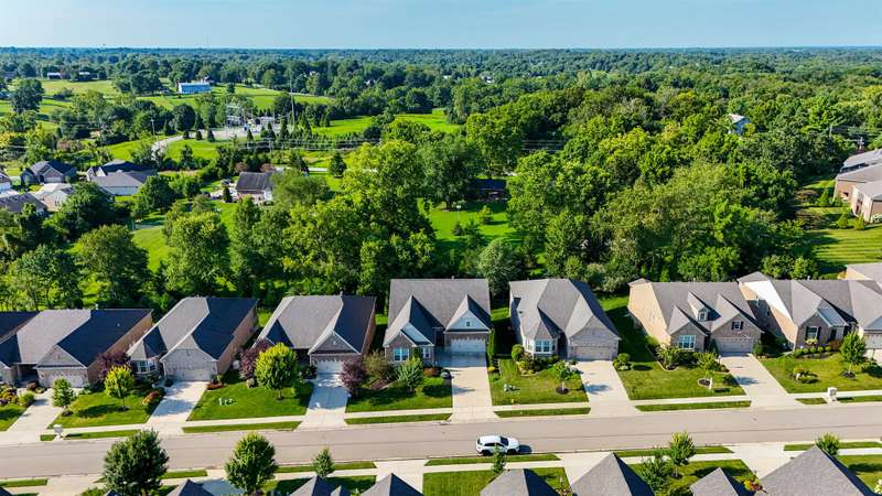 Enjoy carefree patio home living in the desirable Triple Crown community! This beautifully appointed home boasts a rare 3-car garage and is perfectly positioned on a wooded walk-out lot. Inside, you'll find a gourmet kitchen with quartz countertops, a stylish tile backsplash, and stainless steel appliances, including the refrigerator, which stays with the home. The finished lower-level rec room with a wet bar is perfect for entertaining, while the luxurious owner's suite offers a spa-like shower for ultimate relaxation. For added convenience, the washer and dryer are also included, making this home truly move-in ready.