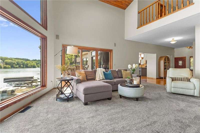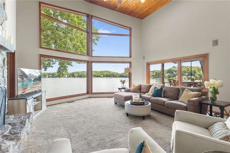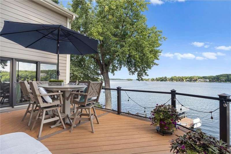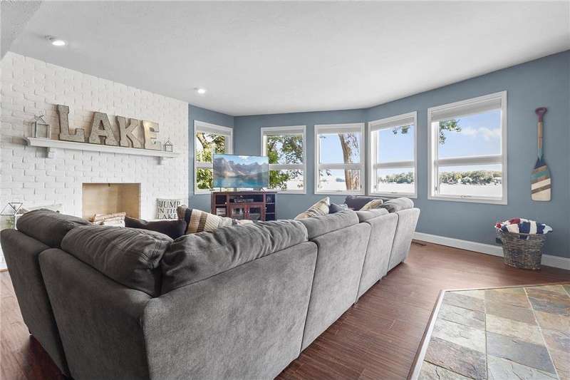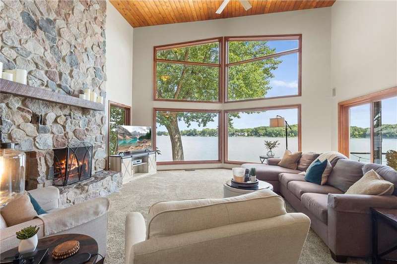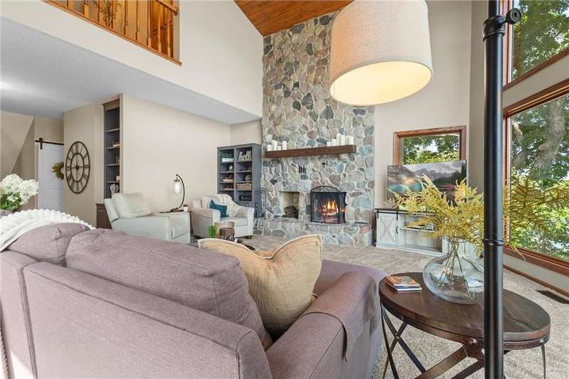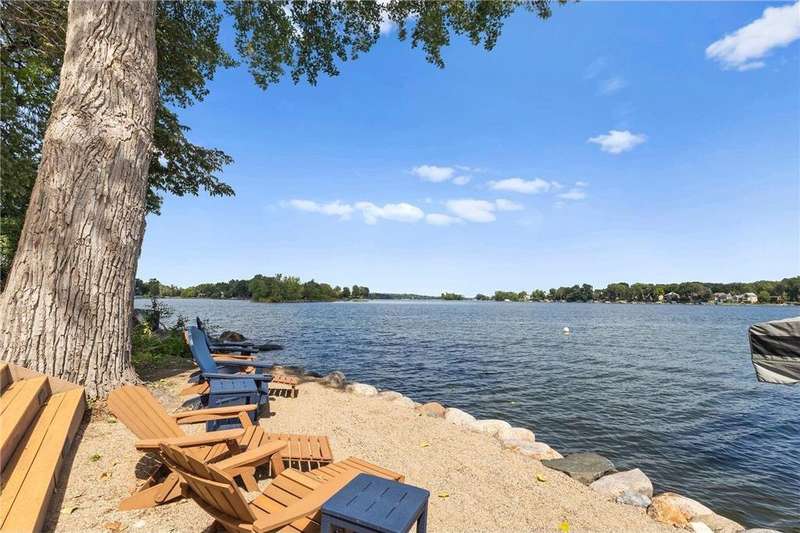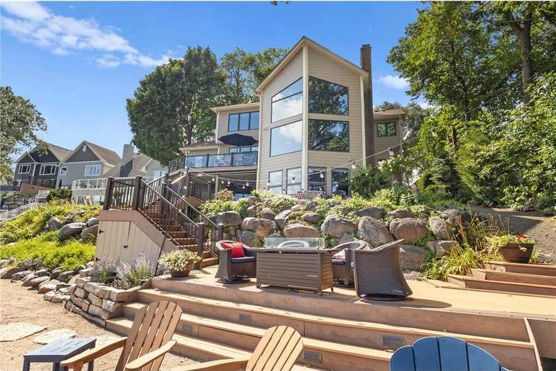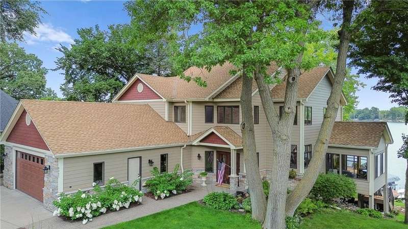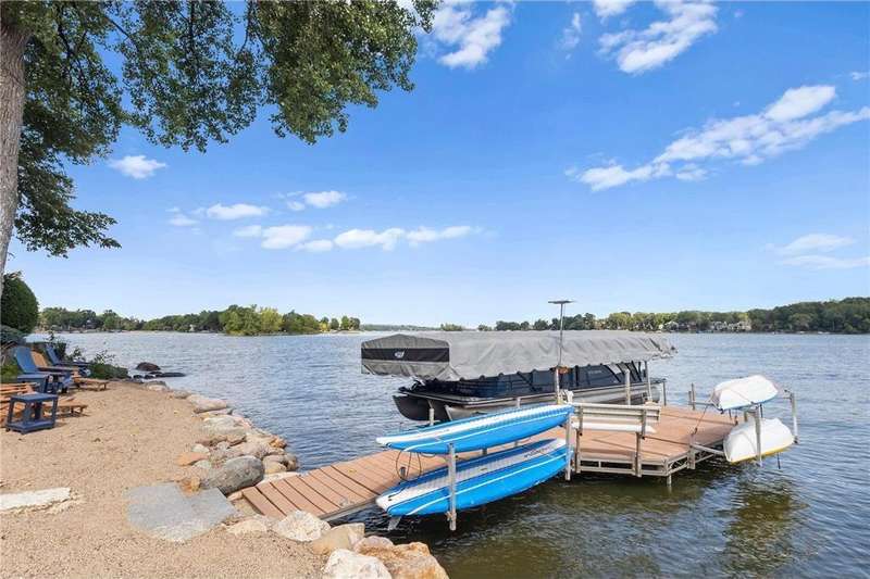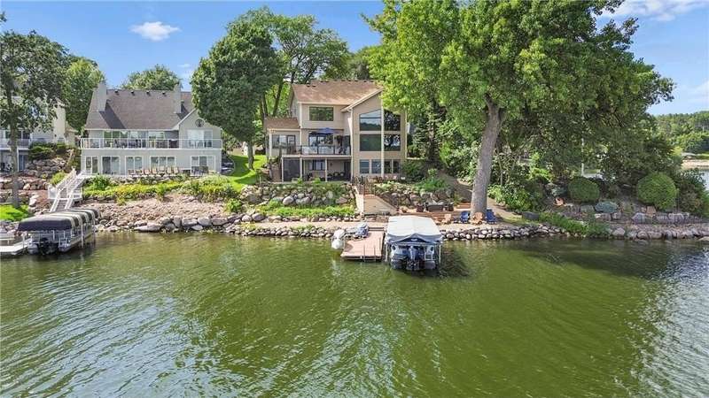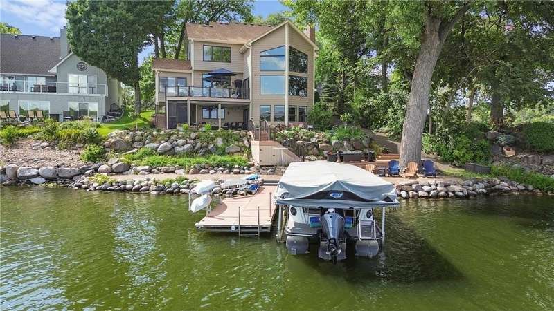 Spectacular lakeshore retreat with 99 feet of sandy shoreline and panoramic sunrise views! Nestled in a premier location on the lake, this walkout two-story home offers an incredible vantage point for 4th of July fireworks, big water views, and peaceful privacy. The heart of the home features a dramatic two-story great room with expansive windows that frame the lake and fill the space with natural light. Multiple levels provide versatile entertaining spaces, including a three-season porch, perfect for morning coffee or evening gatherings. Whether you're lounging by the shore, taking in the sunrise, or hosting family and friends, this property is designed for year-round enjoyment of lake life. Don't miss this rare opportunity to own one of the most desirable lots on the lake!