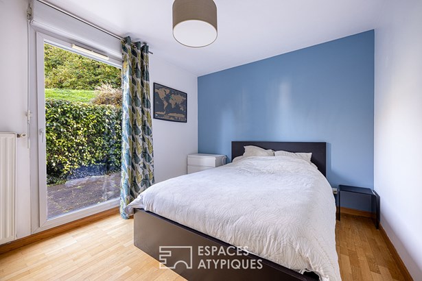 The private garden, a true extension of the living room, offers a peaceful living environment. It opens onto a wooded park reserved for the condominium. This unique property seduces with its dual-aspect layout, its meticulous features, and its rare exterior in Caluire. An ideal opportunity for those looking for a peaceful living space, in direct contact with nature while remaining connected to the city. Possibility of purchasing a double garage.